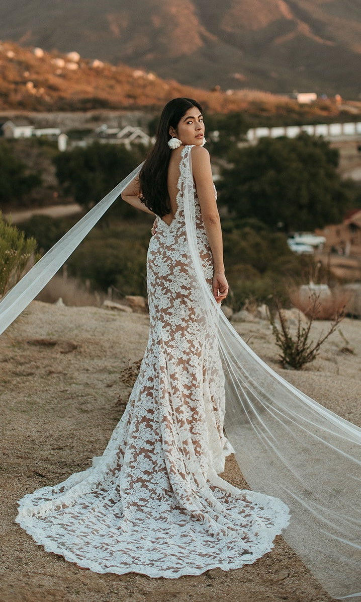ROMANTIC FRENCH CORDED LACE GOWN, DEEP V-NECKLINE WITH SEAM AT WAIST. FITTED SILHOUETTE, DELICATE EYELASH TRIM ADORNS THE LOW BACK LACE WEDDING GOWN, FULL SKIRT FLOWS INTO A DRAMATIC FLOOR SWEEPING TRAIN. DETACHABLE TULLE PANELS FLOAT OFF THE SHOULDERS AND DOWN TO THE FLOOR FOR ADDED DRAMATIC FLARE.