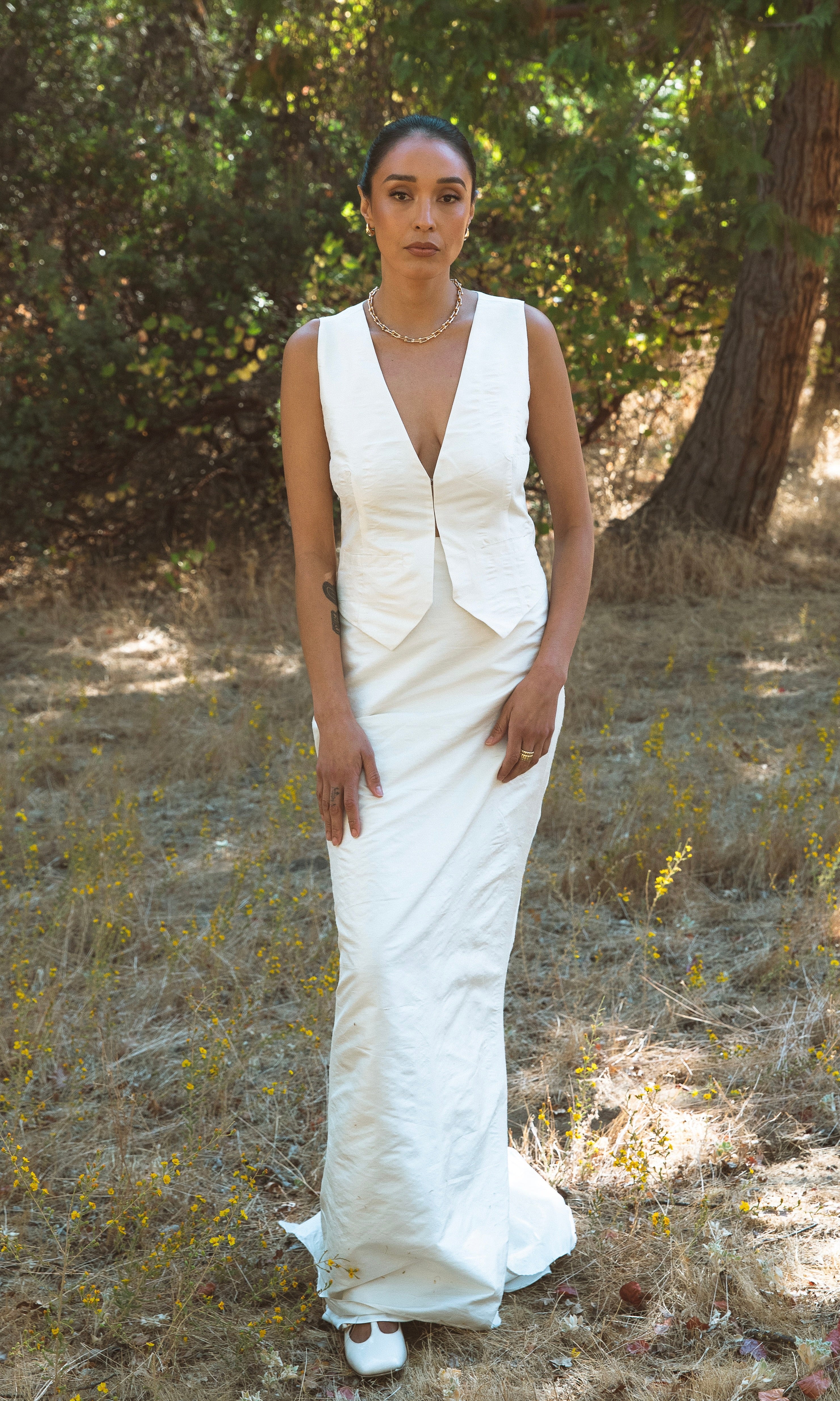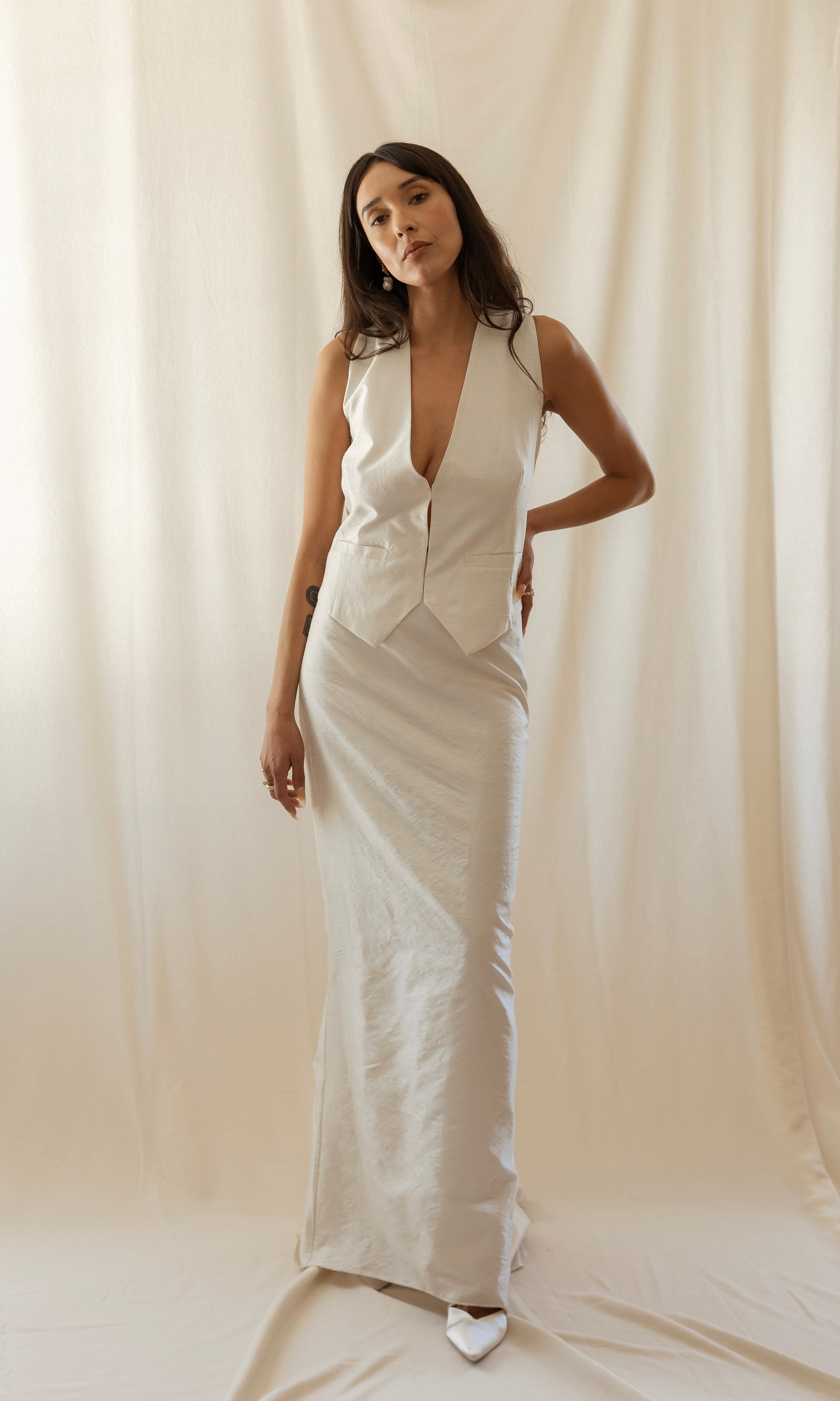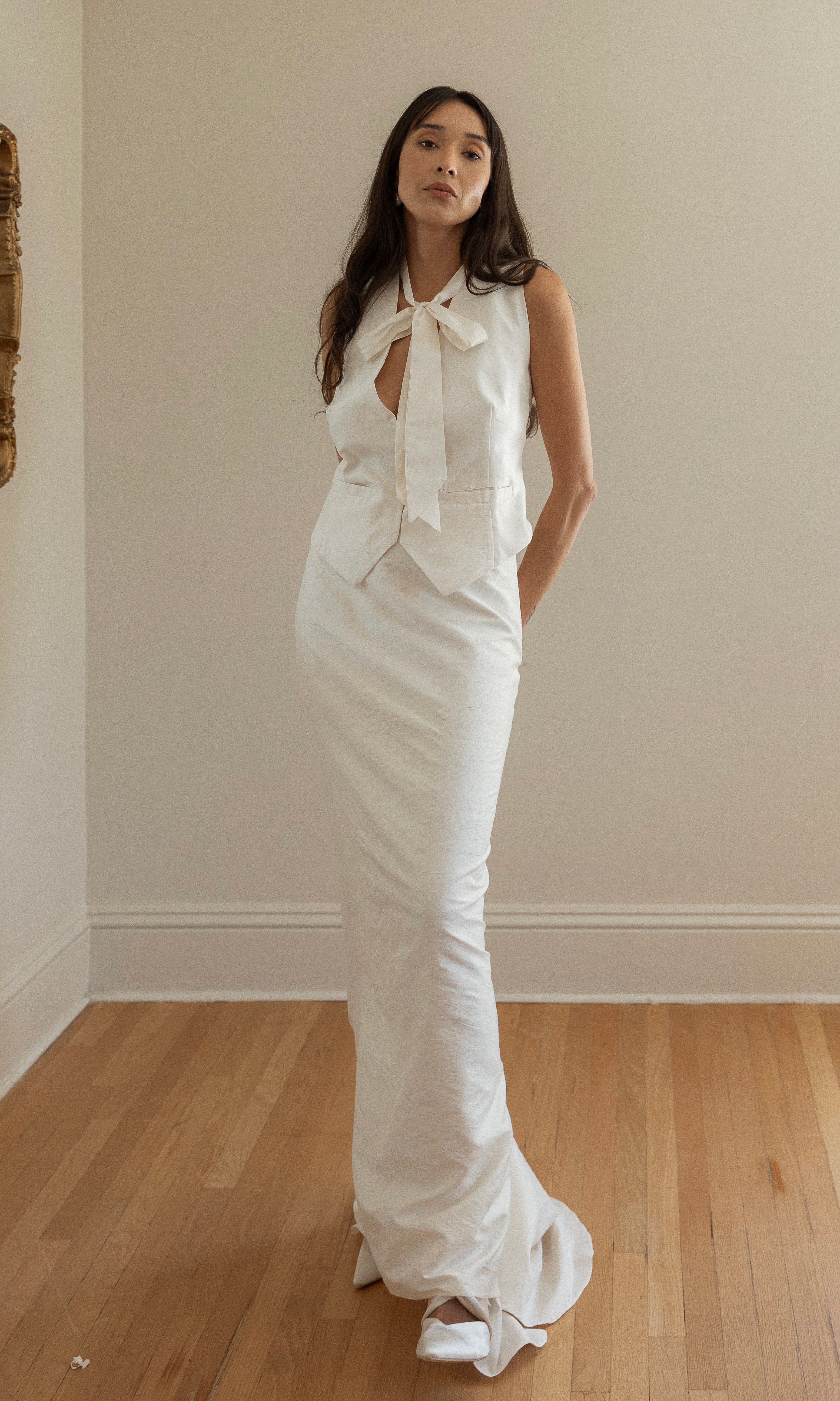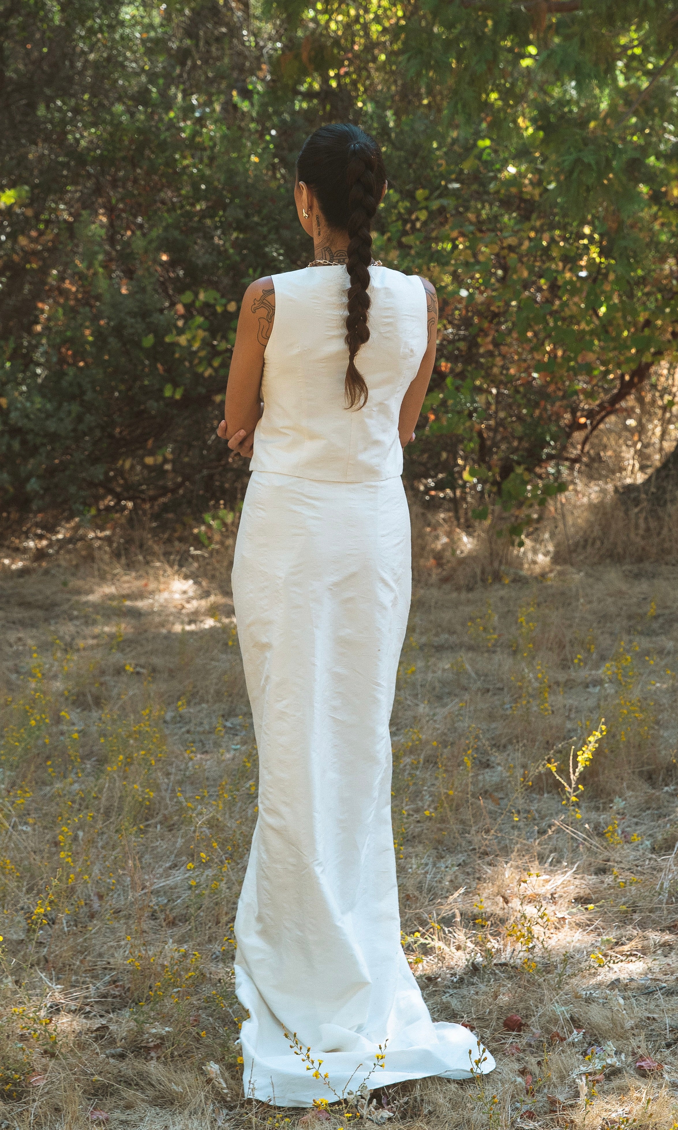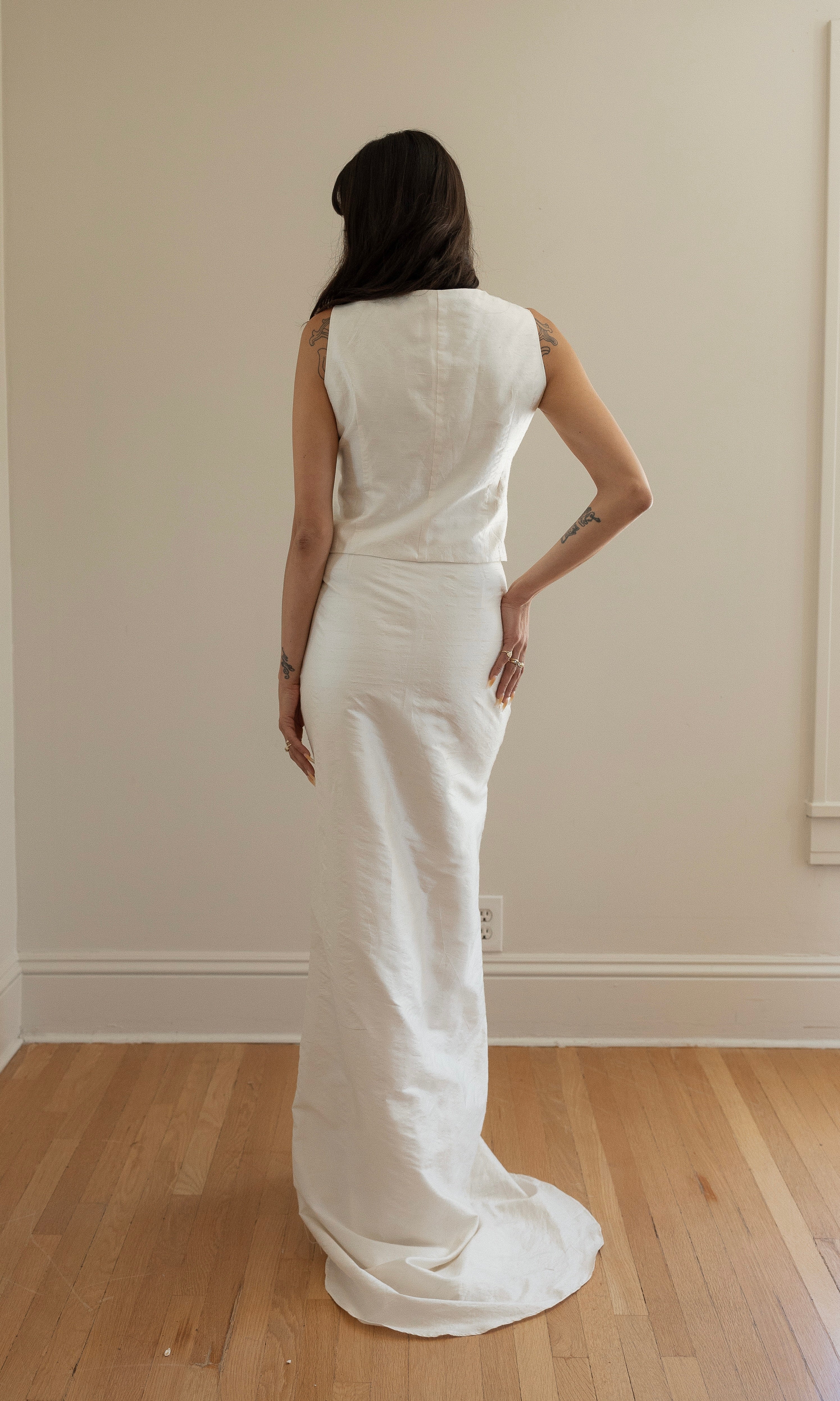 TAFFETA SILK VEST AND COLUMN SKIRT. SLIGHT TRAIN. "CASS" SUIT DRESS AVAILABLE FOR PURCHASE