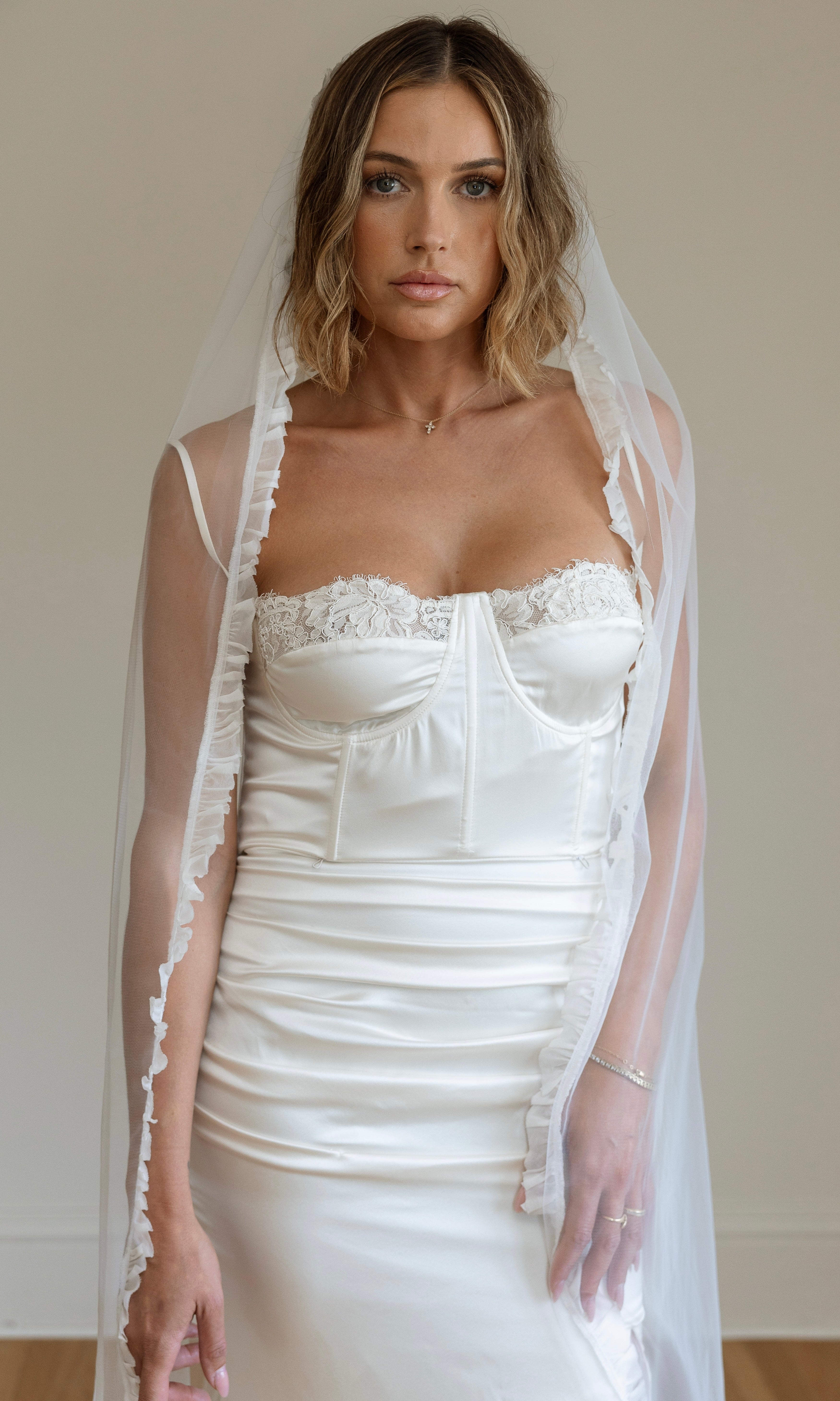 Introducing the Ada corset gown, a sophisticated choice with an unmistakeable air of luxuriousness. Crafted with corded lace trimmed cups and a skinny strap, and ruching at the hips for a breath-takingly flattering silhouette that's effortlessly chic. Gown can be ordered with our small or large cup size. PART OF OUR MAIDEN NAME COLLECTION
