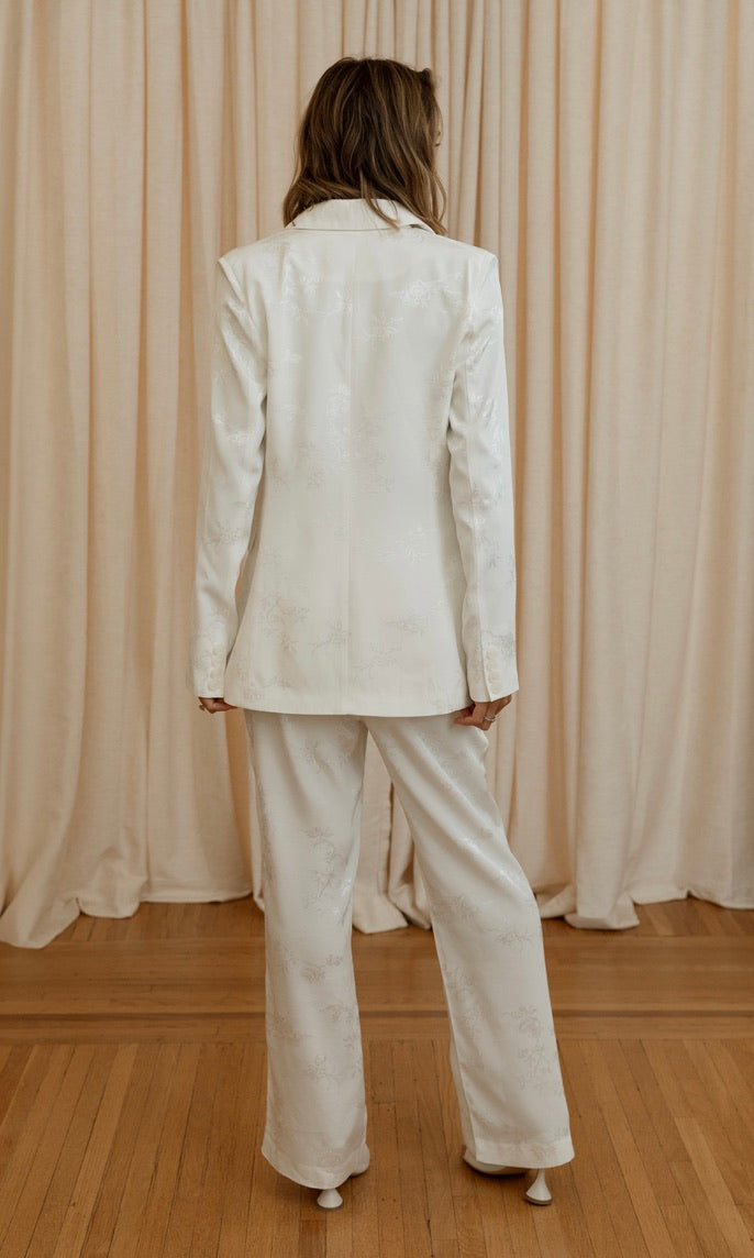 IVORY FLORAL JACQUARD BOHEMIAN BRIDAL PANT SUIT, LAPEL COLLAR BLAZER WITH LONG SLEEVES AND FRONT FLAP POCKETS, DOUBLE BACK VENT, FRONT BUTTON CLOSURE. MID-RISE CROPPED PANTS LINED WITH IVORY SATIN. ZIPPER AND BUTTON CLOSURE. WAIST MEASUREMENT ON SIZING CHART IS BASED ON MID RISE, NOT MEASURED AT NATURAL WAIST