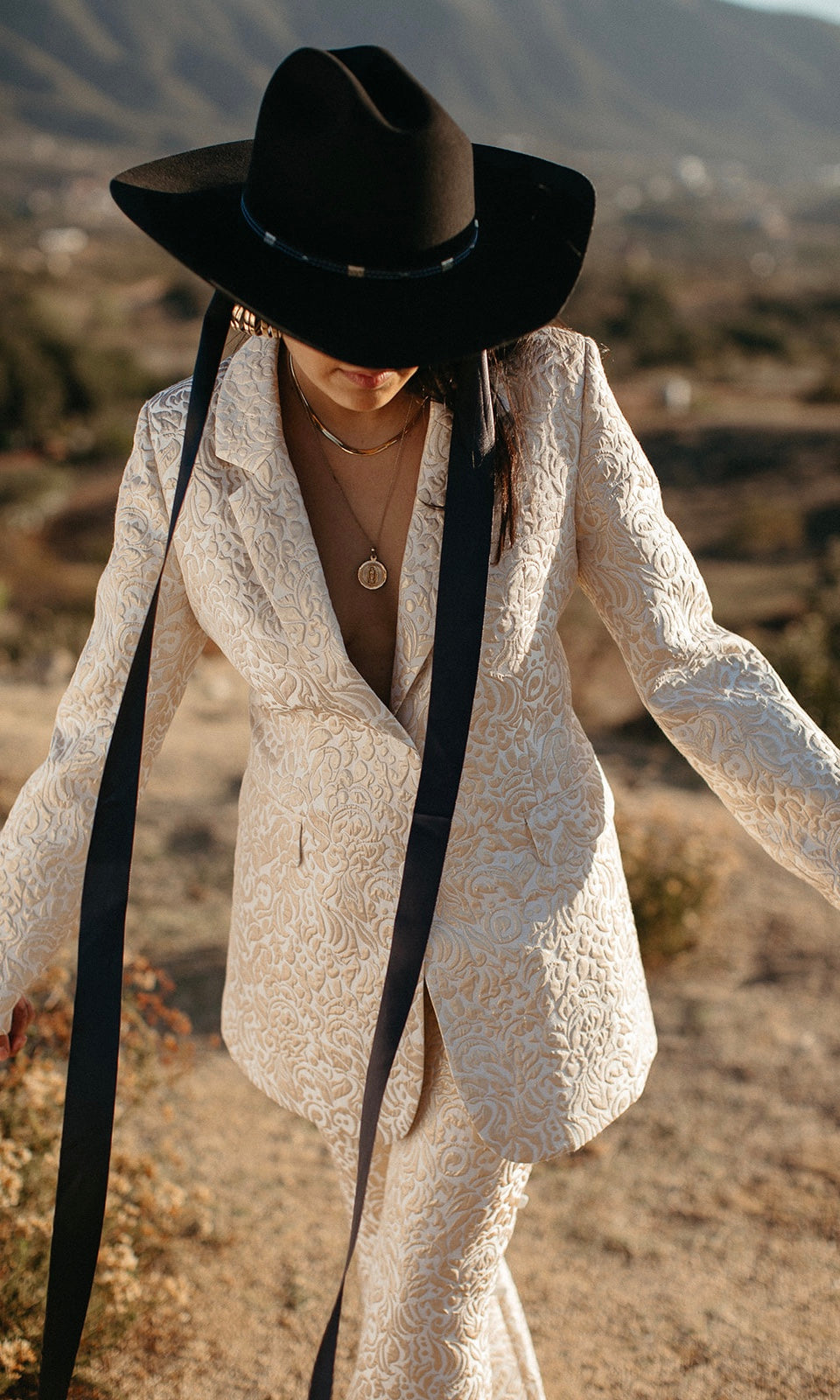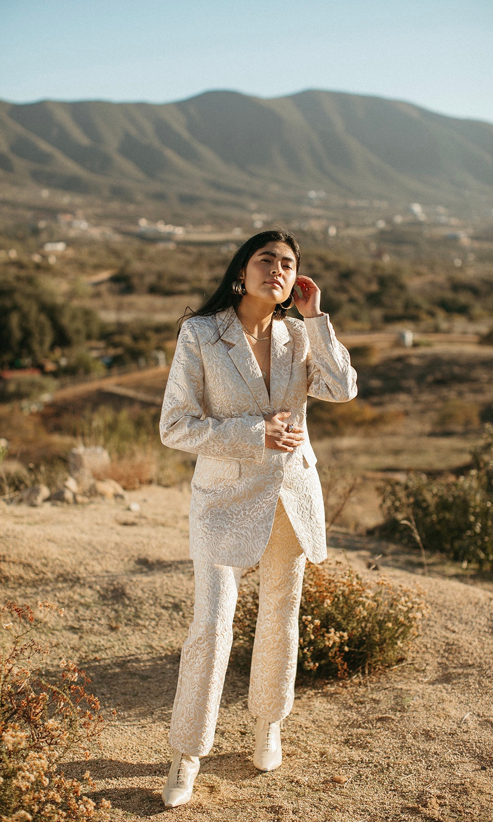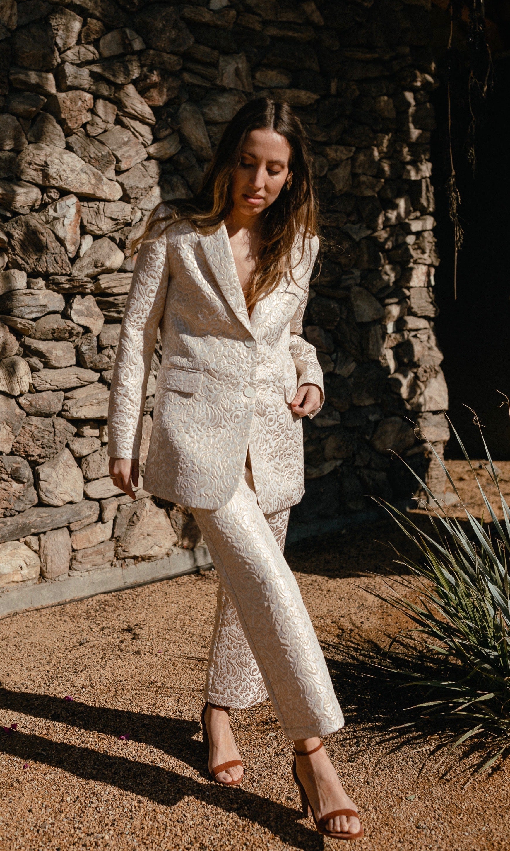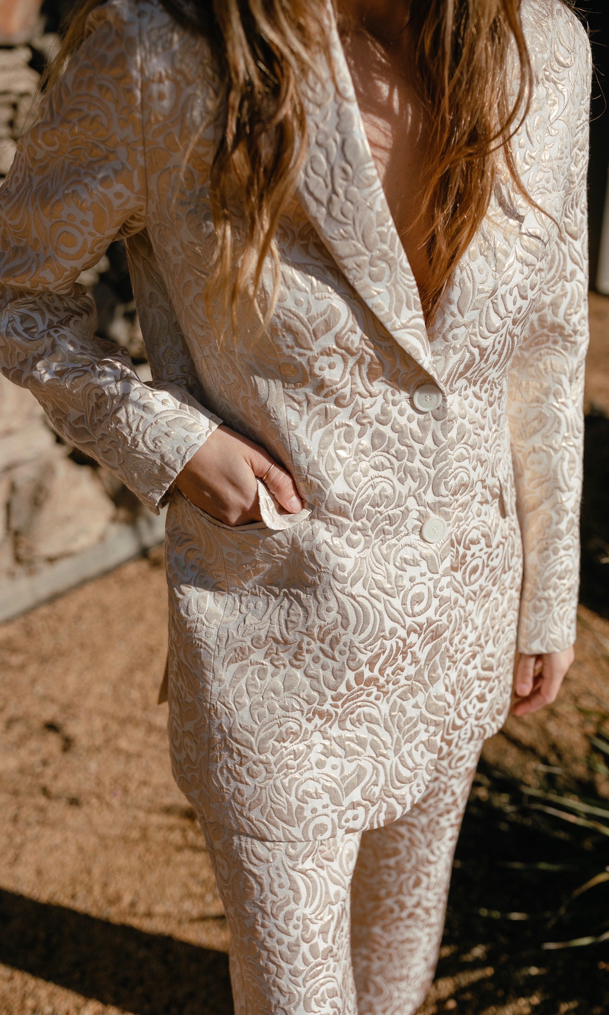 LAMÉ BROCADE GOLD BRIDAL PANT SUIT, LAPEL COLLAR BLAZER WITH LONG SLEEVES AND FRONT FLAP POCKETS, DOUBLE BACK VENT, FRONT GOLD BUTTON CLOSURE. MID-RISE CROPPED PANTS LINED WITH IVORY SATIN. ZIPPER AND BUTTON CLOSURE. VIEW THE SUIT IN IVORY SILK, "MARGAUX". WAIST MEASUREMENT ON SIZING CHART IS BASED ON MID RISE, NOT MEASURED AT NATURAL WAIST
