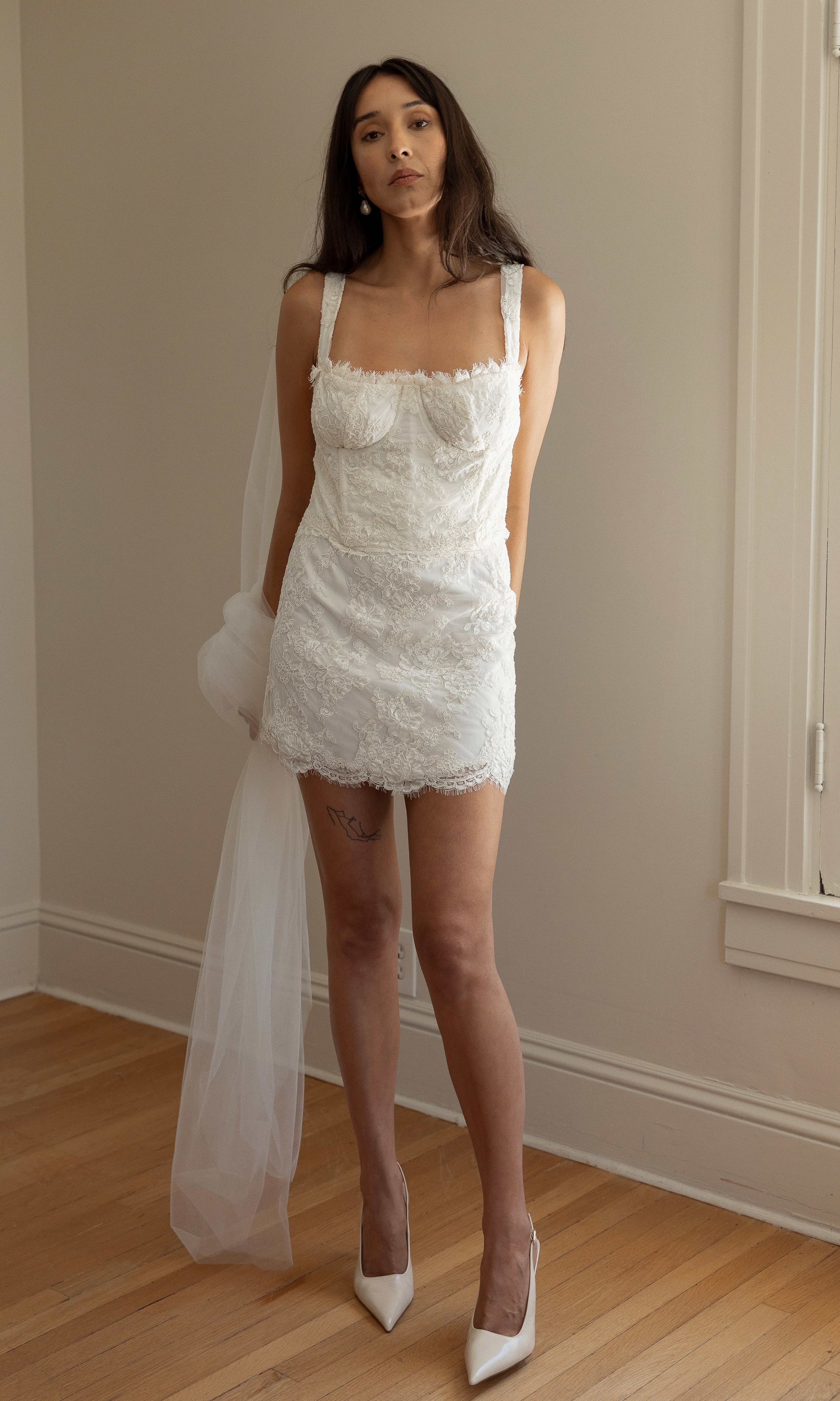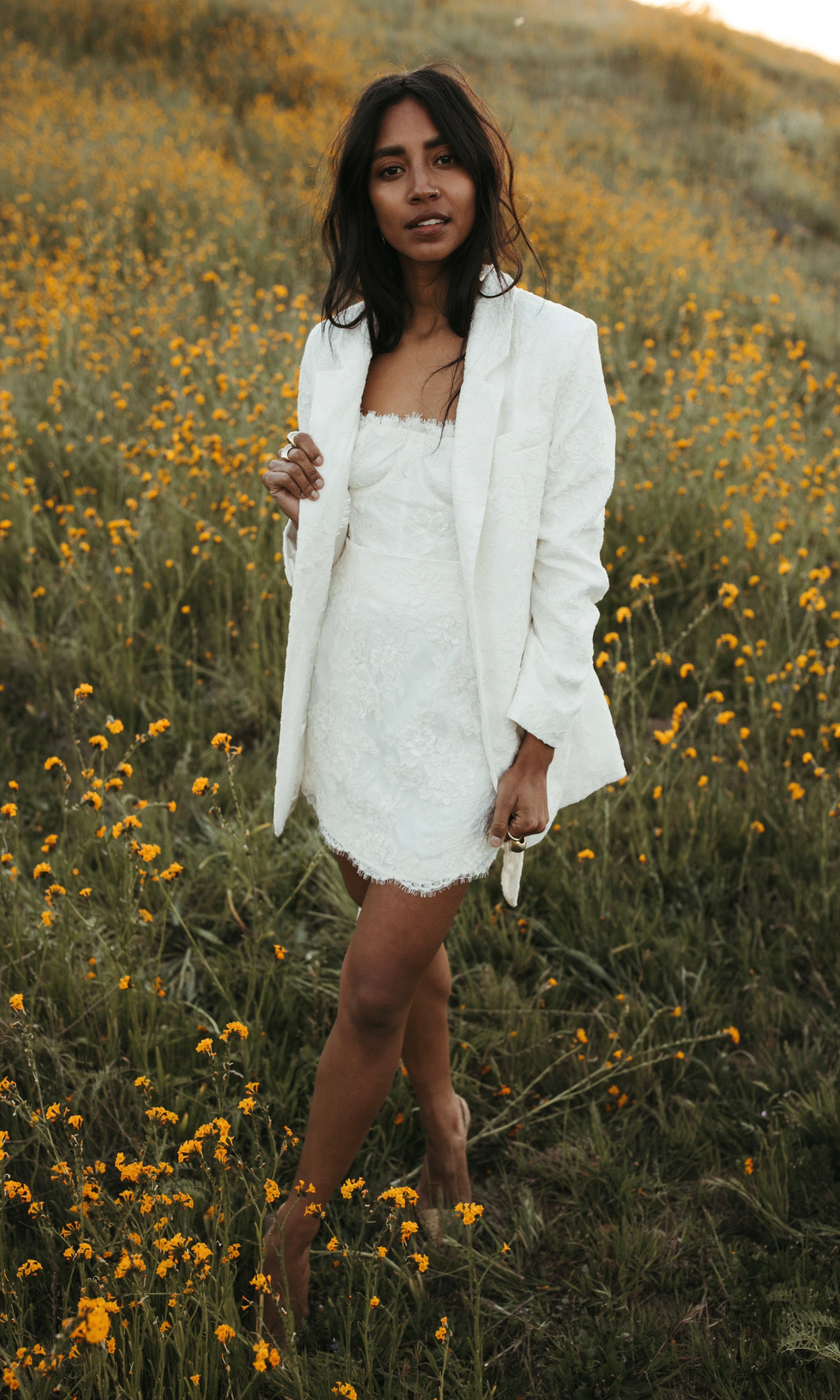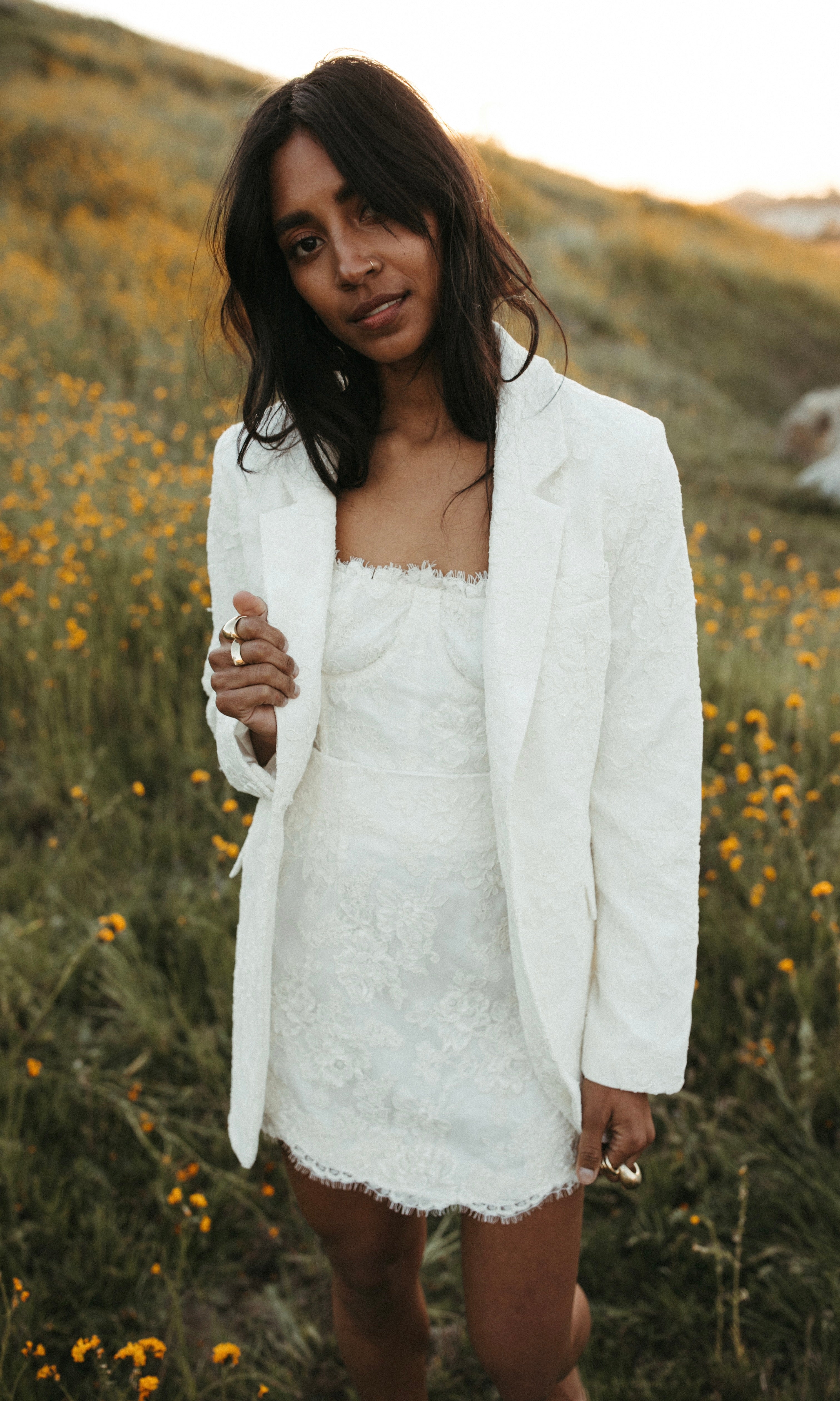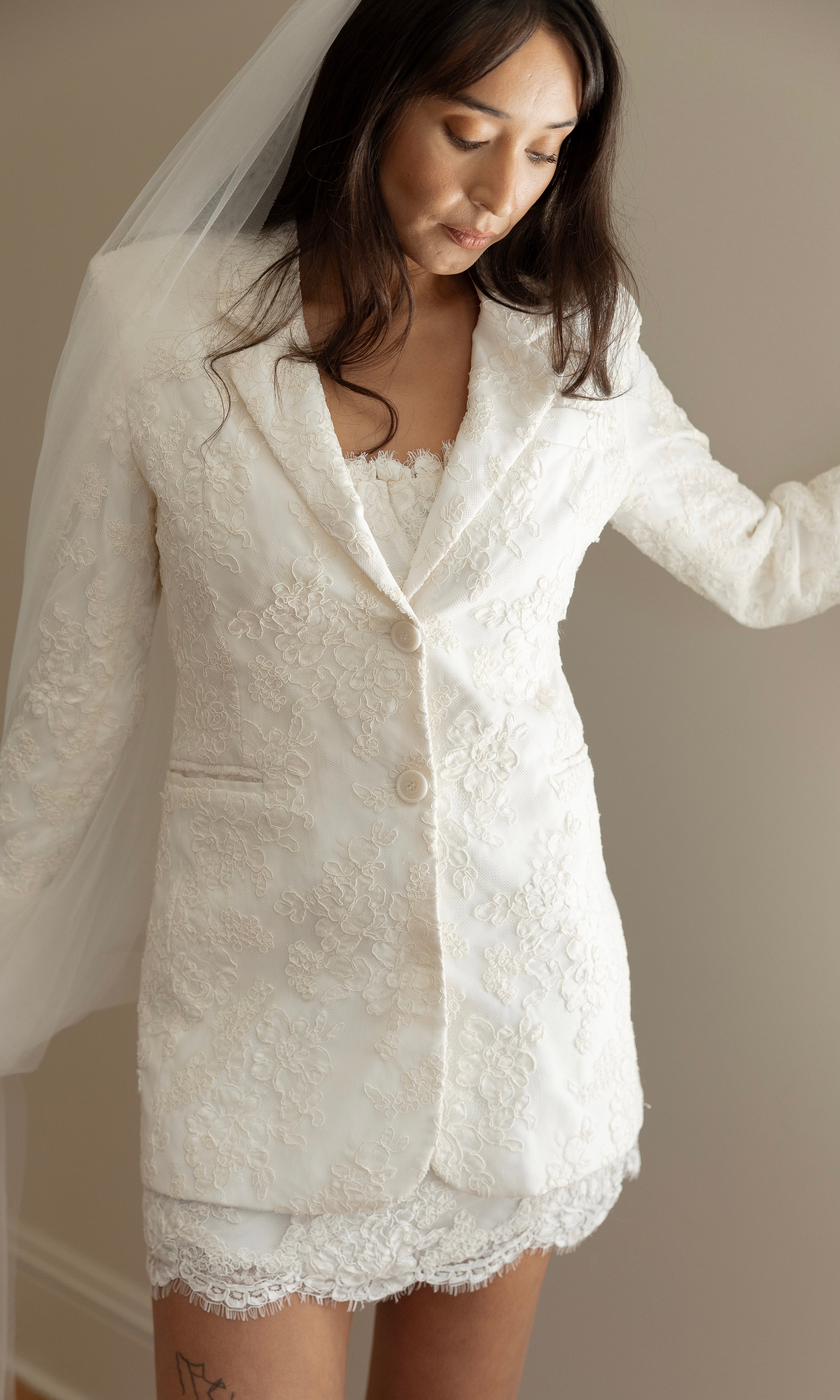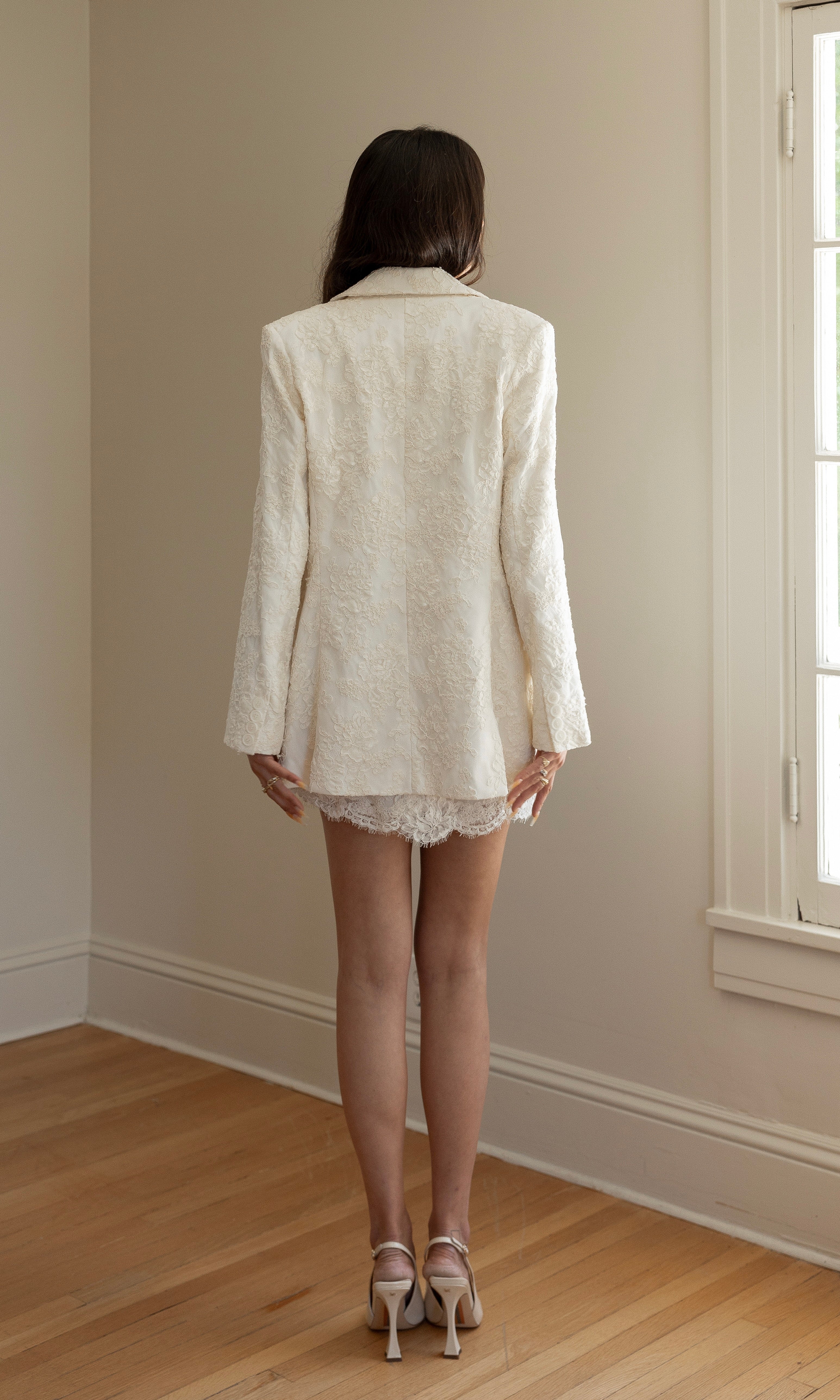 Do yourself a favor. The ‘ledger’ is our version of a three pice suit, comprised of an oversized blazer, cropped corset-like top, and mini skirt made in our elevated floral French Lace. Top has a fitted bodice with boning and cups. adjustable straps that drape down the back in an elongated manner.