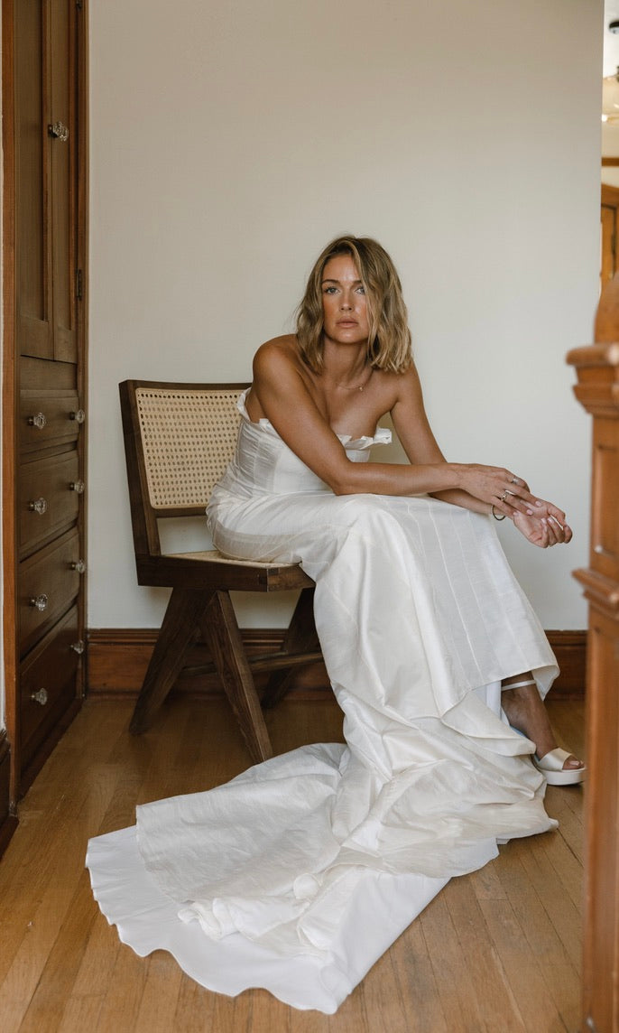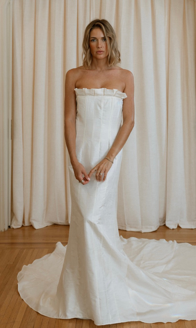 ROMANTIC FRENCH CORDED LACE BUSTIER GOWN, STRAPLESS AND FITTED BODICE WITH UNDERWIRE AND BONING. RUFFLED LACE DETAIL ALONG THE BUST, DETACHABLE LONG UNLINED SLEEVES WITH FIT AND FLARE SKIRT. ORNATE PEARL BUTTON DETAILING DOWN THE BACK, FRONT AND BACK PROMINENT PRINCESS SEAMS. FULL SKIRT FLOWS INTO AN ELONGATED TRAIN. ALSO, SEE SISTER STYLES ‘ROSS‘ & ‘LEO'.