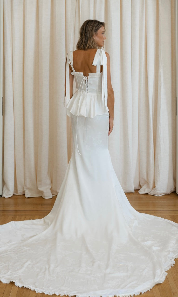 ROMANTIC FRENCH CORDED LACE BUSTIER GOWN, STRAPLESS AND FITTED BODICE WITH UNDERWIRE AND BONING. RUFFLED LACE DETAIL ALONG THE BUST, DETACHABLE LONG UNLINED SLEEVES WITH FIT AND FLARE SKIRT. ORNATE PEARL BUTTON DETAILING DOWN THE BACK, FRONT AND BACK PROMINENT PRINCESS SEAMS. FULL SKIRT FLOWS INTO AN ELONGATED TRAIN. ALSO, SEE SISTER STYLES ‘ROSS‘ & ‘LEO'.