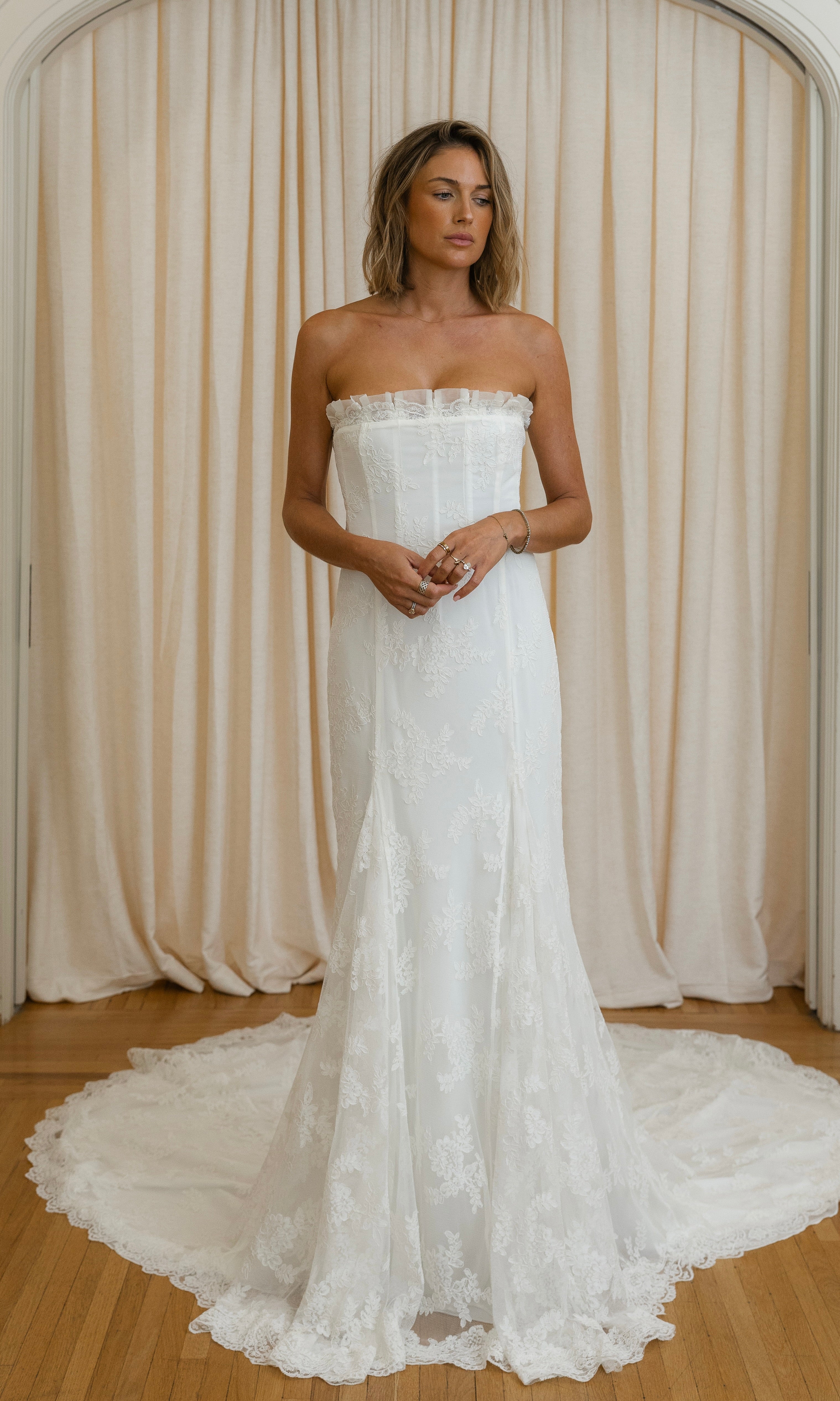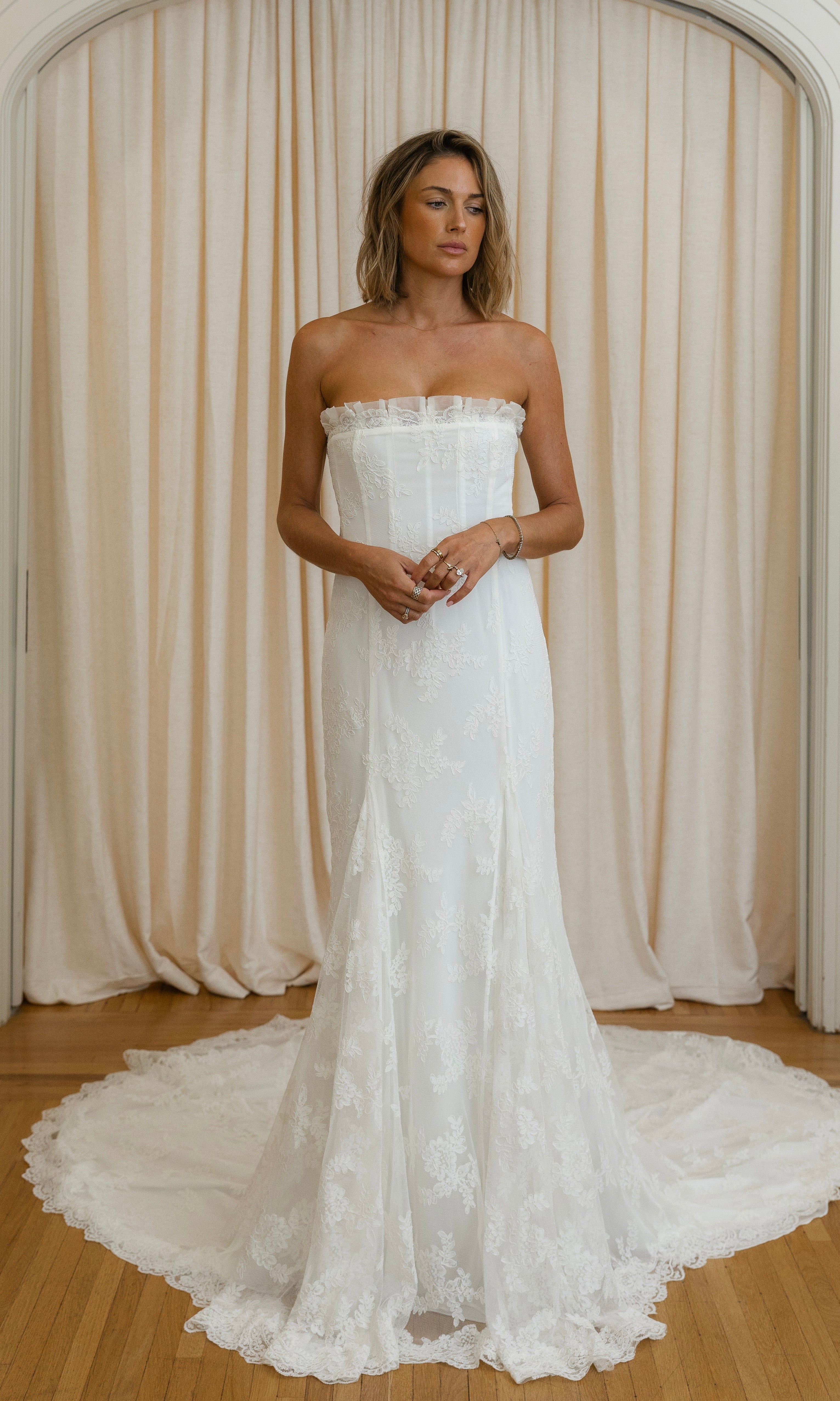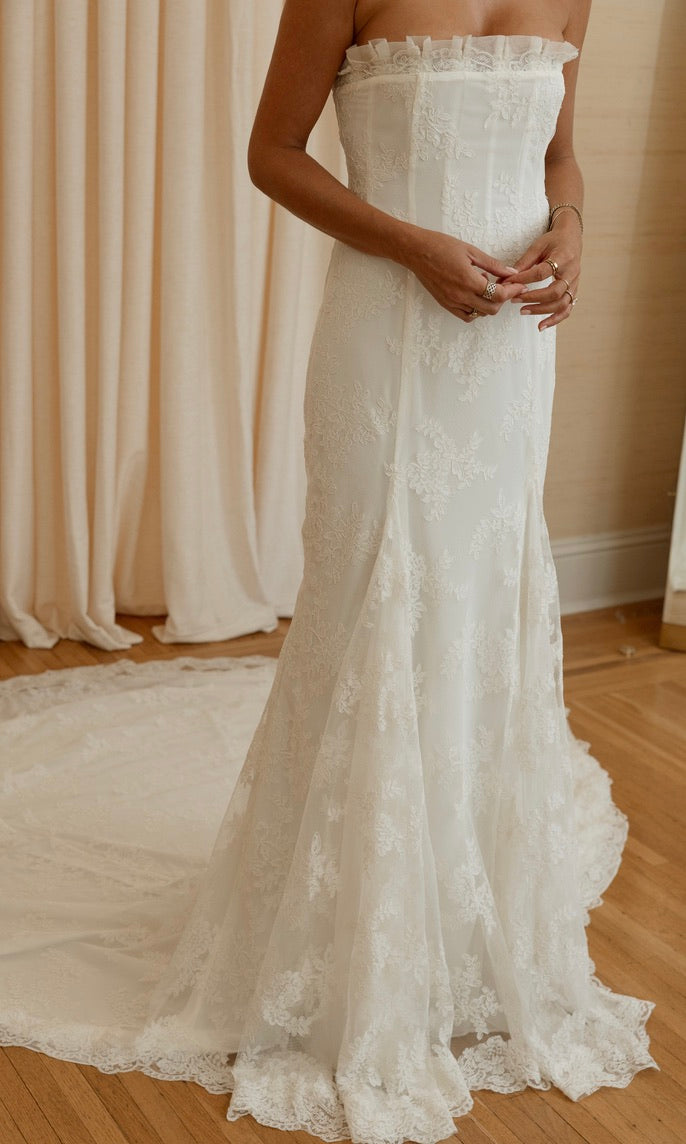 ROMANTIC FRENCH CORDED LACE BUSTIER GOWN, STRAPLESS AND FITTED BODICE WITH UNDERWIRE AND BONING. RUFFLED LACE DETAIL ALONG THE BUST, DETACHABLE LONG UNLINED SLEEVES WITH FIT AND FLARE SKIRT. ORNATE PEARL BUTTON DETAILING DOWN THE BACK, FRONT AND BACK PROMINENT PRINCESS SEAMS. FULL SKIRT FLOWS INTO AN ELONGATED TRAIN. ALSO, SEE SISTER STYLES ‘ROSS‘ & ‘LEO'.