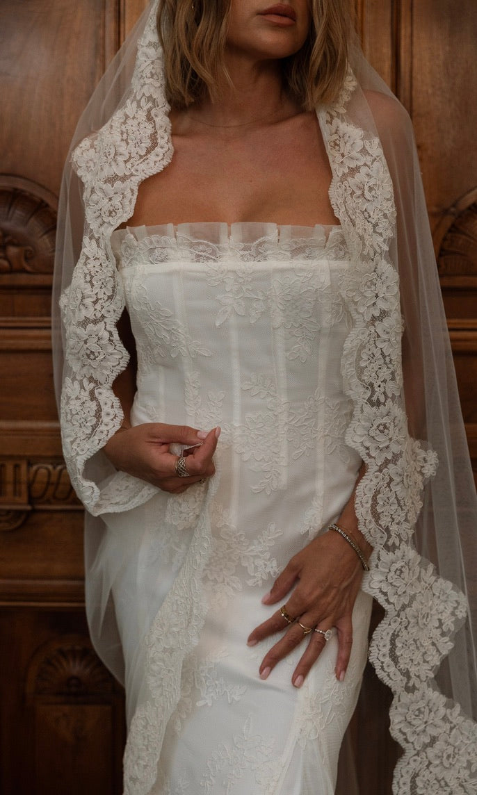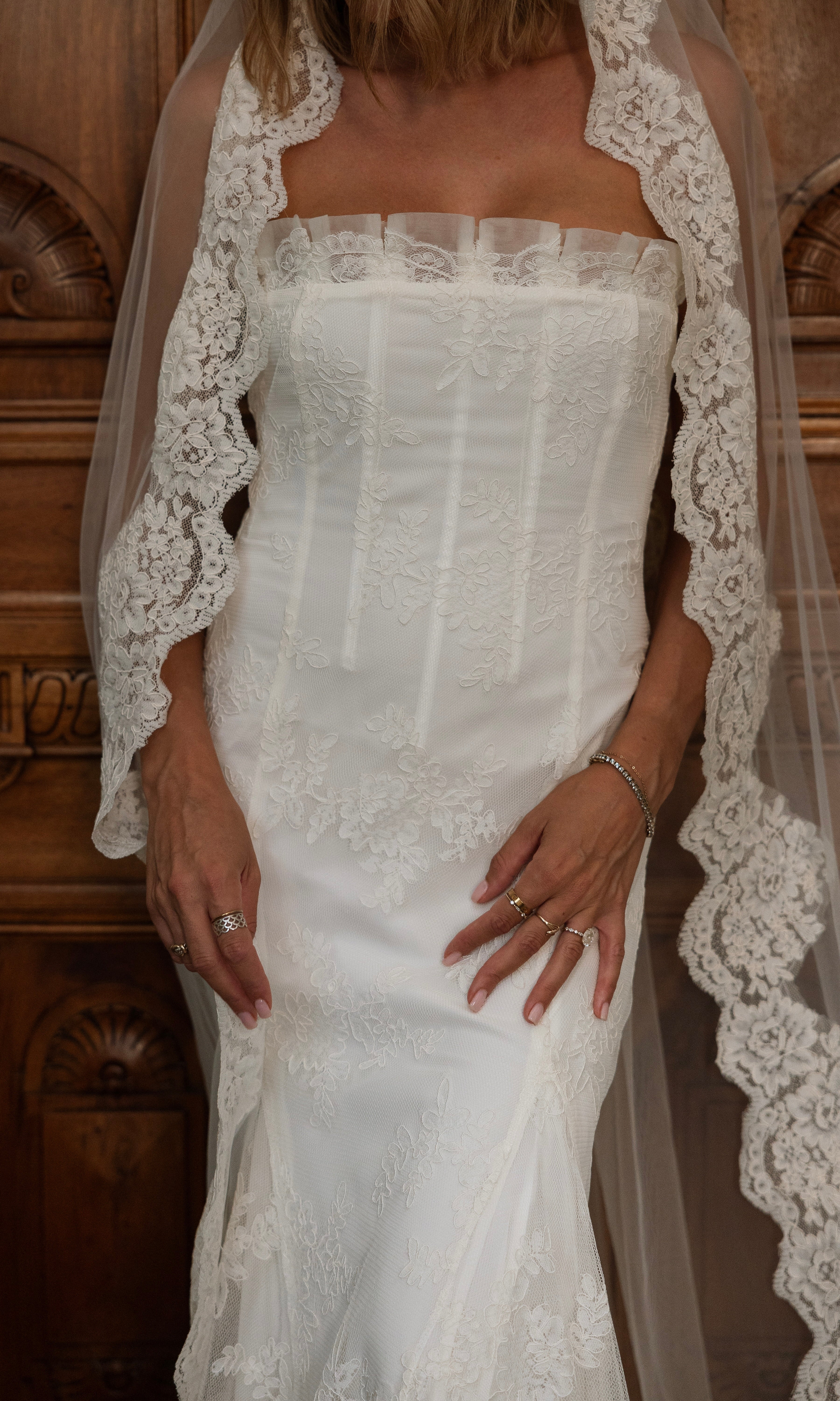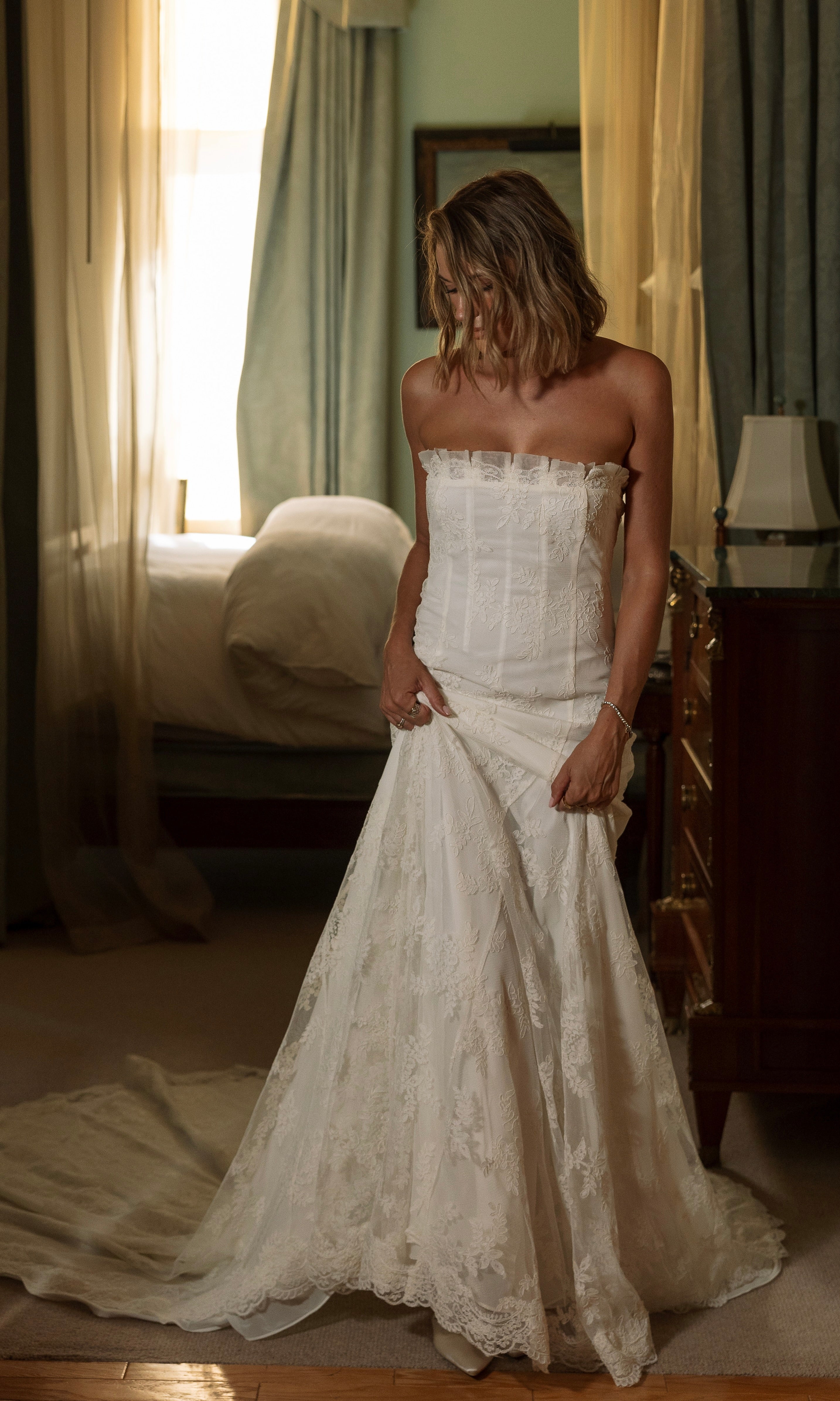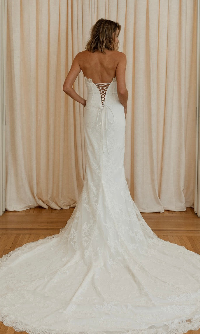 ROMANTIC FRENCH CORDED LACE BUSTIER GOWN, STRAPLESS AND FITTED BODICE WITH UNDERWIRE AND BONING. RUFFLED LACE DETAIL ALONG THE BUST, DETACHABLE LONG UNLINED SLEEVES WITH FIT AND FLARE SKIRT. ORNATE PEARL BUTTON DETAILING DOWN THE BACK, FRONT AND BACK PROMINENT PRINCESS SEAMS. FULL SKIRT FLOWS INTO AN ELONGATED TRAIN. ALSO, SEE SISTER STYLES ‘ROSS‘ & ‘LEO'.