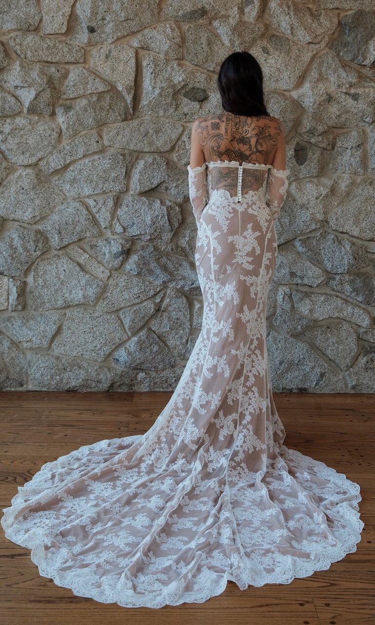 ROMANTIC FRENCH CORDED LACE BUSTIER GOWN, STRAPLESS AND FITTED BODICE WITH UNDERWIRE AND BONING. RUFFLED LACE DETAIL ALONG THE BUST, DETACHABLE LONG UNLINED SLEEVES WITH FIT AND FLARE SKIRT. ORNATE PEARL BUTTON DETAILING DOWN THE BACK, FRONT AND BACK PROMINENT PRINCESS SEAMS. FULL SKIRT FLOWS INTO AN ELONGATED TRAIN. ALSO, SEE SISTER STYLES ‘ROSS‘ & ‘LEO'.