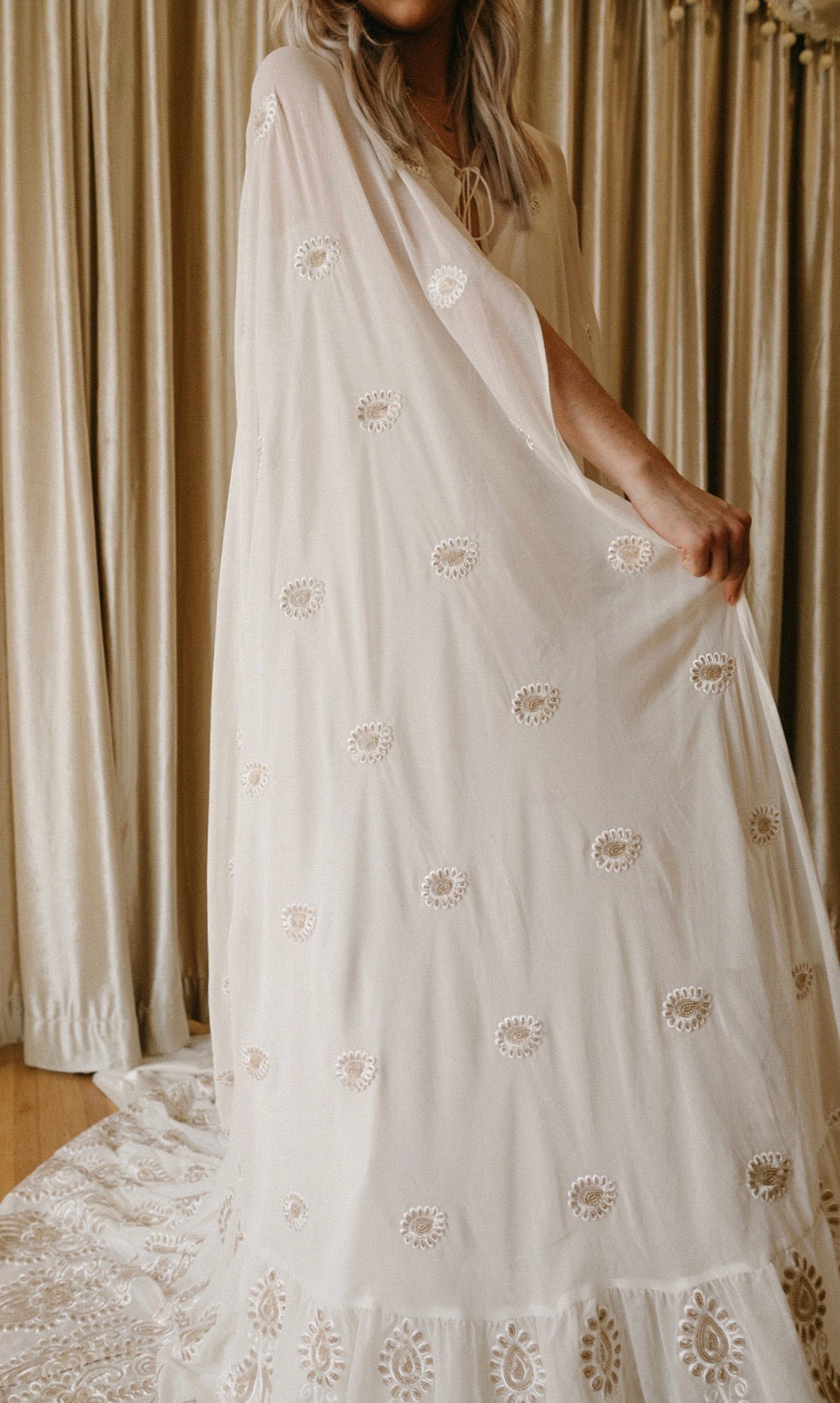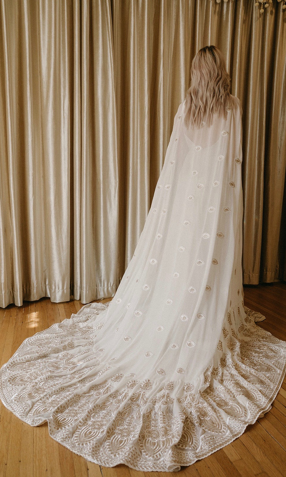 Dramatic champagne gold sequin bridal cape. Elegant design embroidered onto ivory chiffon. Show stopping accessory brings an ethereal richness to your bridal or bridesmaid look. Orders have a 5 week turn around from order to ship