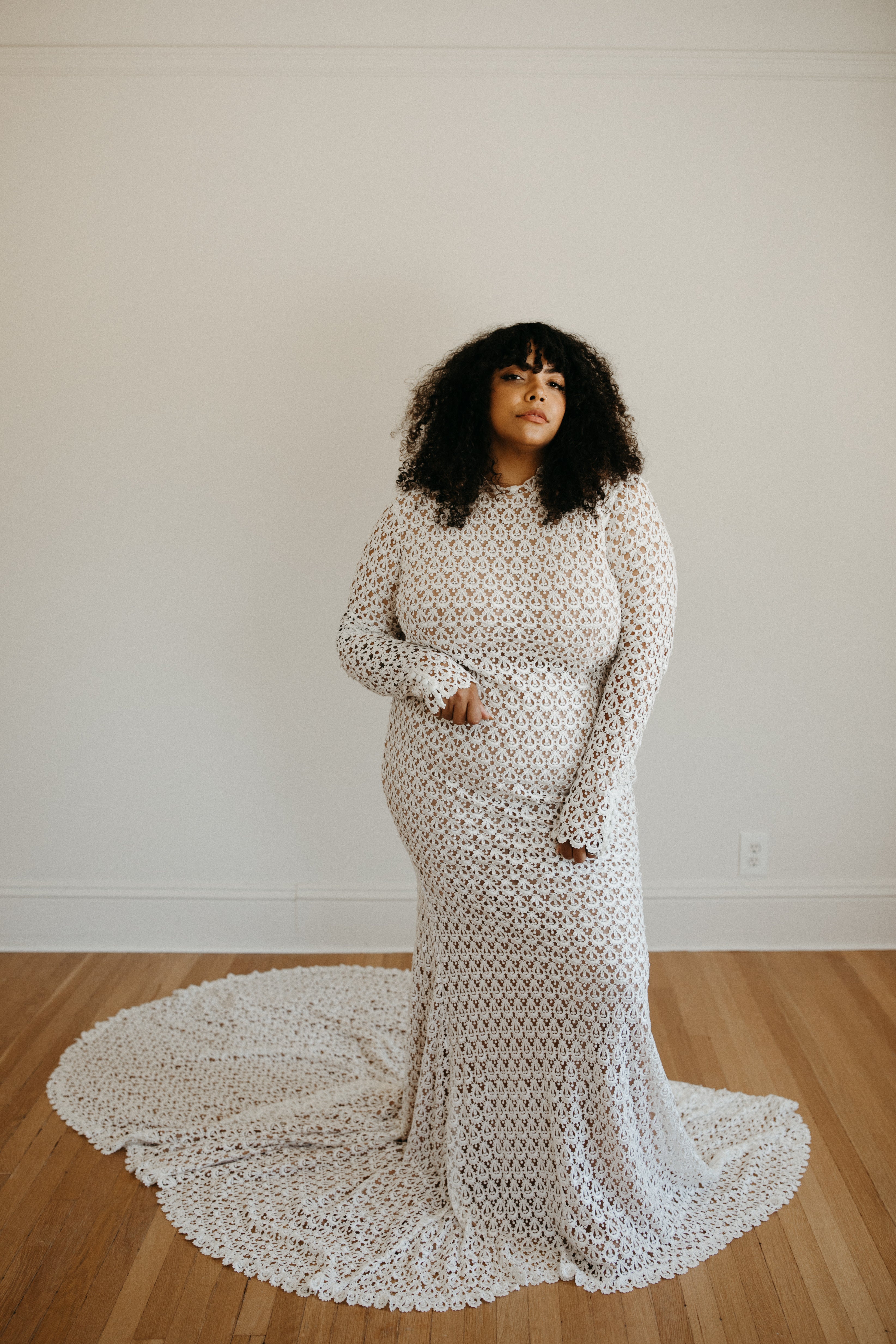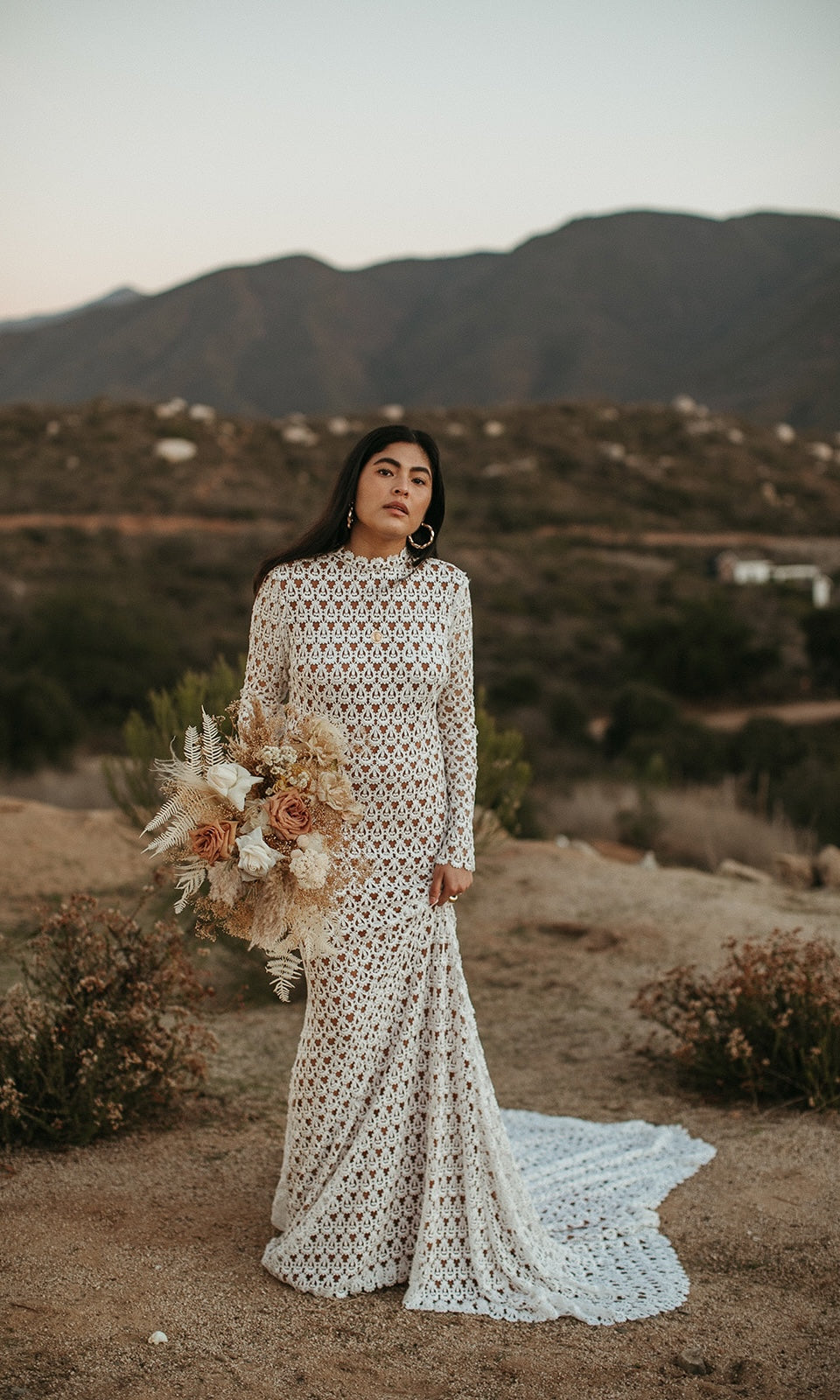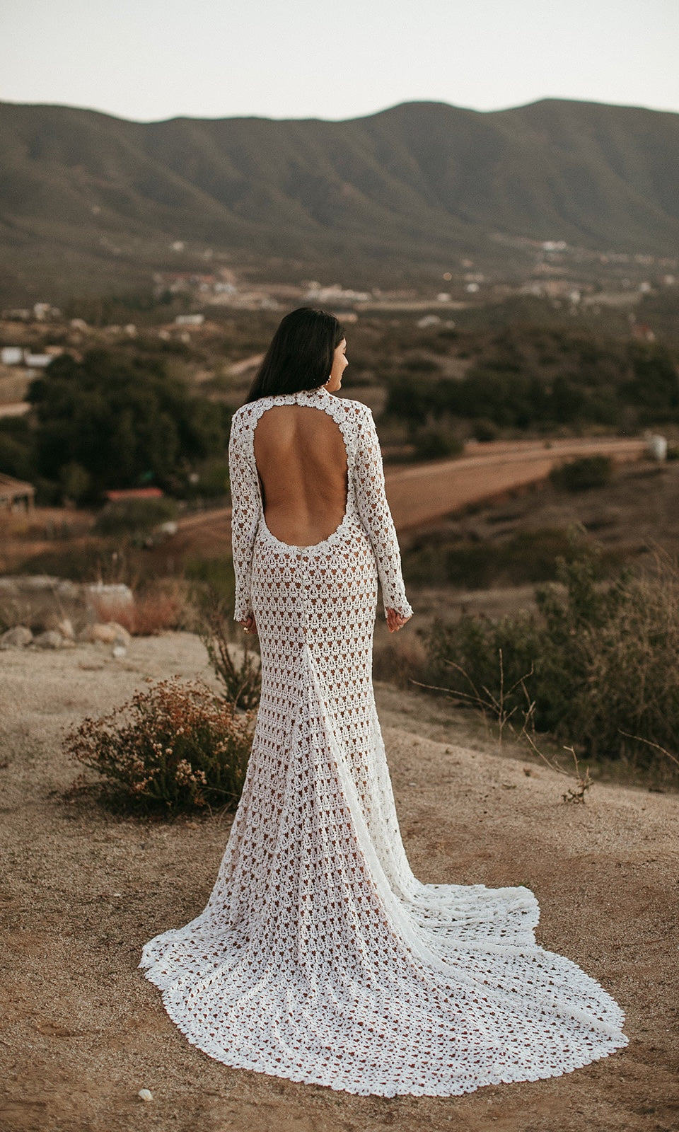 ELEGANT CROCHET LACE BOHEMIAN BACKLESS WEDDING GOWN WITH UNLINED LONG SLEEVES AND HIGH NECK. FITTED BODICE WITH FIT AND FLARE SKIRT. OPEN BACK LINED WITH LACE TRIM DETAIL. SKIRT FLOWS OUT TO A FULL SWEEPING TRAIN. SATIN COVERED BUTTON DETAIL AT THE BACK OF NECK AND AT WRISTS. ALSO, SEE CAP SLEEVE SISTER STYLE ‘SLOANE’.