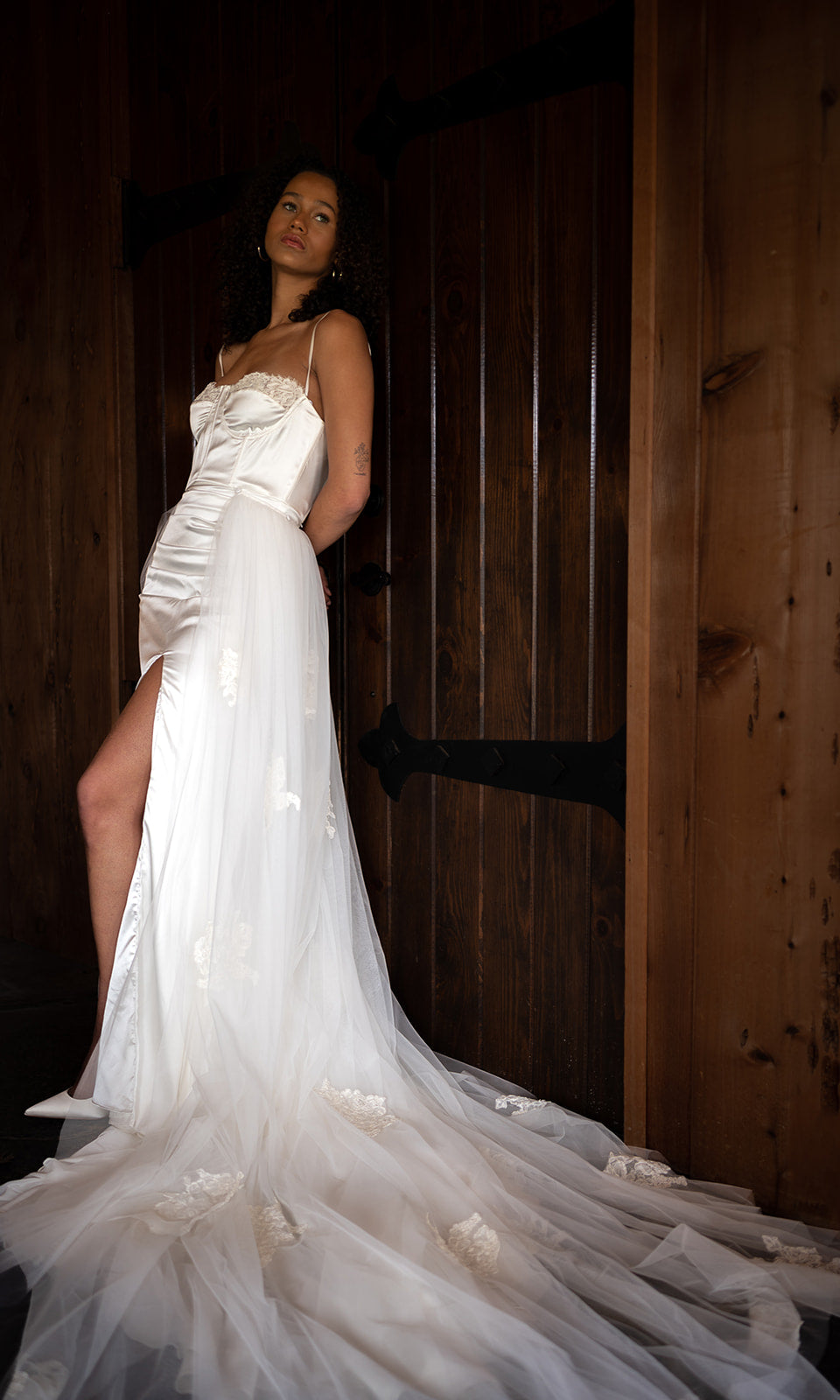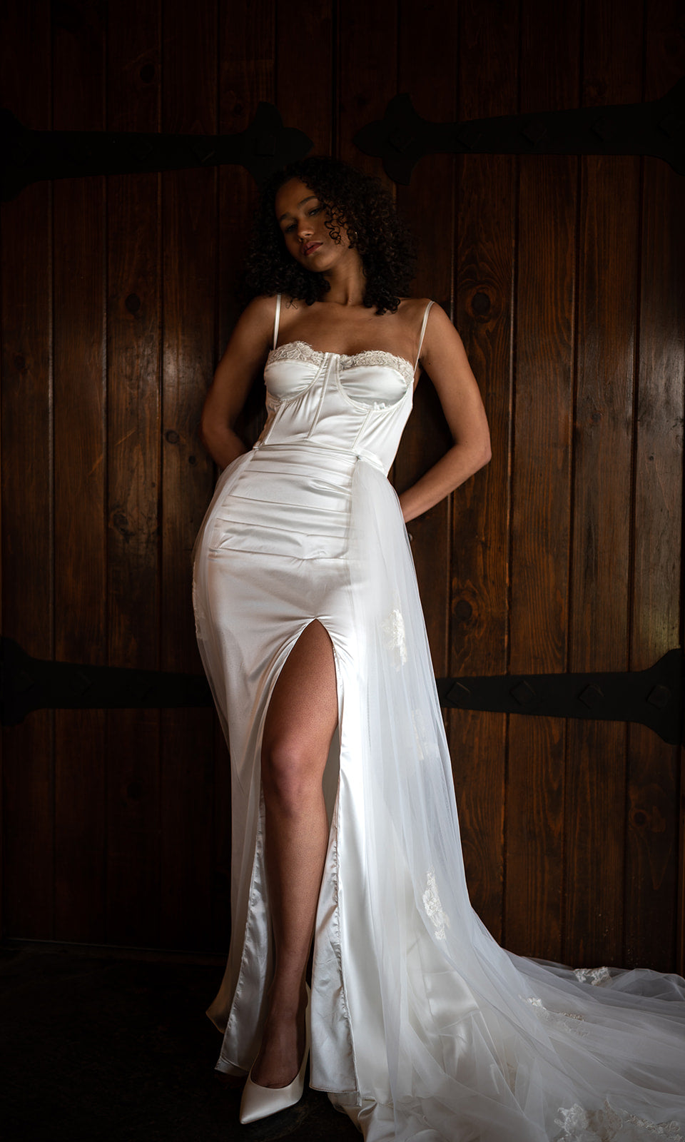Find out where you can try on our gowns on our retailers and trunk shows pages. If there is not a retailer near you, we’d love to send you the gown to try on at home.