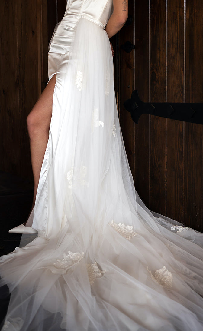 Dazzle in our Davis overskirt, a whimsical yet refined tulle overskirt adorned with delicate Corded French lace detail. Perfect for adding a fun and flirty flair to our "Gloria" Gown or "Toni" Mini Dress
