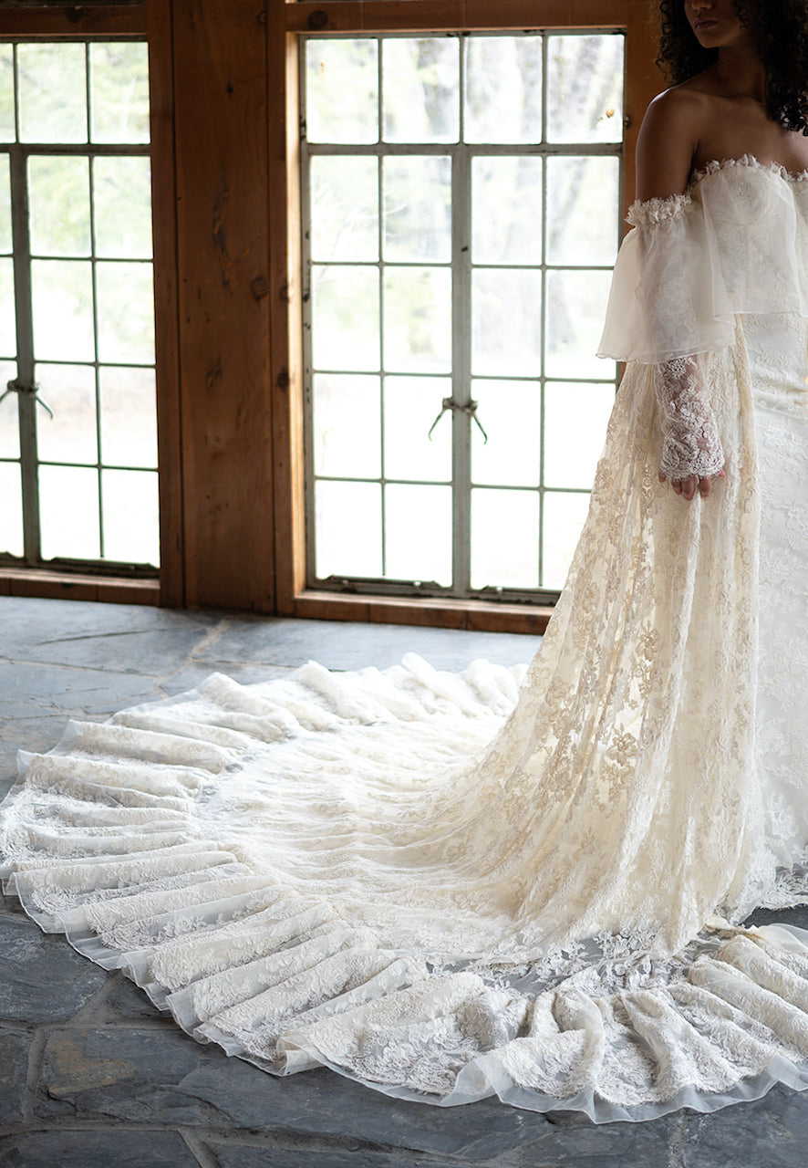 Indulge in the refined sophistication of the Lindy Overskirt. Crafted with lavish French corded lace, this detachable overskirt exudes luxury with its graceful ruffled hem and timeless elegance. An exquisite pairing to our "Emmaline" Gown