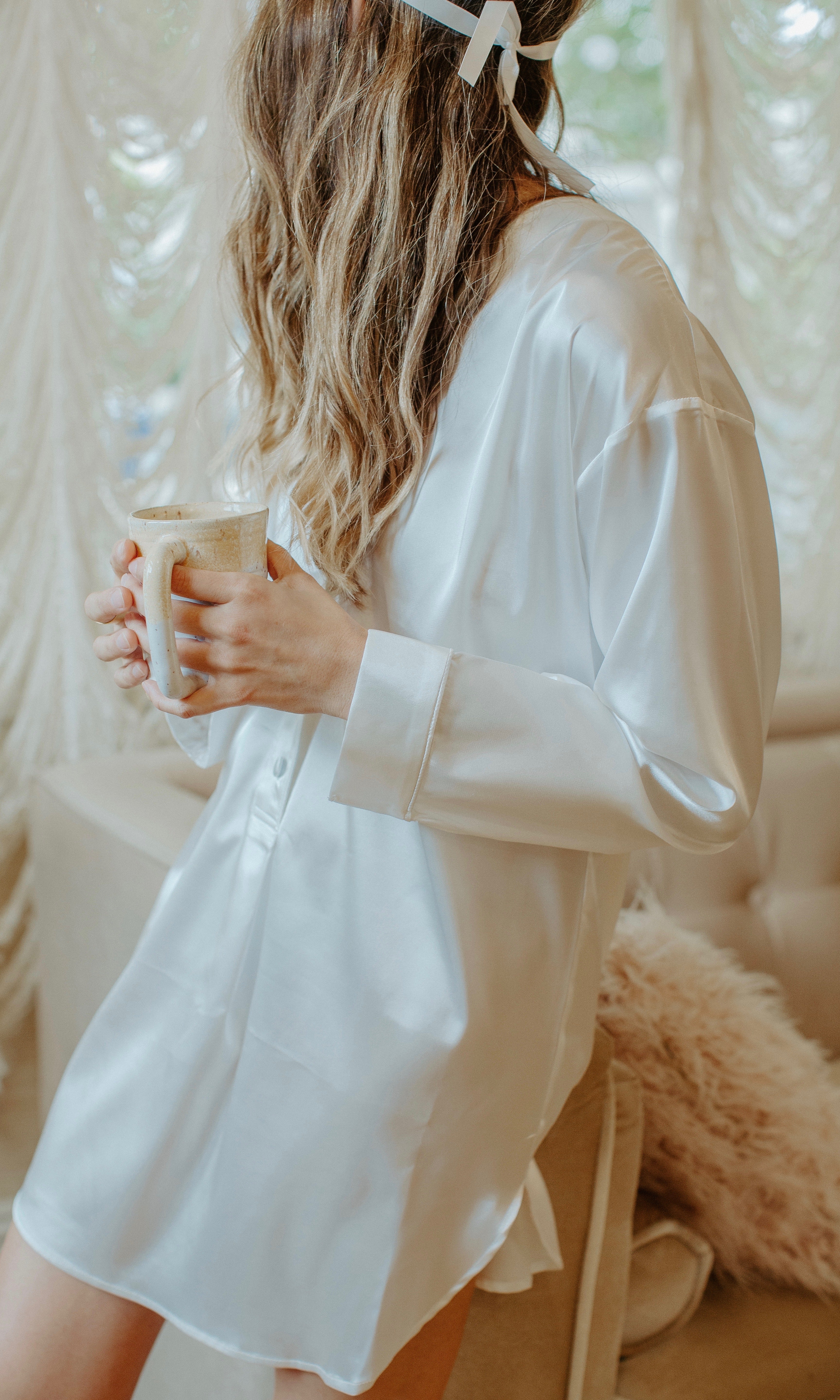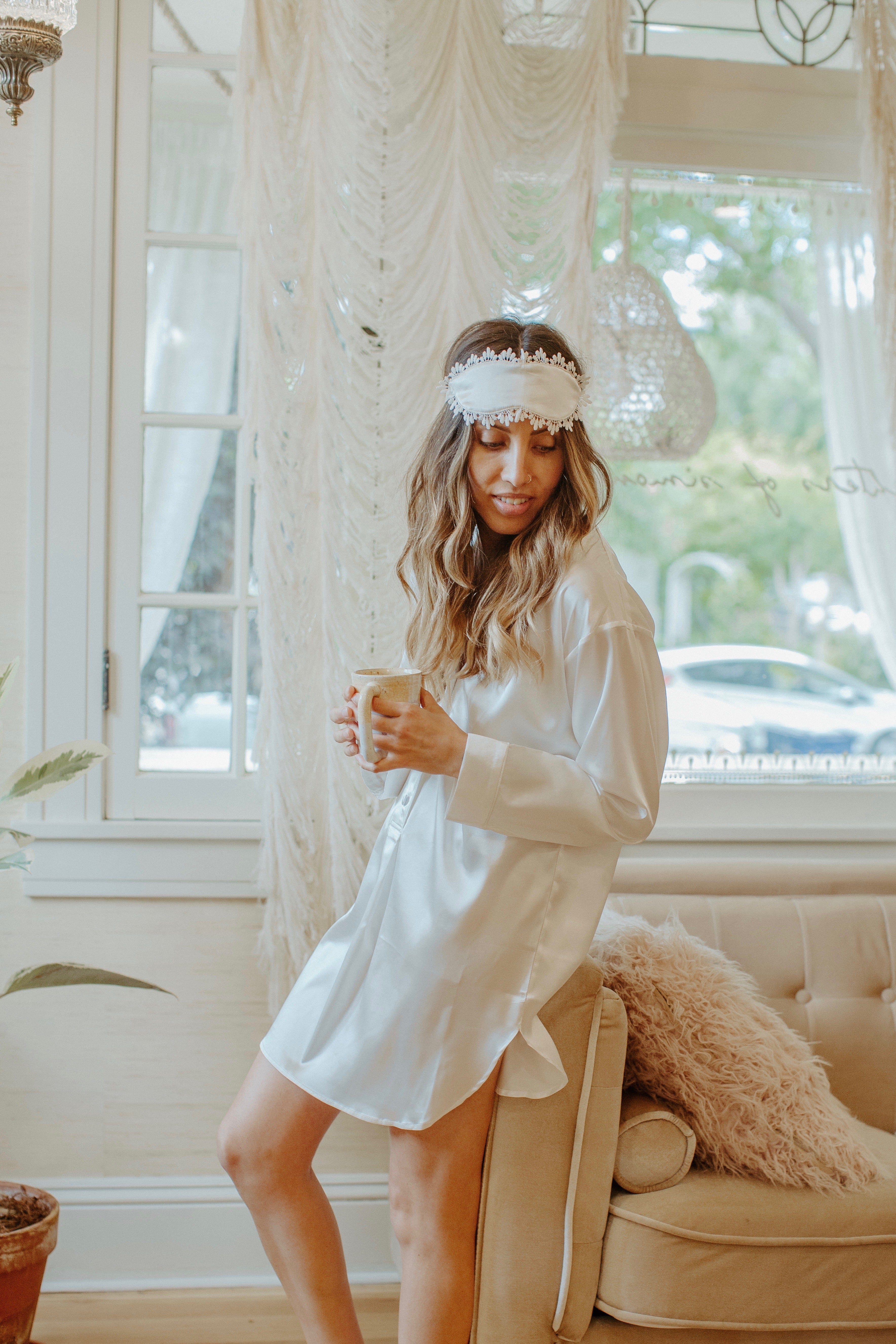 Luxe Ivory Satin Sleep Shirt with matching "Elyse" Sleep Mask. The ivory Satin Sleep Shirt makes a perfect gift for the bride or bridesmaid. A getting ready staple for the big day for wear it as an added comfort while she waits for the day to come! Toss it in it's own travel pouch and take it along for the big day.5 week turn around time from order to ship. Measurements