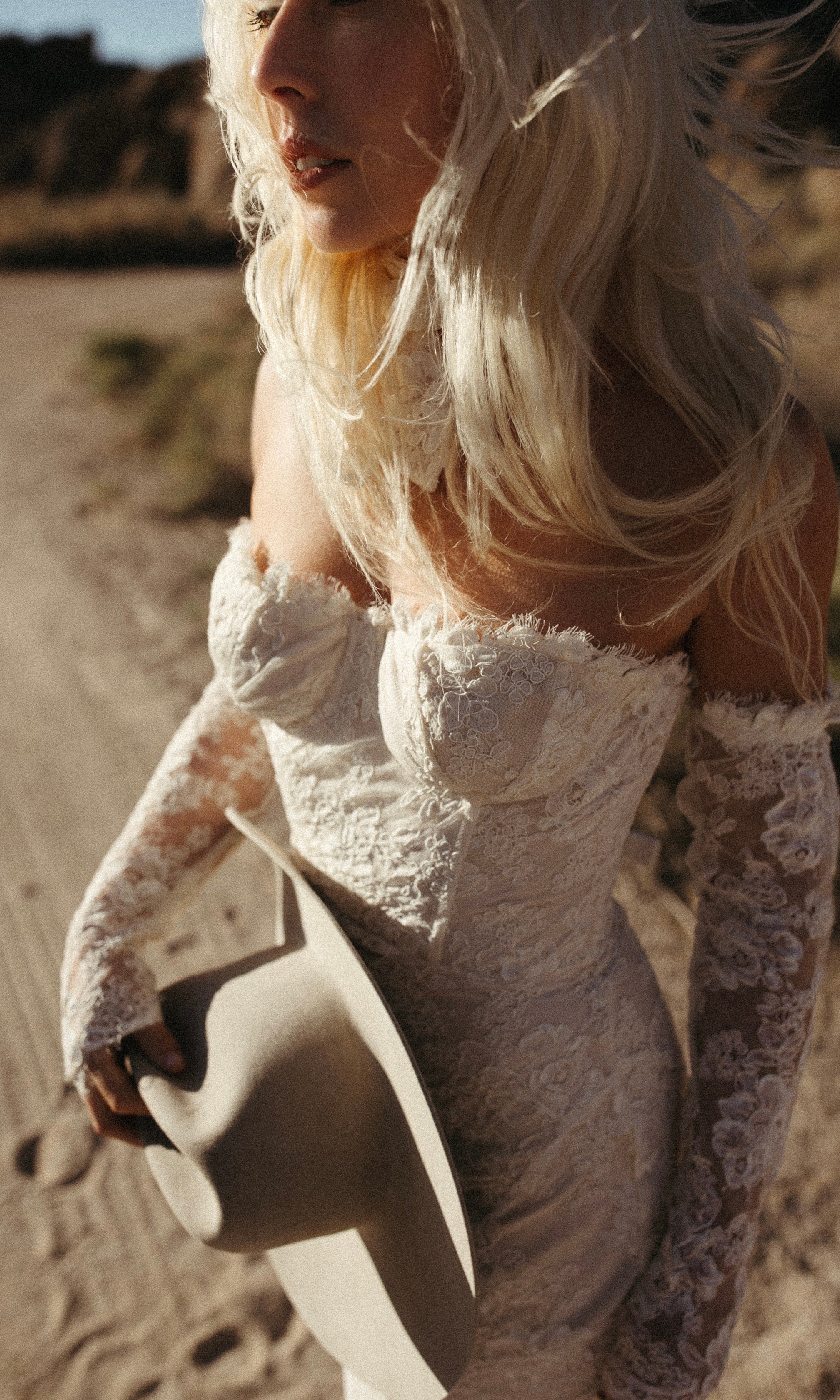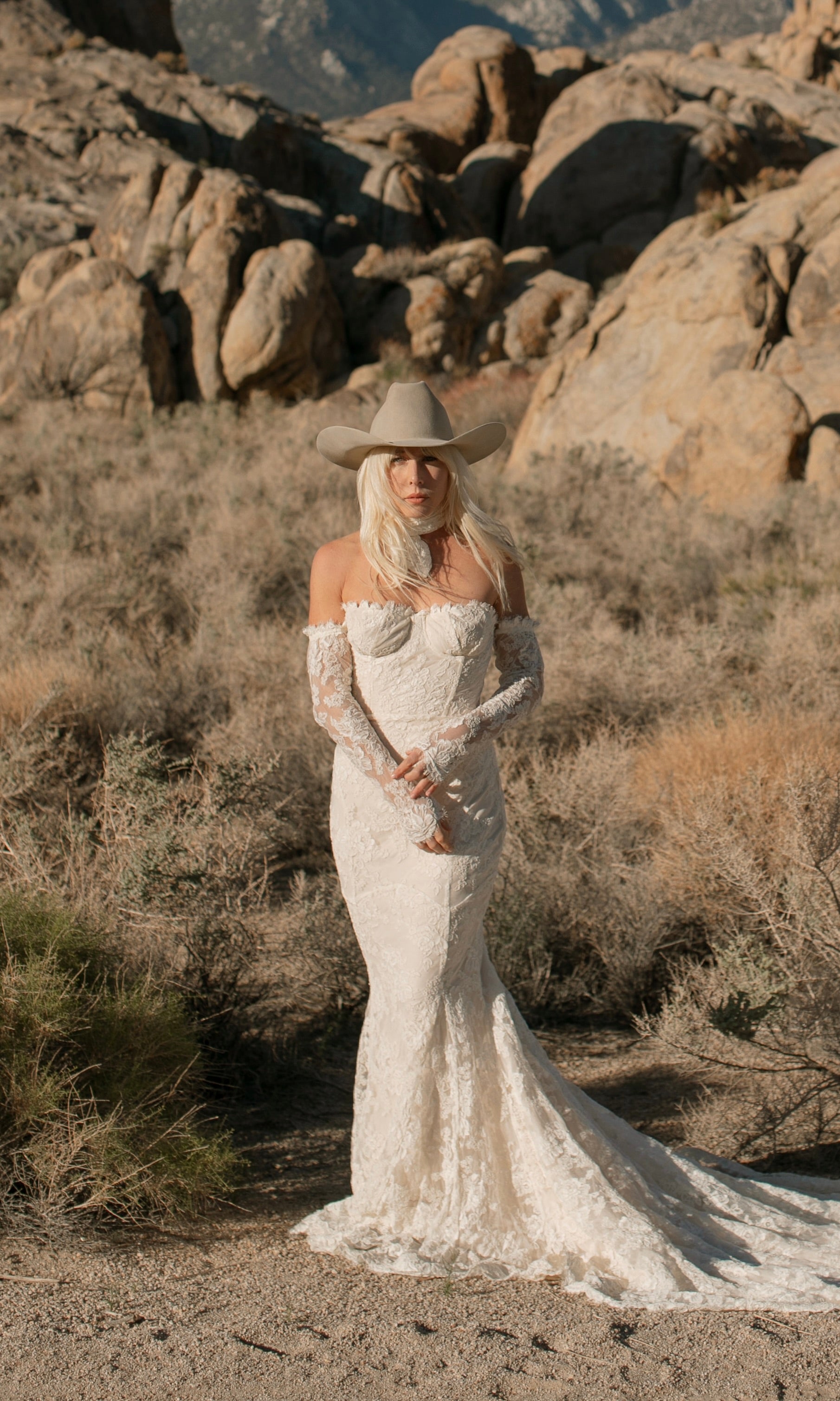 ROMANTIC FRENCH CORDED LACE BUSTIER GOWN, STRAPLESS AND FITTED BODICE WITH UNDERWIRE AND BONING. RUFFLED LACE DETAIL ALONG THE BUST, DETACHABLE LONG UNLINED SLEEVES WITH FIT AND FLARE SKIRT. ORNATE PEARL BUTTON DETAILING DOWN THE BACK, FRONT AND BACK PROMINENT PRINCESS SEAMS. FULL SKIRT FLOWS INTO AN ELONGATED TRAIN. ALSO, SEE SISTER STYLES ‘ROSS‘ & ‘LEO'.