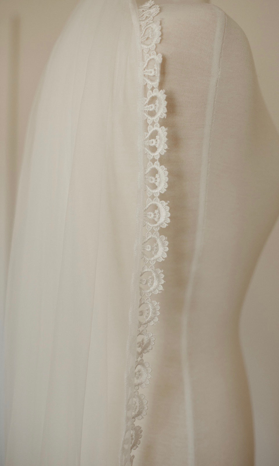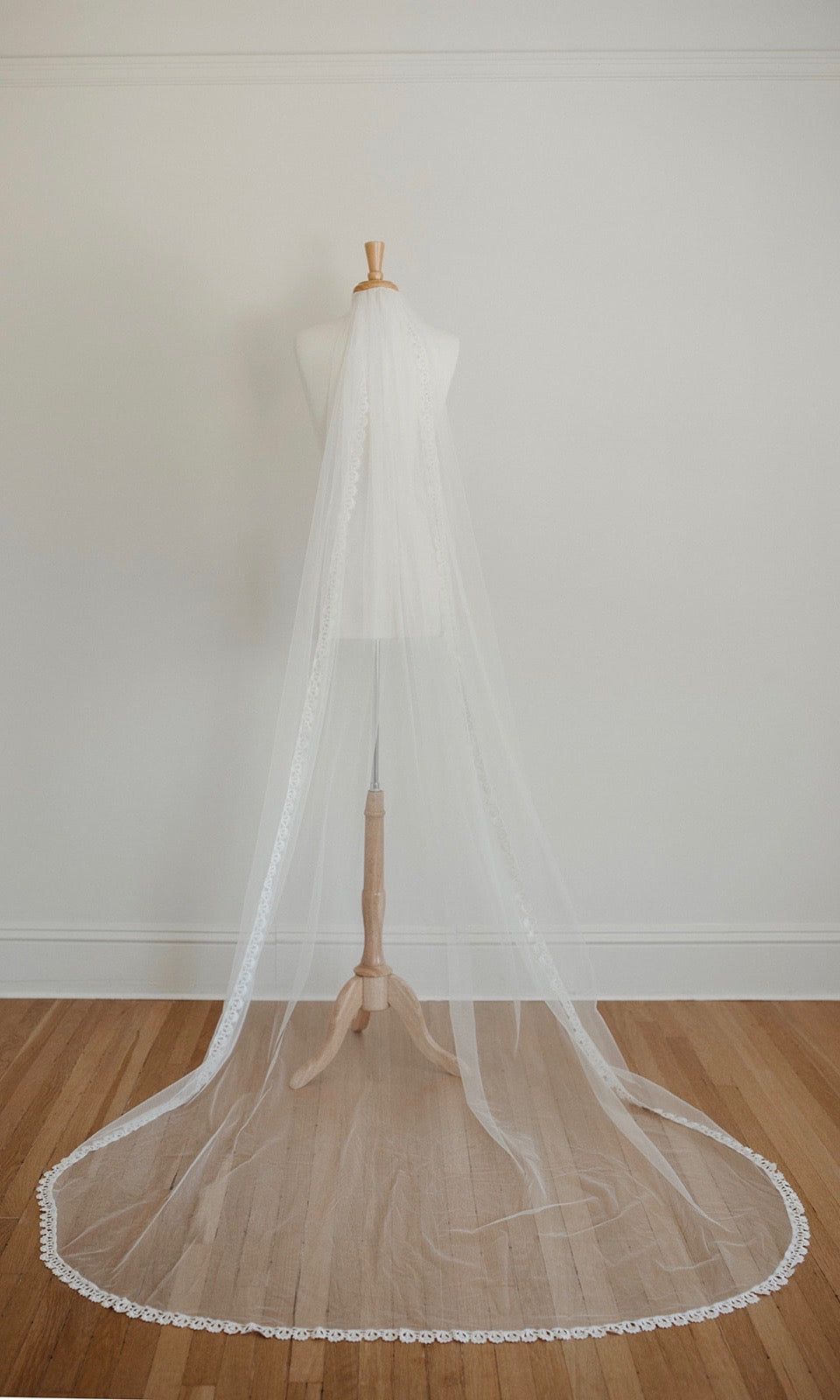 Soft tulle "Bohdi" veil, trimmed with vintage inspired teardrop crochet lace. Now available in fingertip length (42") and cathedral length (108"). Orders have a 5 week turn around from order to ship