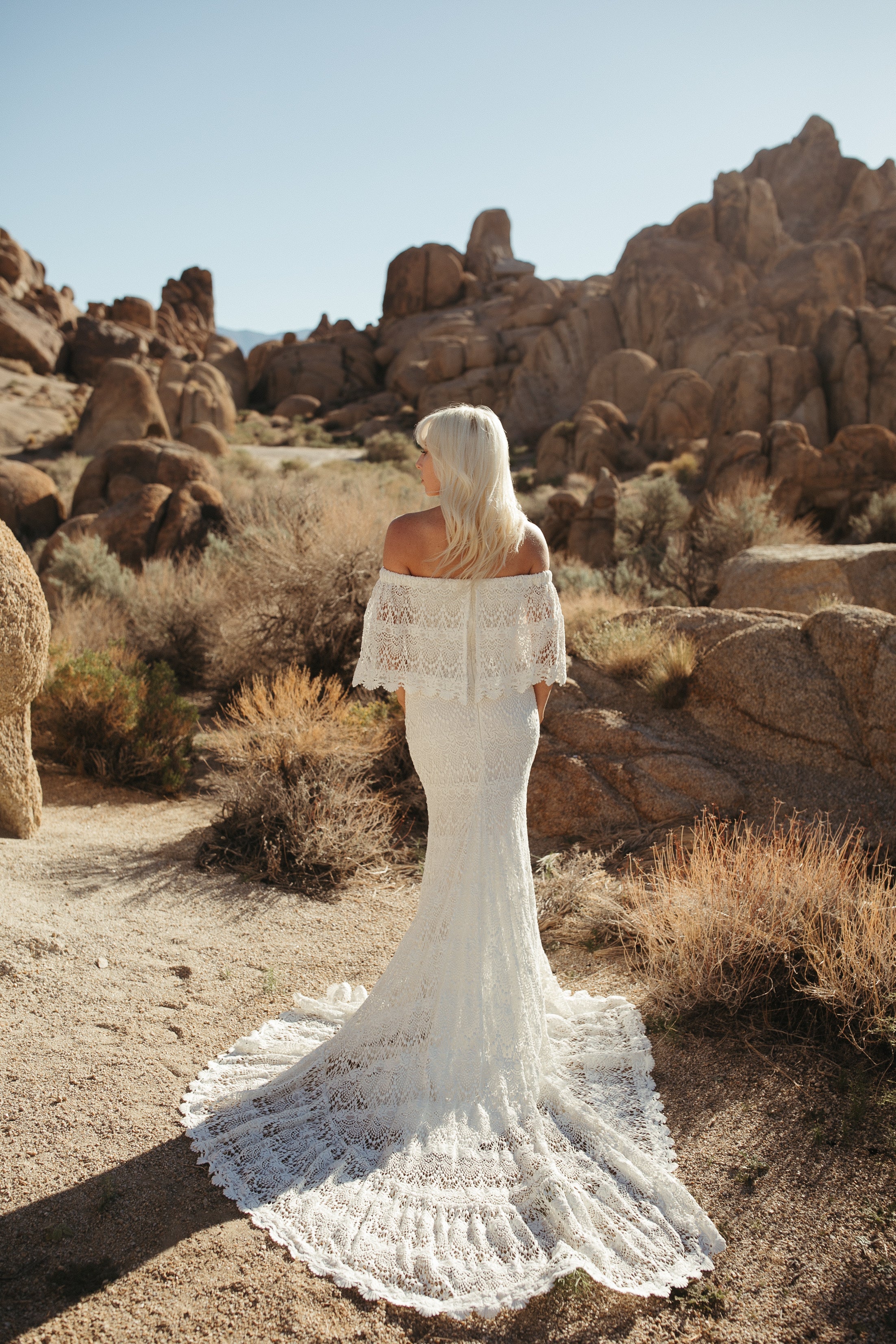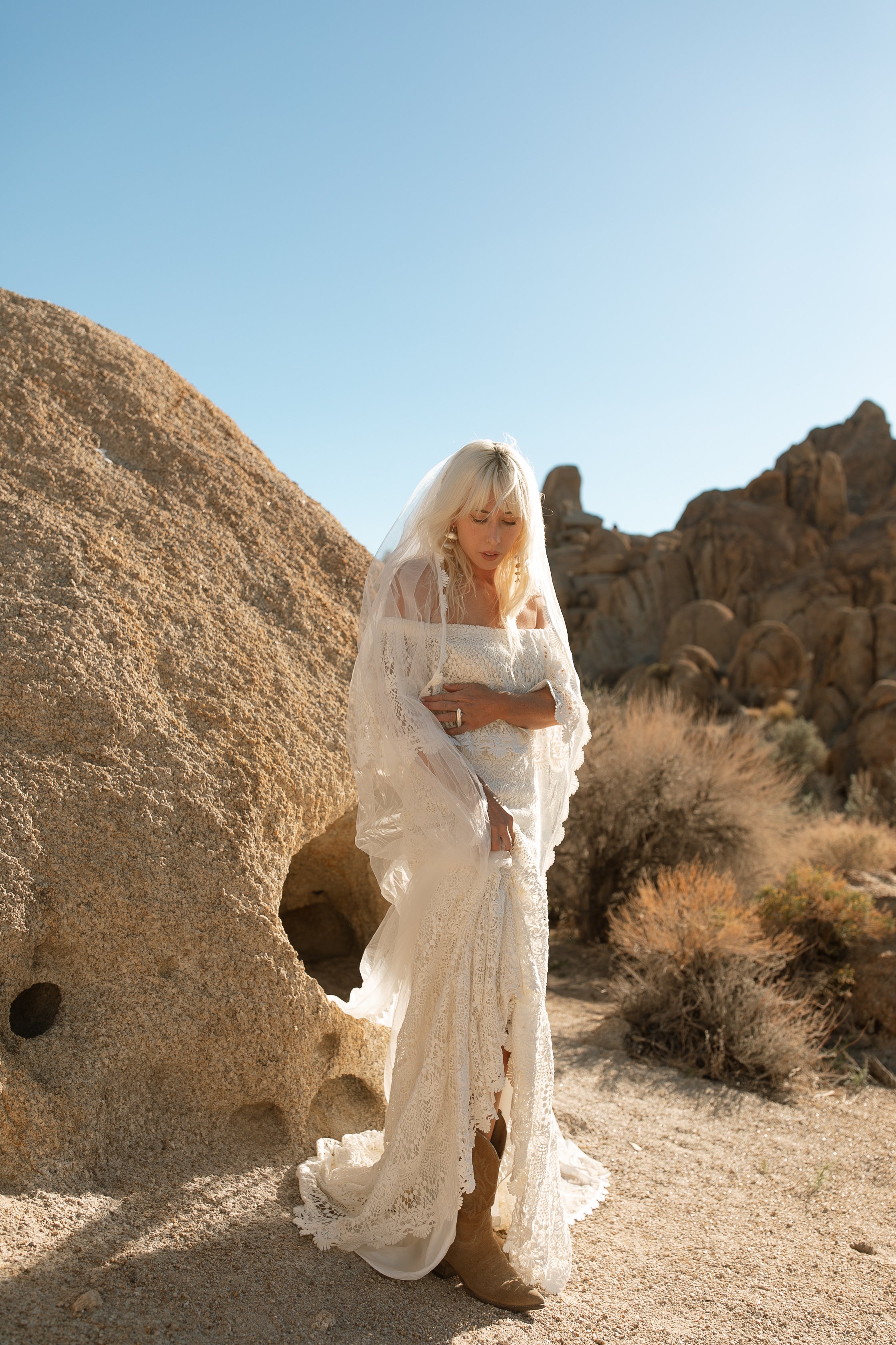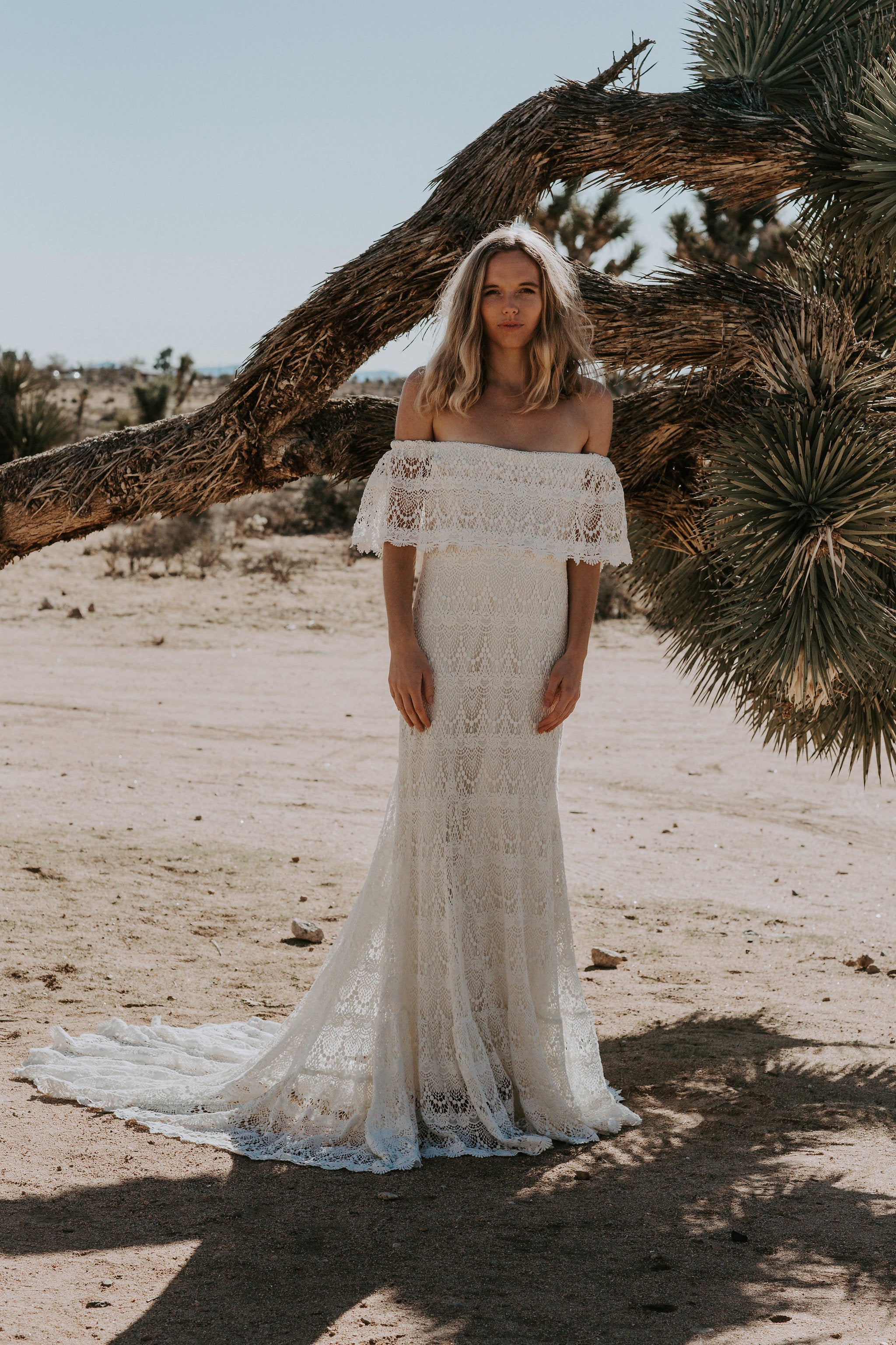 1970s inspired crochet lace off the shoulder wedding dress, the “Camille” gown combines every bohemian element we have up our sleeves. This wedding dress is made entirely with 100% cotton crochet lace and fully lined with a matte stretch satin. Armbands are designed with an elastic band for comfortable wear also leaving the option to be worn on the shoulder or off the shoulder. A hidden ivory back zipper and clasp are added for ease of dressing. This ivory lace gown is designed with a fitted bodice to accentuate the waist and a free-flowing a-line skirt which sweeps into a subtle train enhanced with a scalloped trim.