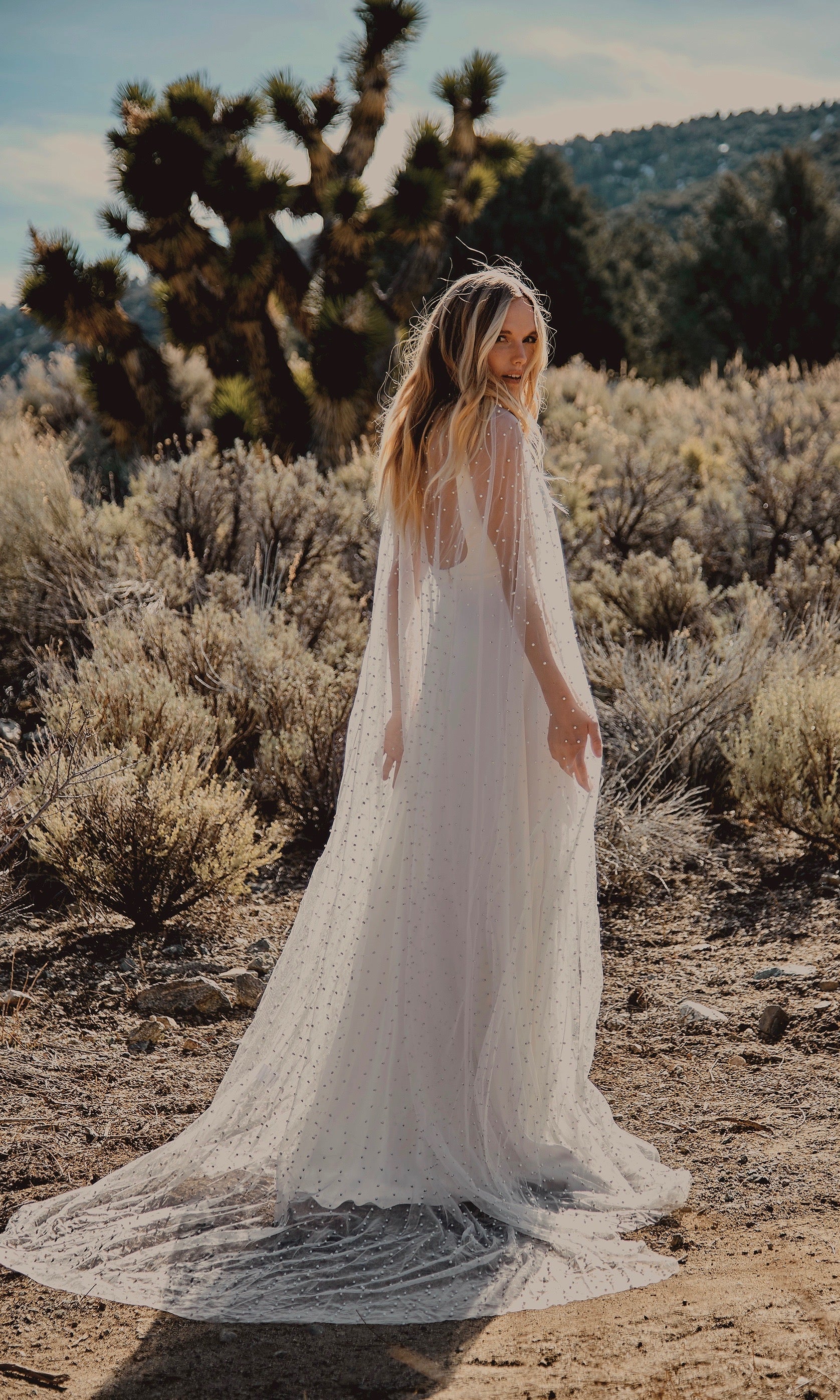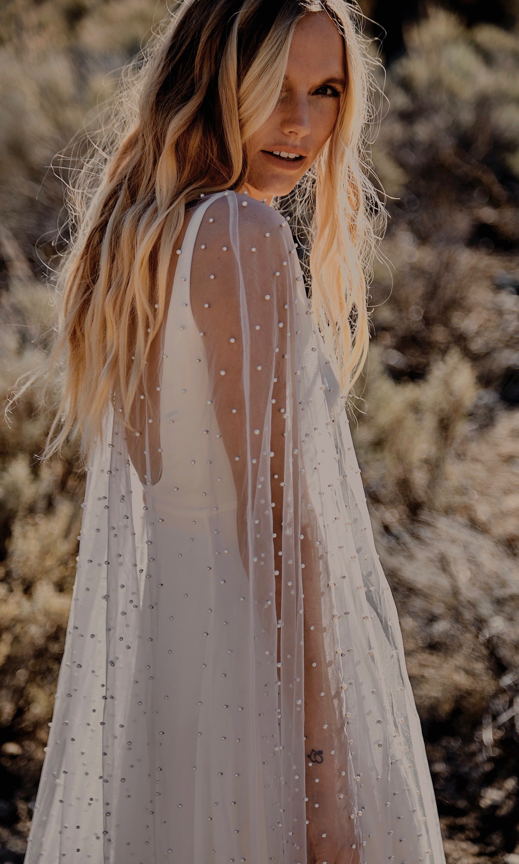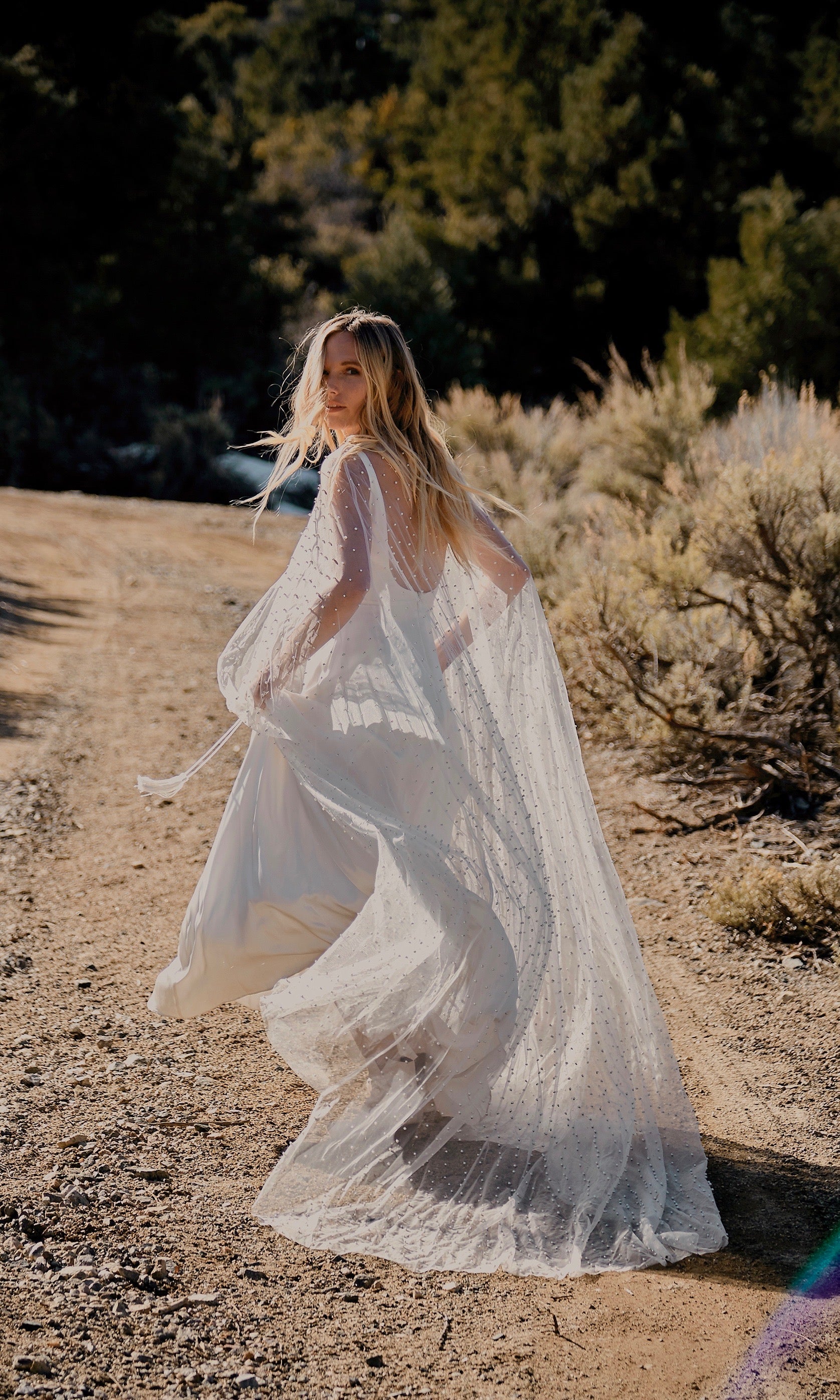Like something out of a royal bohemian fairytale, our long flowing cape is adorned with ivory pearls and a generous train. This netted overlay brings an ethereal richness to your bridal or bridesmaids look. *Gown under the cape not included. Orders have a 5 week turn around from order to ship