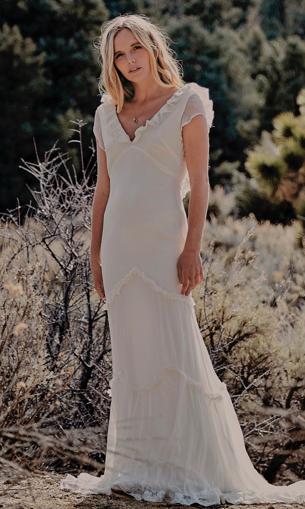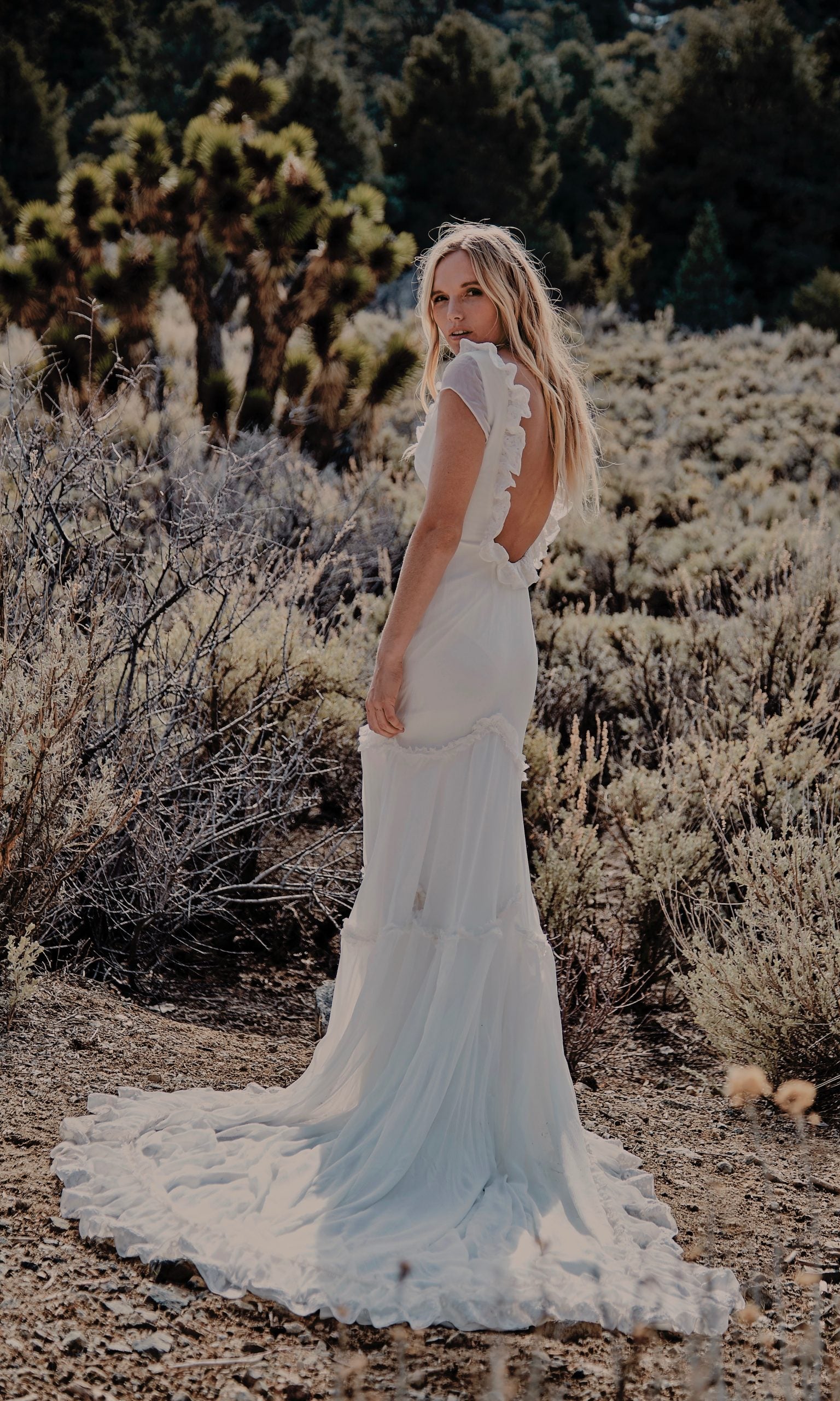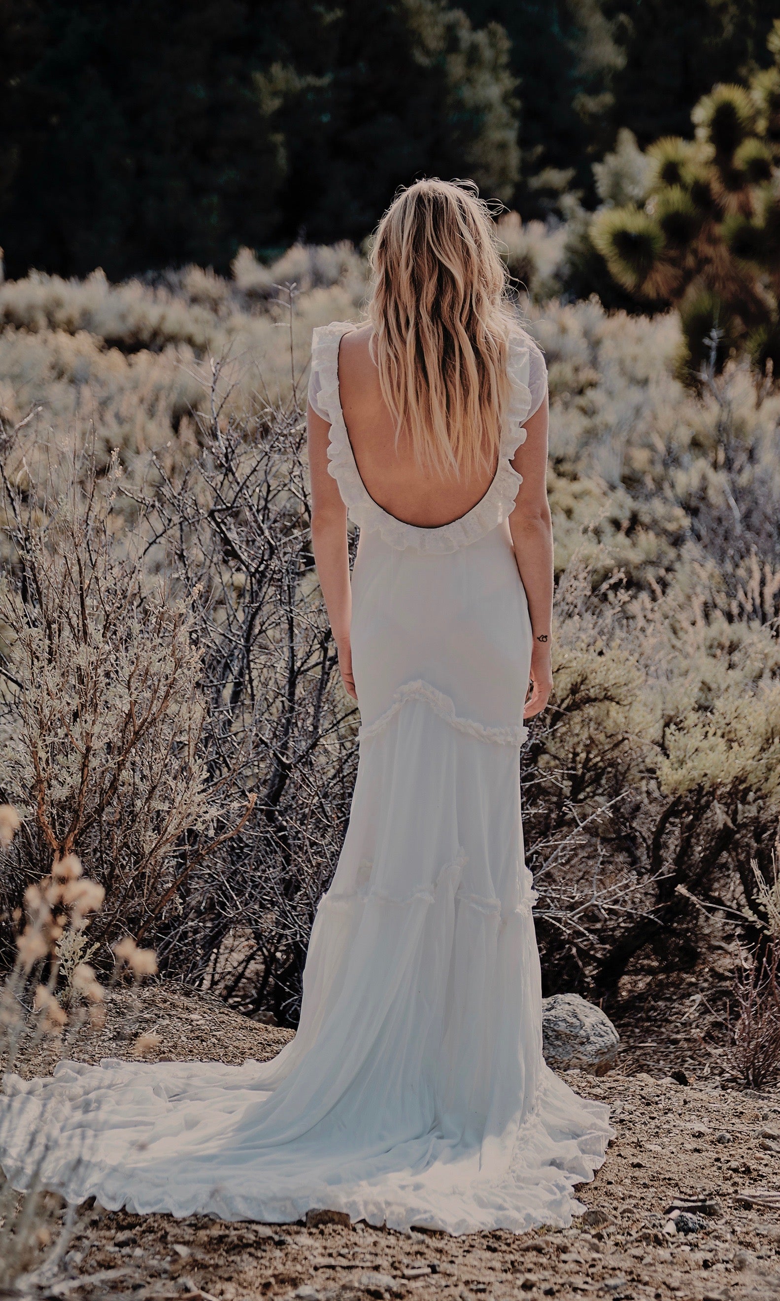 Silk wedding gown Ezra, (the sister gown to Valle) has a daring low back with a complimenting three tiered skirt garnished with pleating. This form fitting and flattering silhouette descends into a magnificent train that floats gracefully behind you. The Ezra is a gown with unique characteristics, such as one of a kind embroidered silk trim, that enhance the simplicity of it's beauty. Part of our ‘Day Dream’ Collection