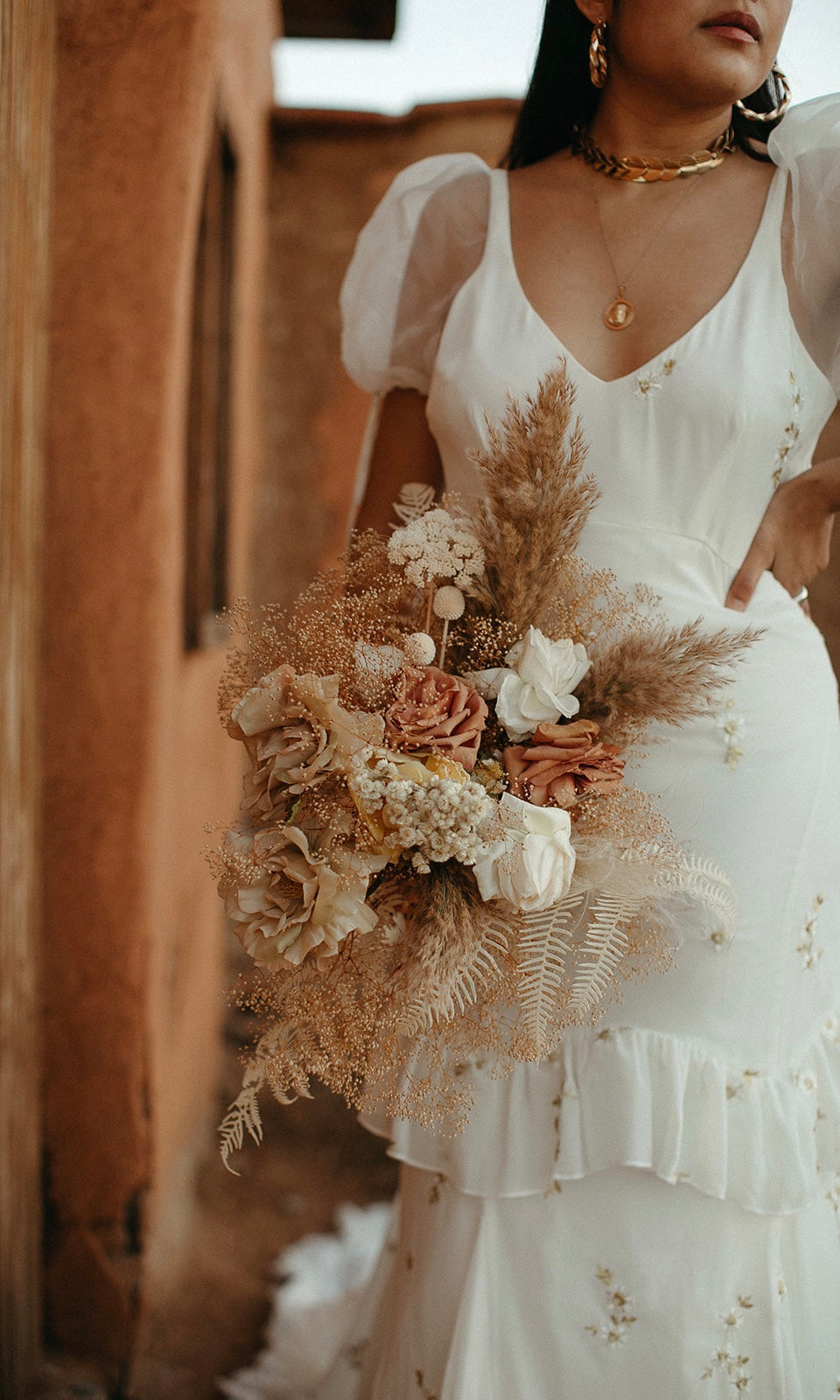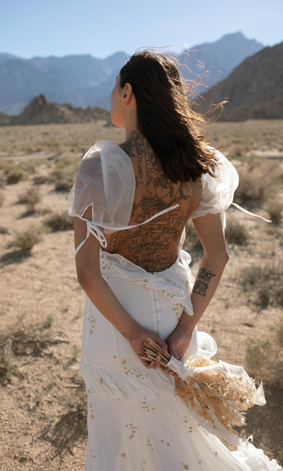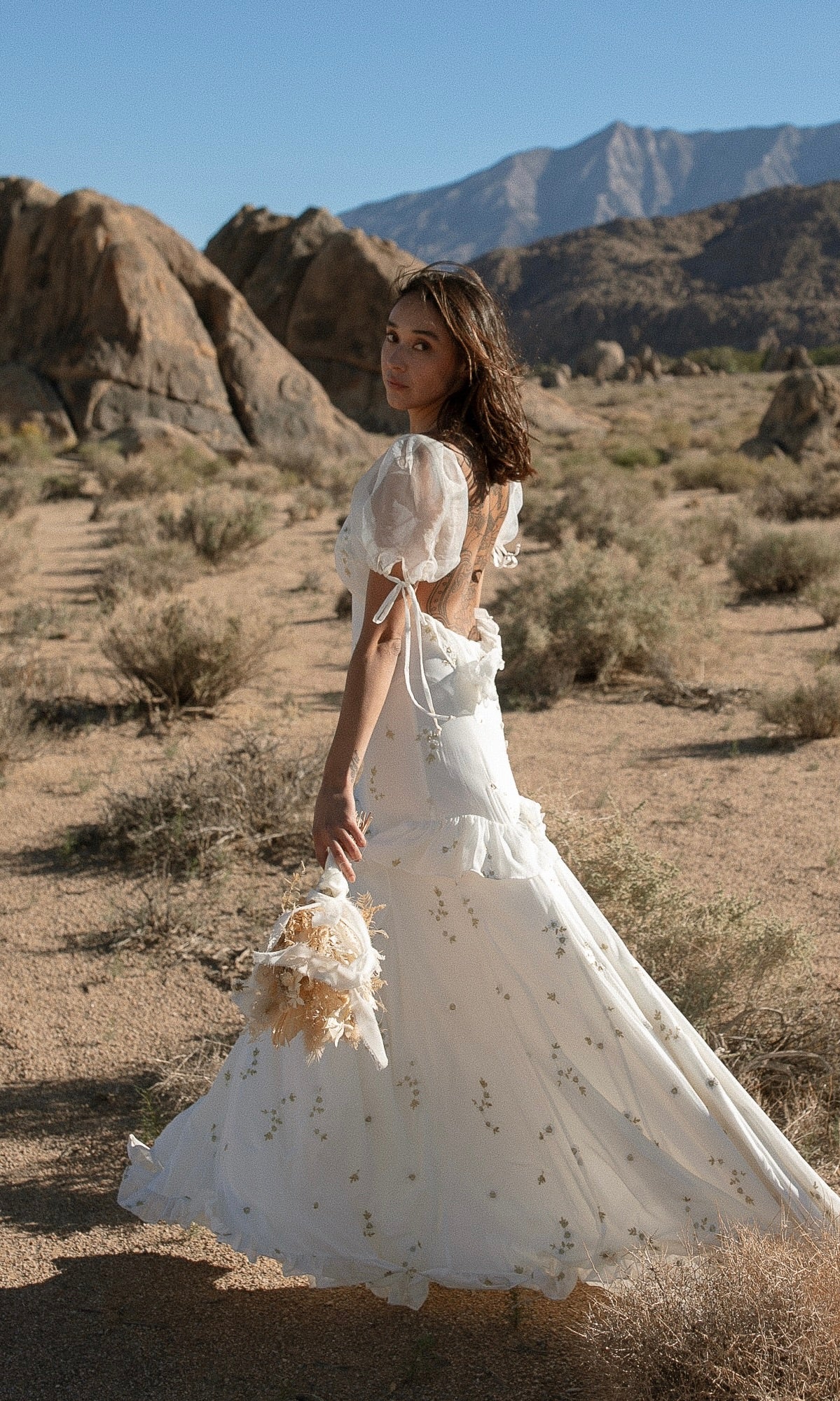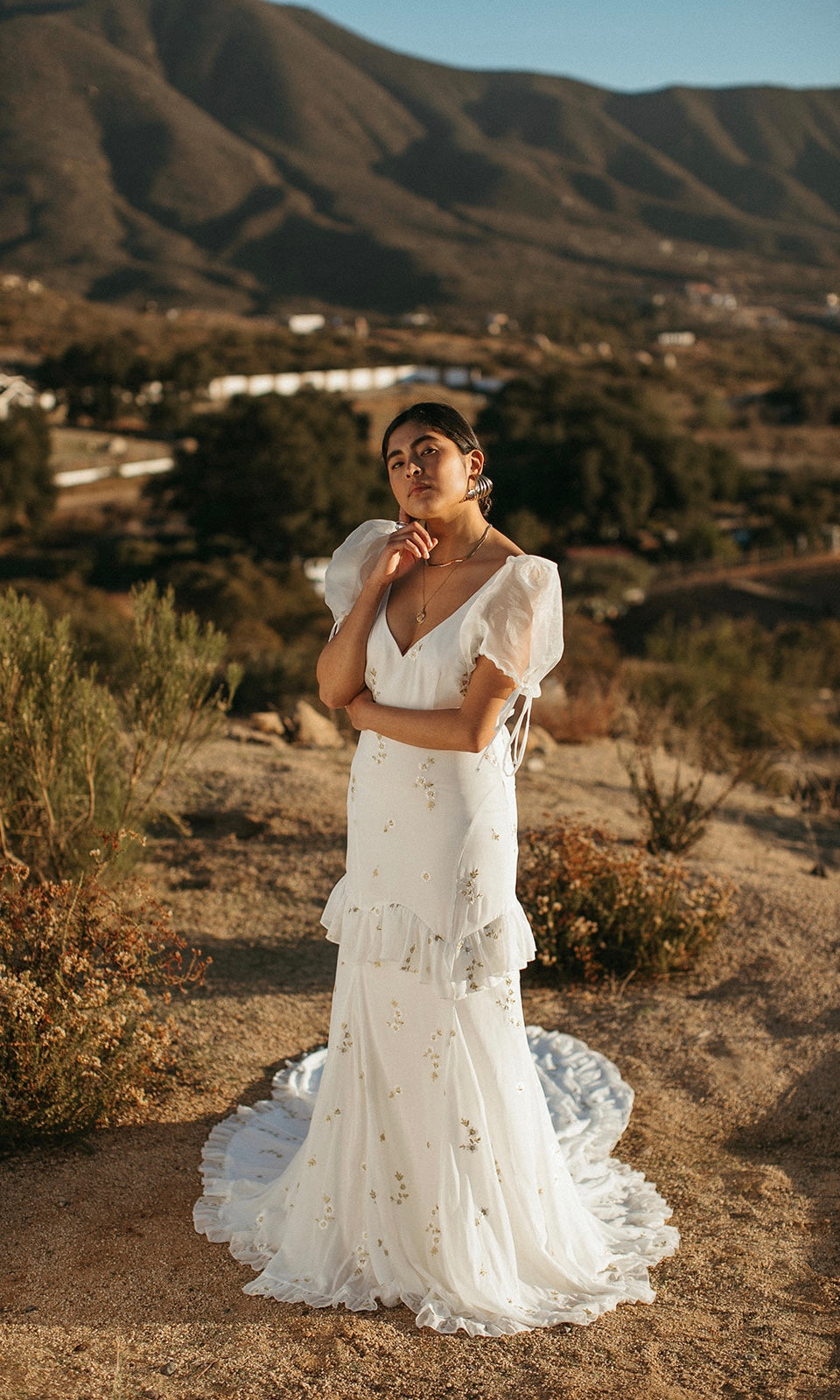GOLD AND IVORY EMBROIDERED FLORAL CHIFFON GOWN WITH WIDE V-NECKLINE AND PUFF CAP SLEEVES. FEATURES A FULL OPEN BACK WITH RUFFLE DETAIL ALONG THE LOW BACK, AND A WRAP AROUND RUFFLE DETAIL STARTING AT THE FRONT OF SKIRT. PROMINENT FRONT AND BACK PRINCESS SEAMS, COMPLETE WITH A FULL FLOOR SWEEPING TRAIN. SATIN COVERED BUTTONS DOWN THE BACK.