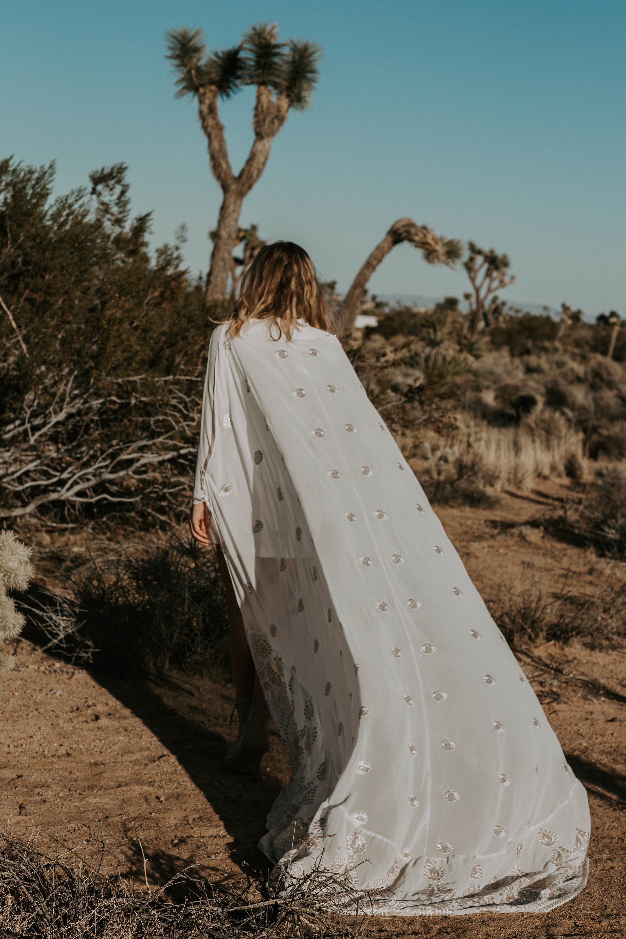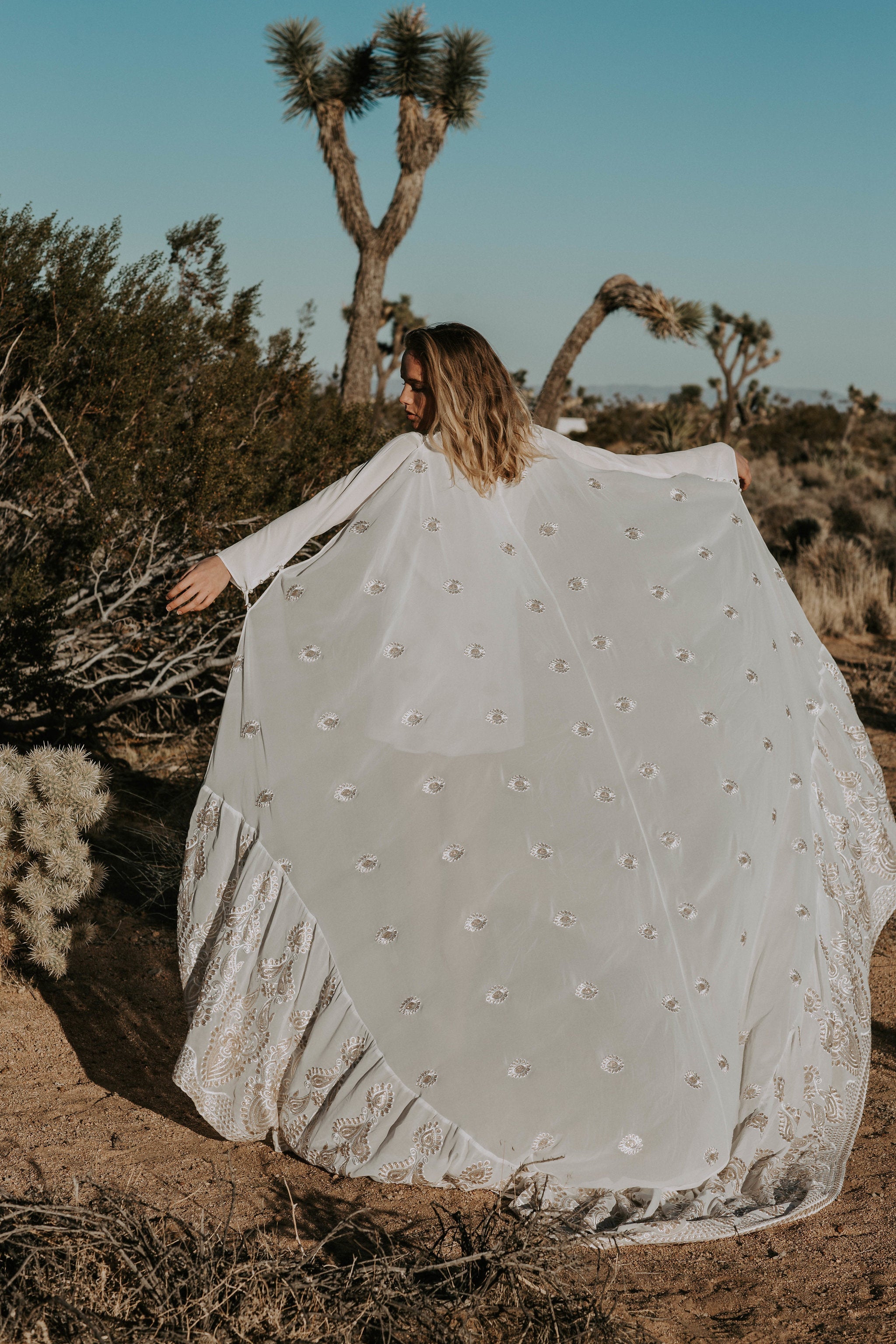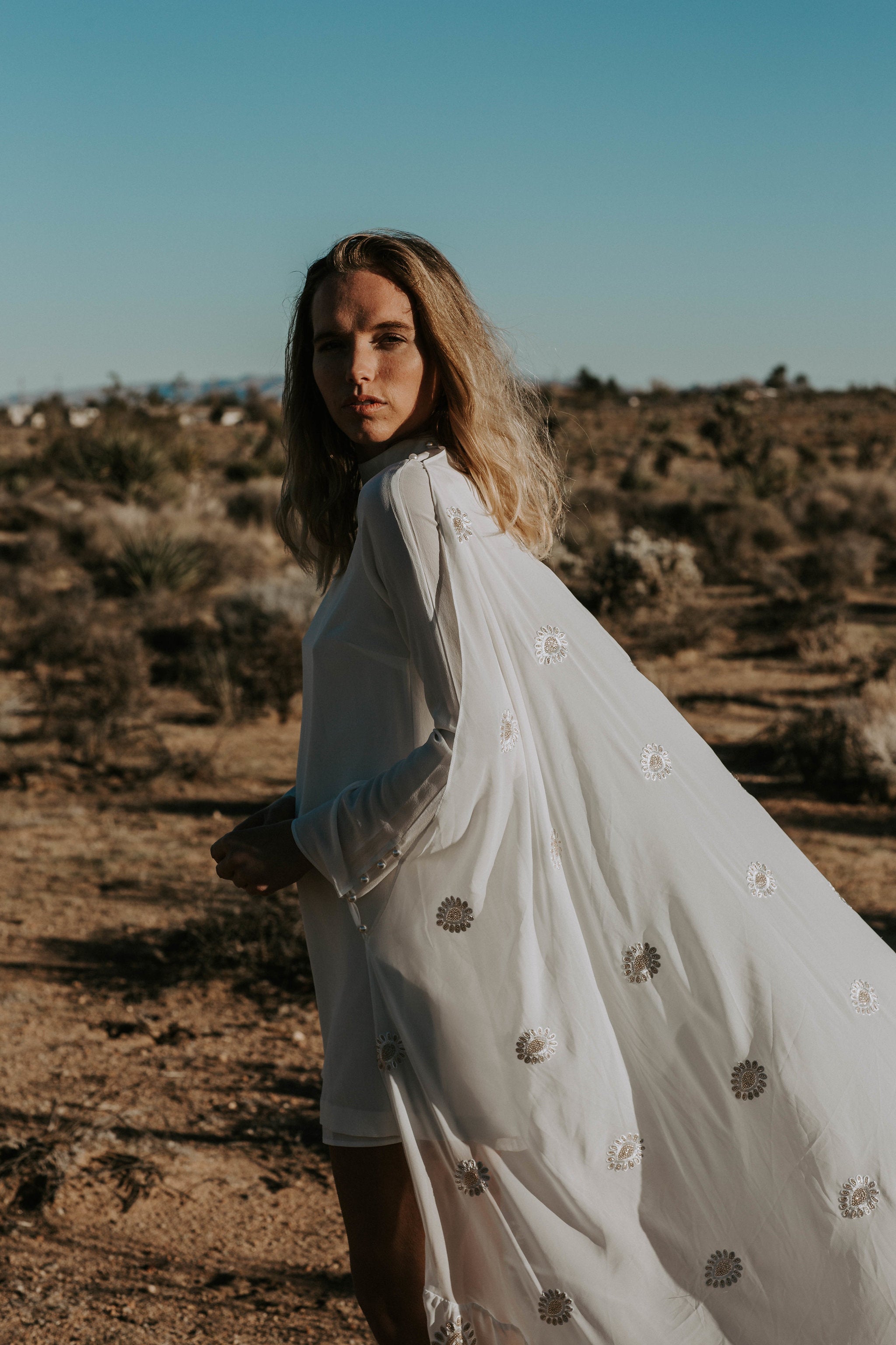 The "Gaga" 60's mod mini-dress is like no other dress we've designed before - modern, ethereal and bohemian whisked together. This sultry, washed silk, 60's mod mini-dress has a high-neckline, unlined long sleeves and side pockets. It features a detachable grand embroidered sequin chiffon cape complete with pearled buttons. Perfect for the bride who wants to make a statement.