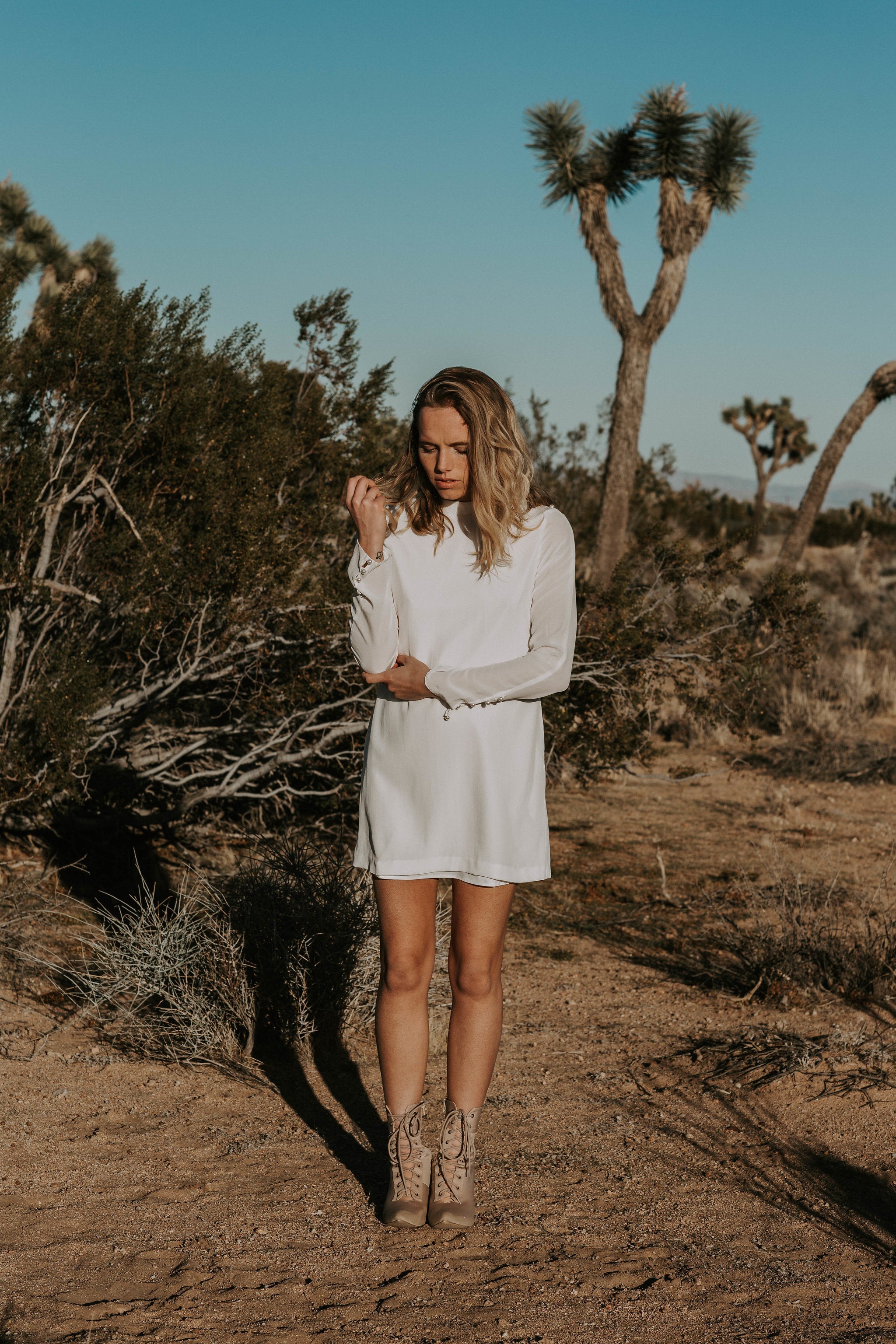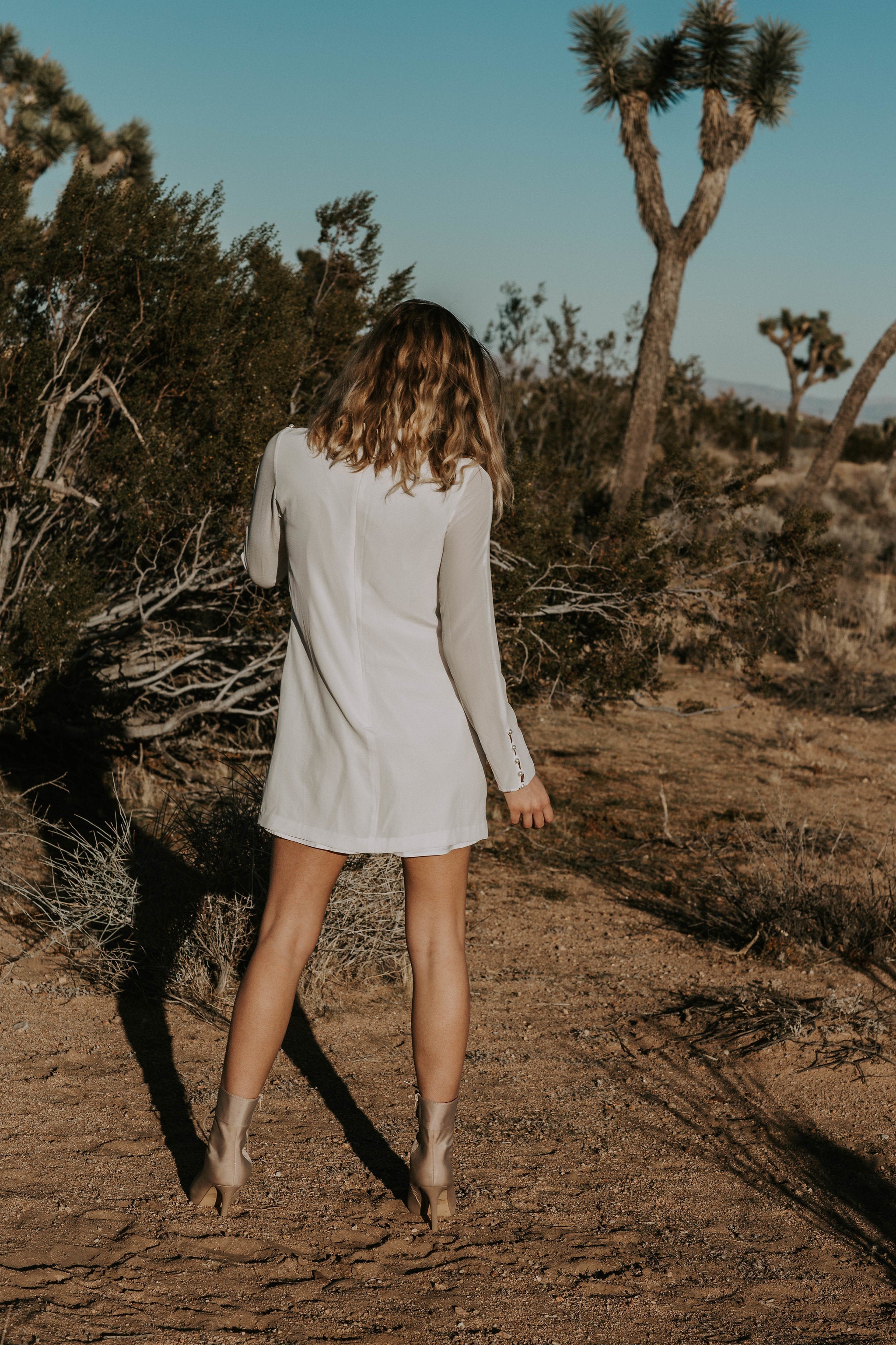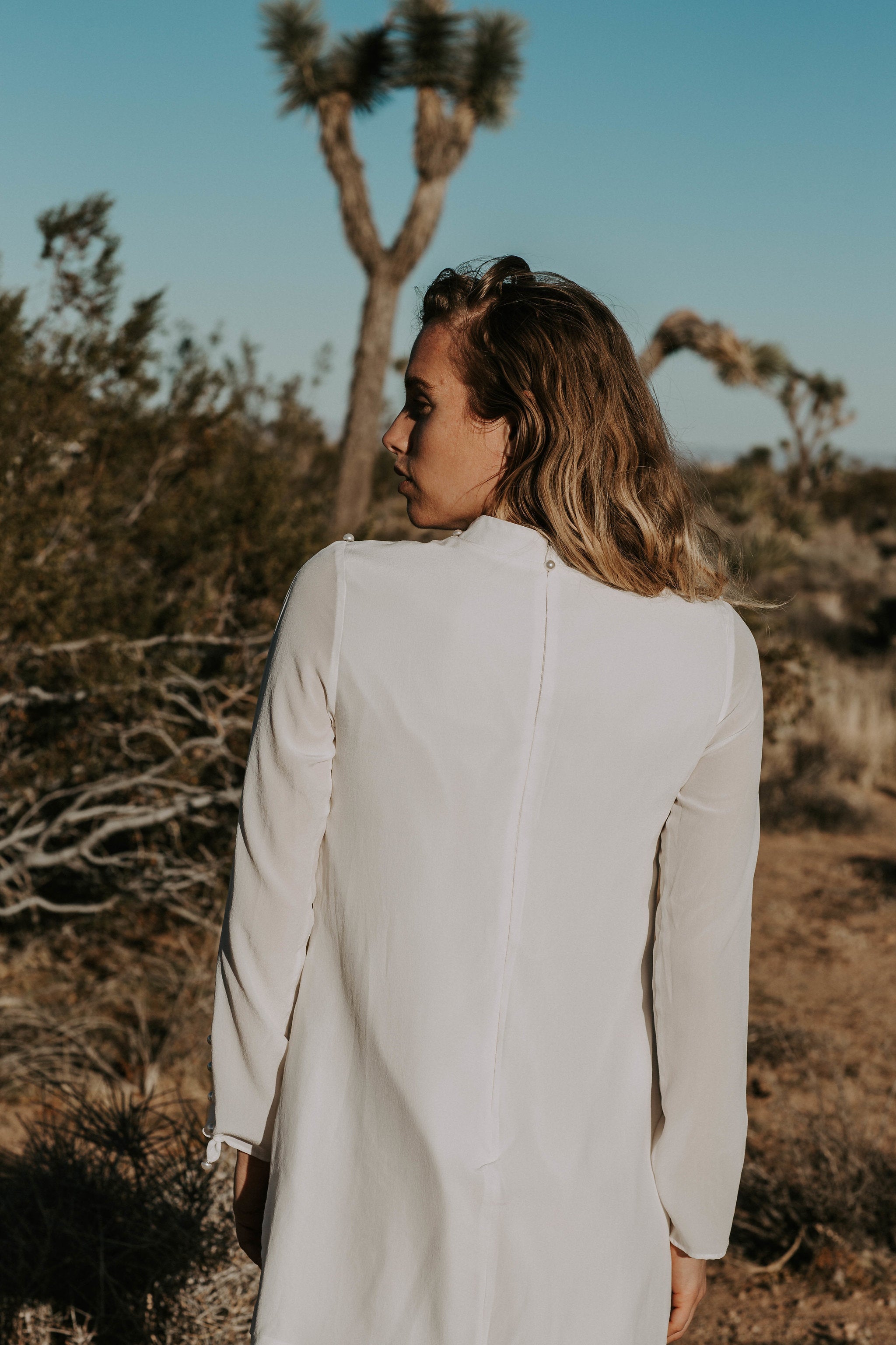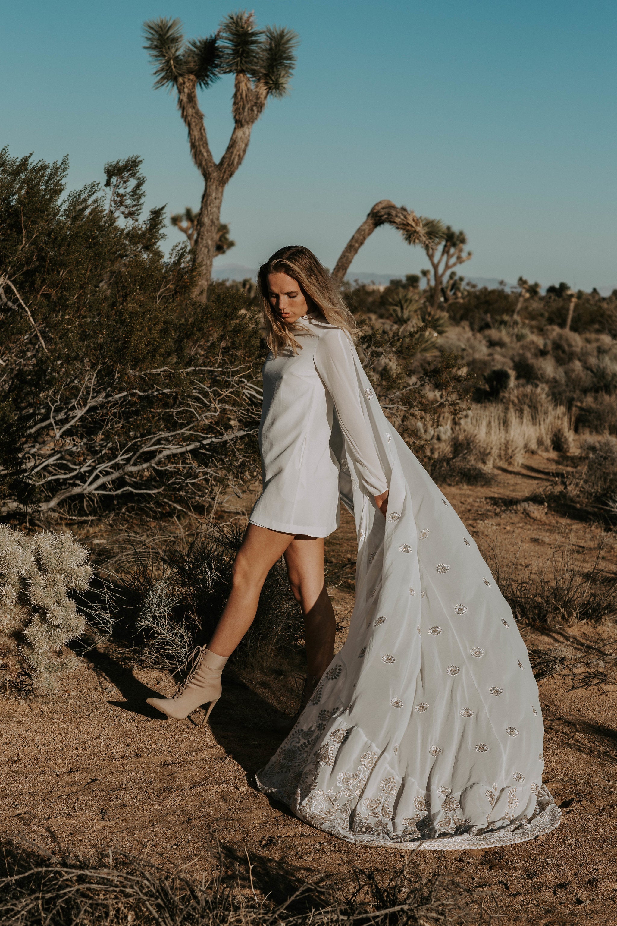 The "Gaga" 60's mod mini-dress is like no other dress we've designed before - modern, ethereal and bohemian whisked together. This sultry, washed silk, 60's mod mini-dress has a high-neckline, unlined long sleeves and side pockets. It features a detachable grand embroidered sequin chiffon cape complete with pearled buttons. Perfect for the bride who wants to make a statement.