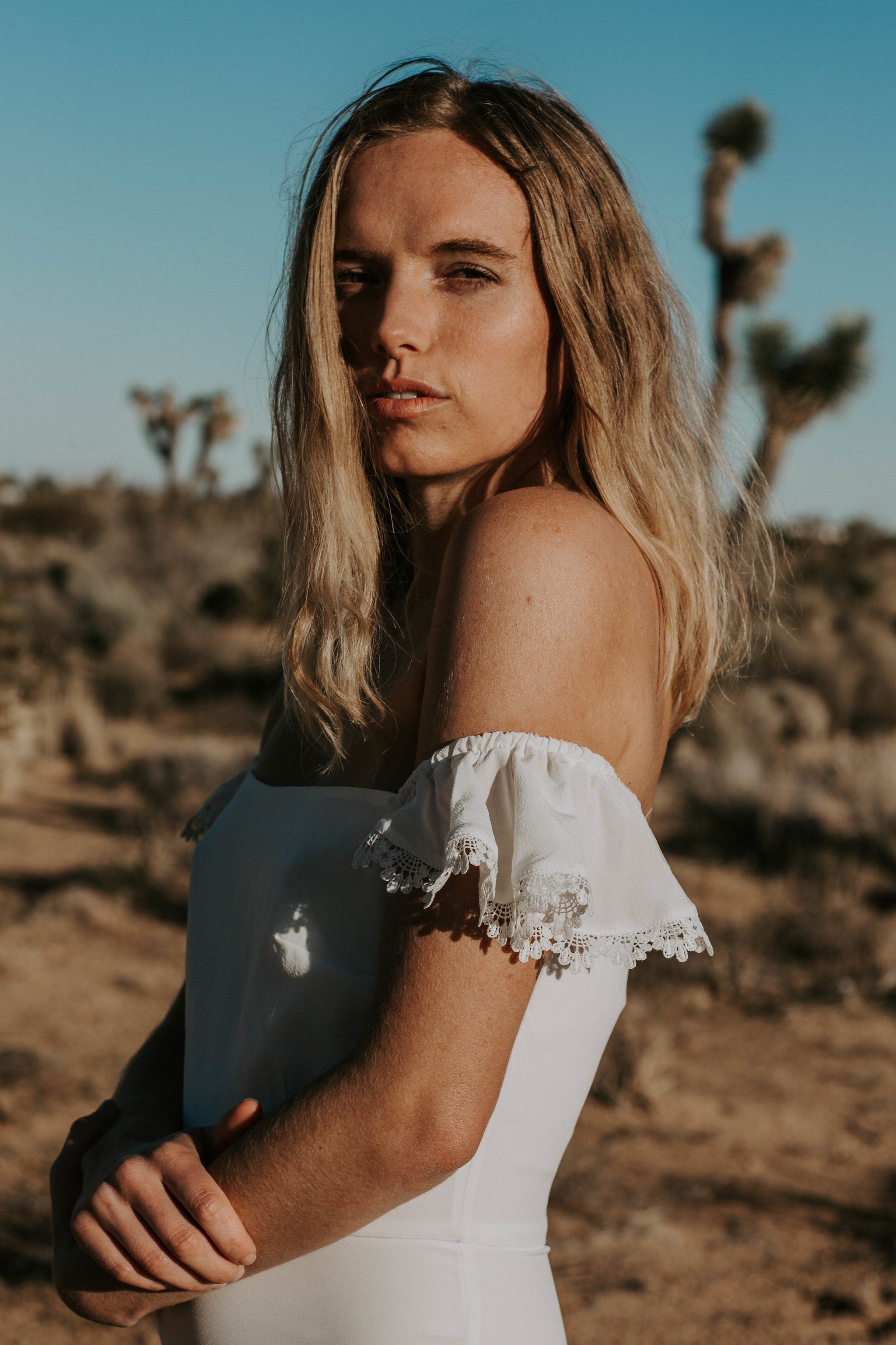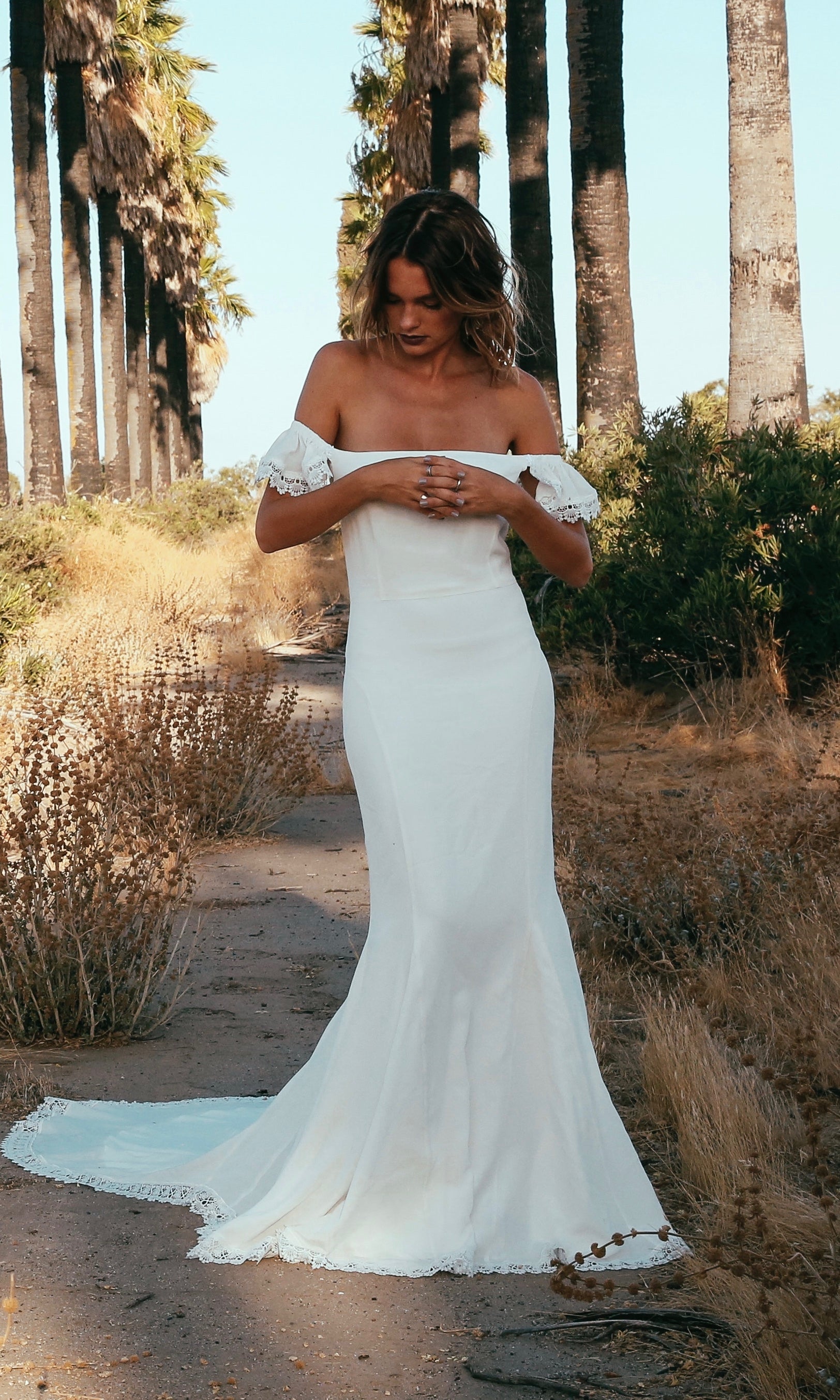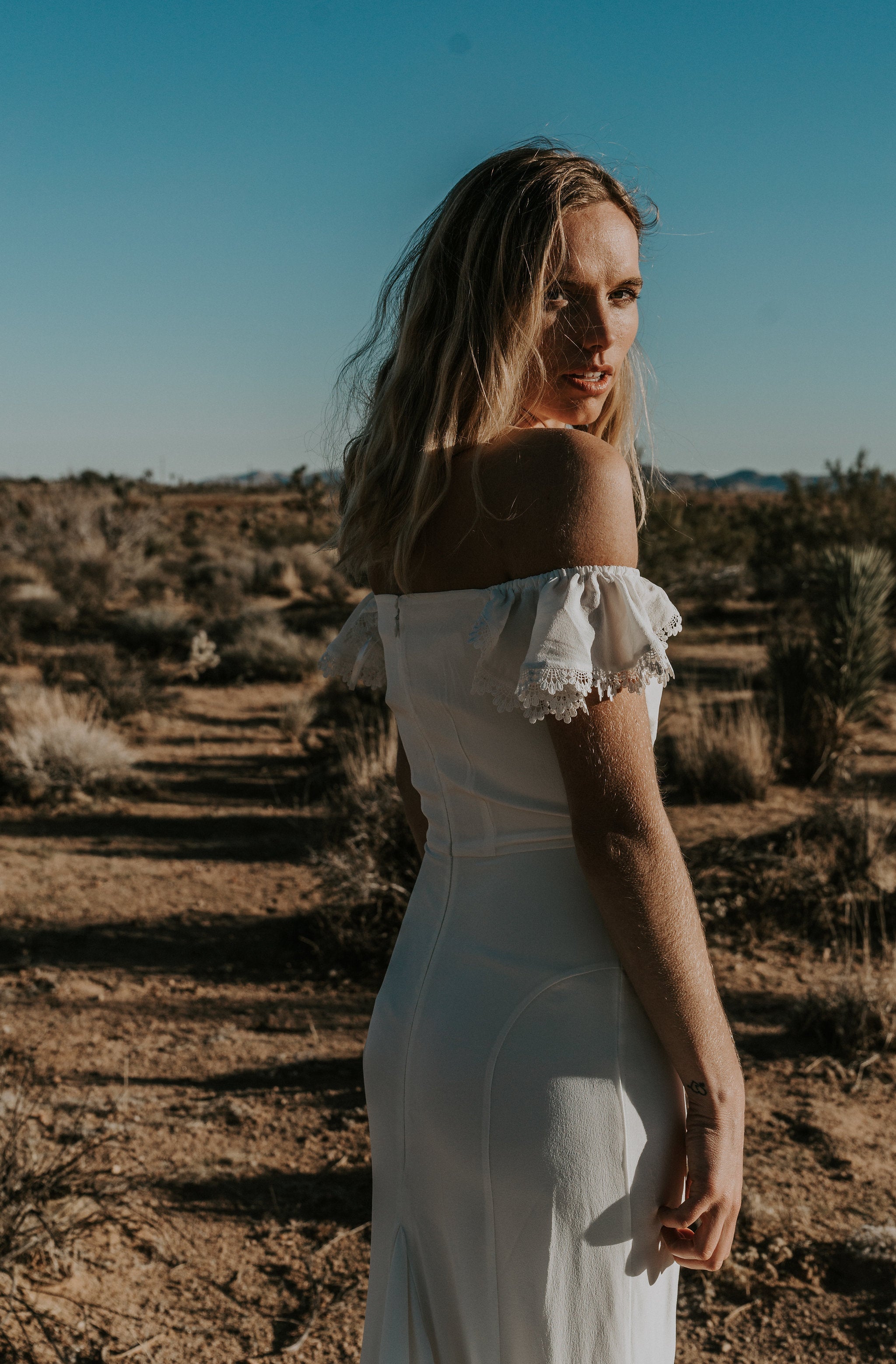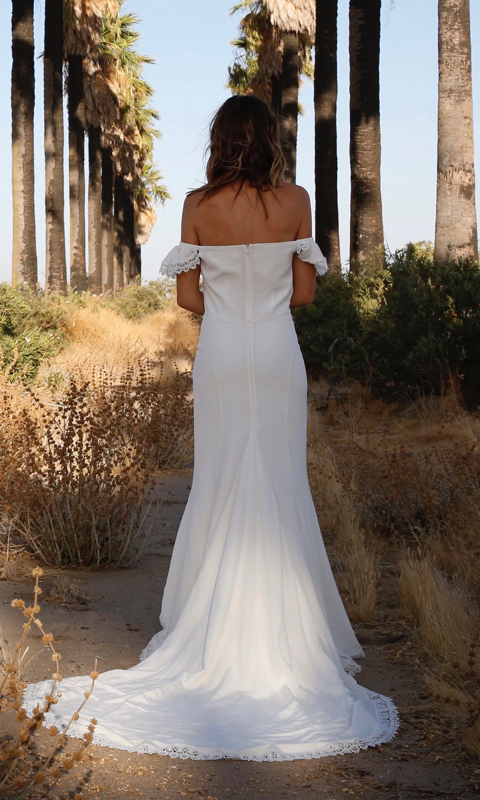 Silk off the shoulder wedding dress, the “Kemp” sticks to our signature DOS style with alluring romantic touches. This boho gown begins with a full ivory charmeuse satin liner with an exceptionally soft 100% silk overlay. Flutter sleeves are designed with our softest silk and lay loosely off the shoulder. Fitted bodice that hugs the hips into a "fit and flare" look before cascading into a rounded train. A hidden back zipper and clasp are added for ease of dressing.