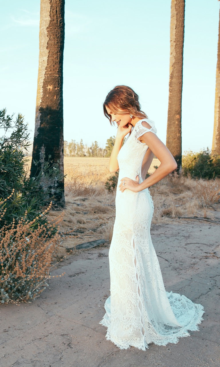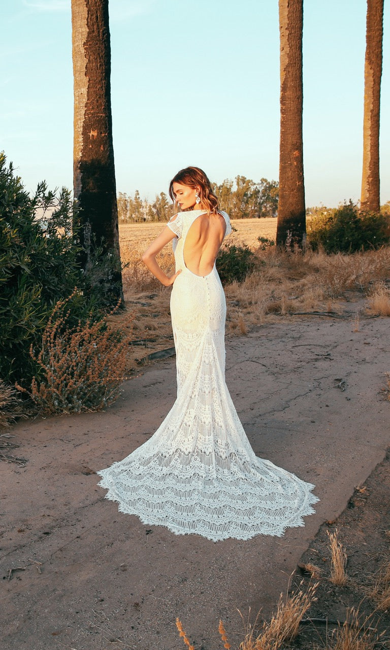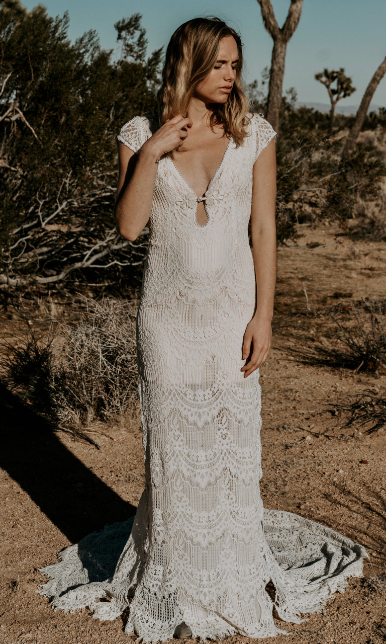 For the bride looking for the perfect nontraditional wedding dress. The "Ronan" was inspired by 1970s muse Jane Birkin's iconic bohemian style. Featuring cap sleeves, eyelash lace, and a beautiful pledging neckline. Sides and sleeves of gown come unlined with peep hole like scalloped detailing. Fully exposed back which sweetly buttons at the top to close. Bodice is fit and flare, falling into a rounded train with eyelash lace trim. The "Ronan" dress is lined with a silky nude charmeuse satin