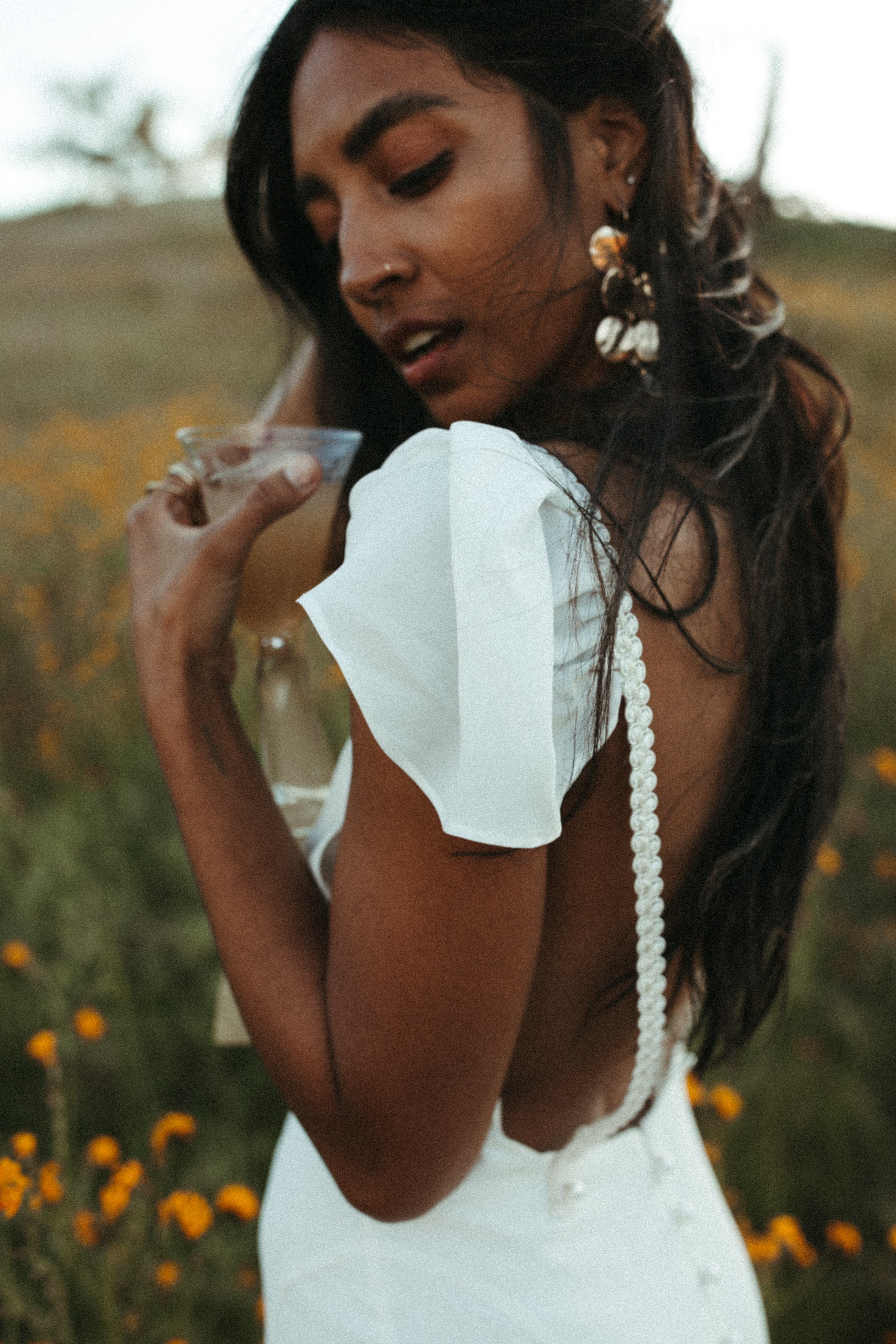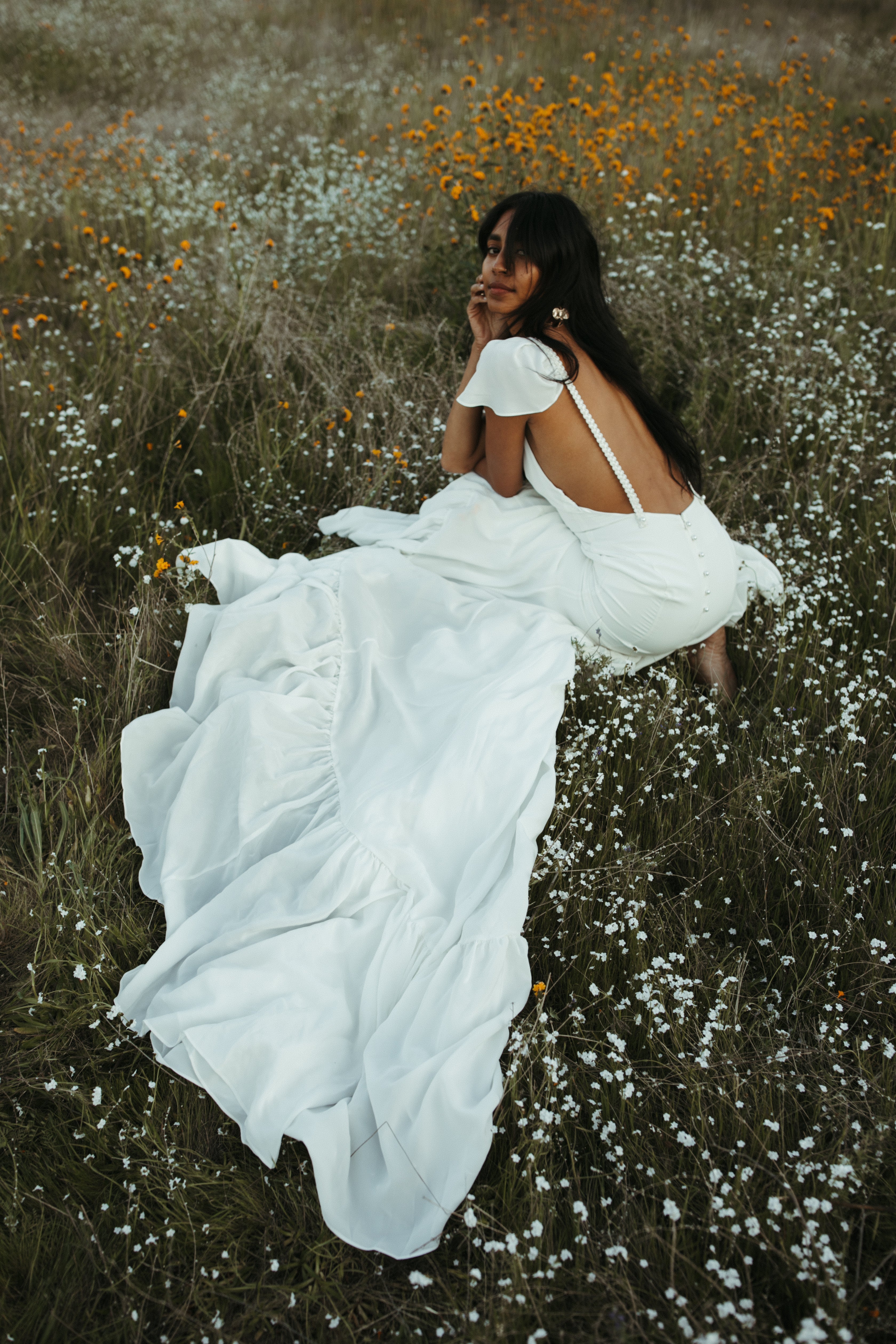 THE “STEVIE” GOWN IS POSSIBLY AS ROMANTIC AS IT GETS. THIS GOWN FEATURES A 90S SCOOP-LIKE NECK. FLATTERING SEAMS THROUGHOUT THE EMPIRE WAIST ACCENTUATE AND FLATTERS THE HIPS BEFORE CASCADING INTO A DRAMATIC ROUNDED TRAIN. THIS DRESS ALSO INCLUDES A FULLY EXPOSED BACK WITH TWO WINGS AT THE LOWER BACK (WHICH CAN BE DETACHED BY BUTTON LOOP). CHOICE OF PEARLED TULLE OR IVORY CHIFFON WINGS