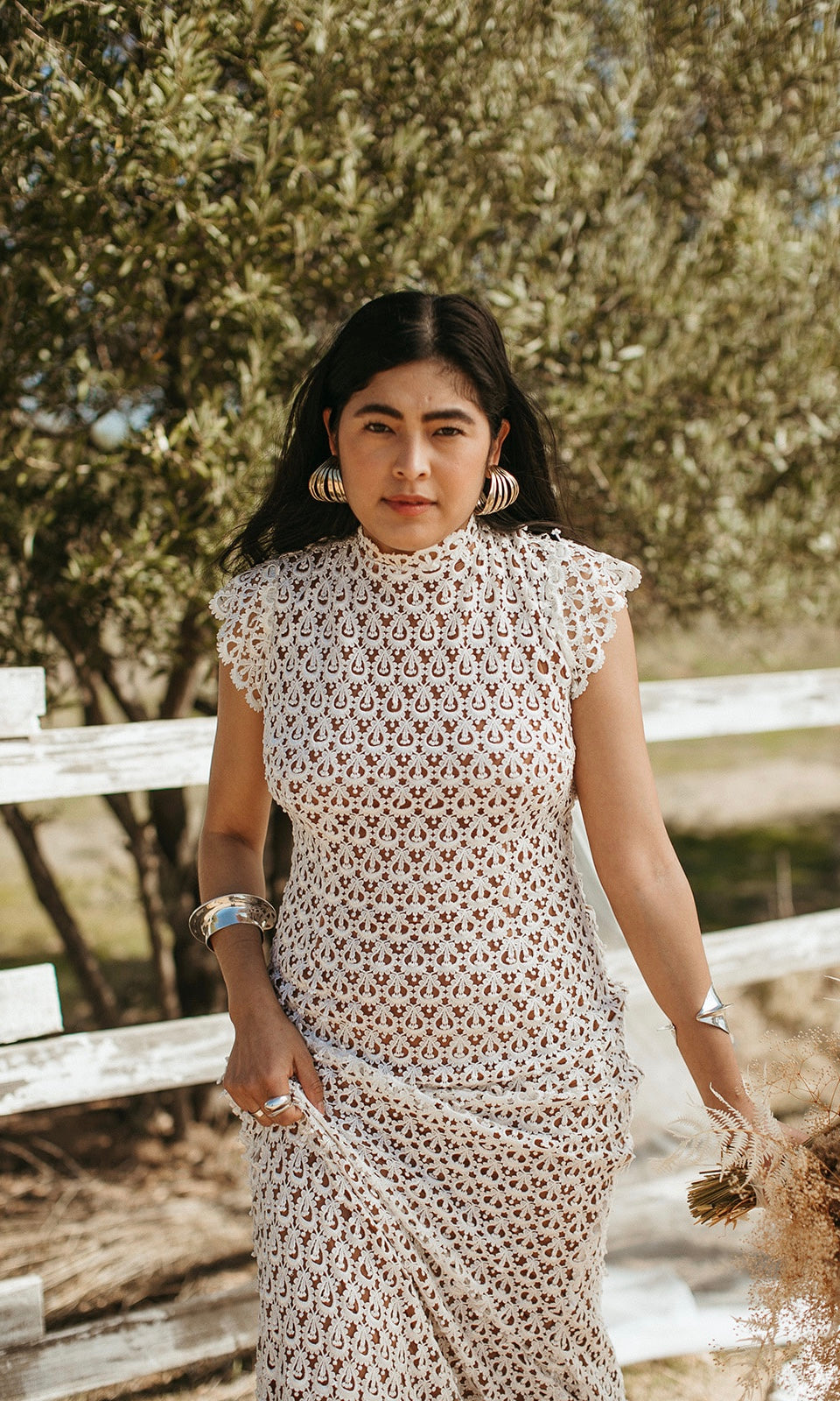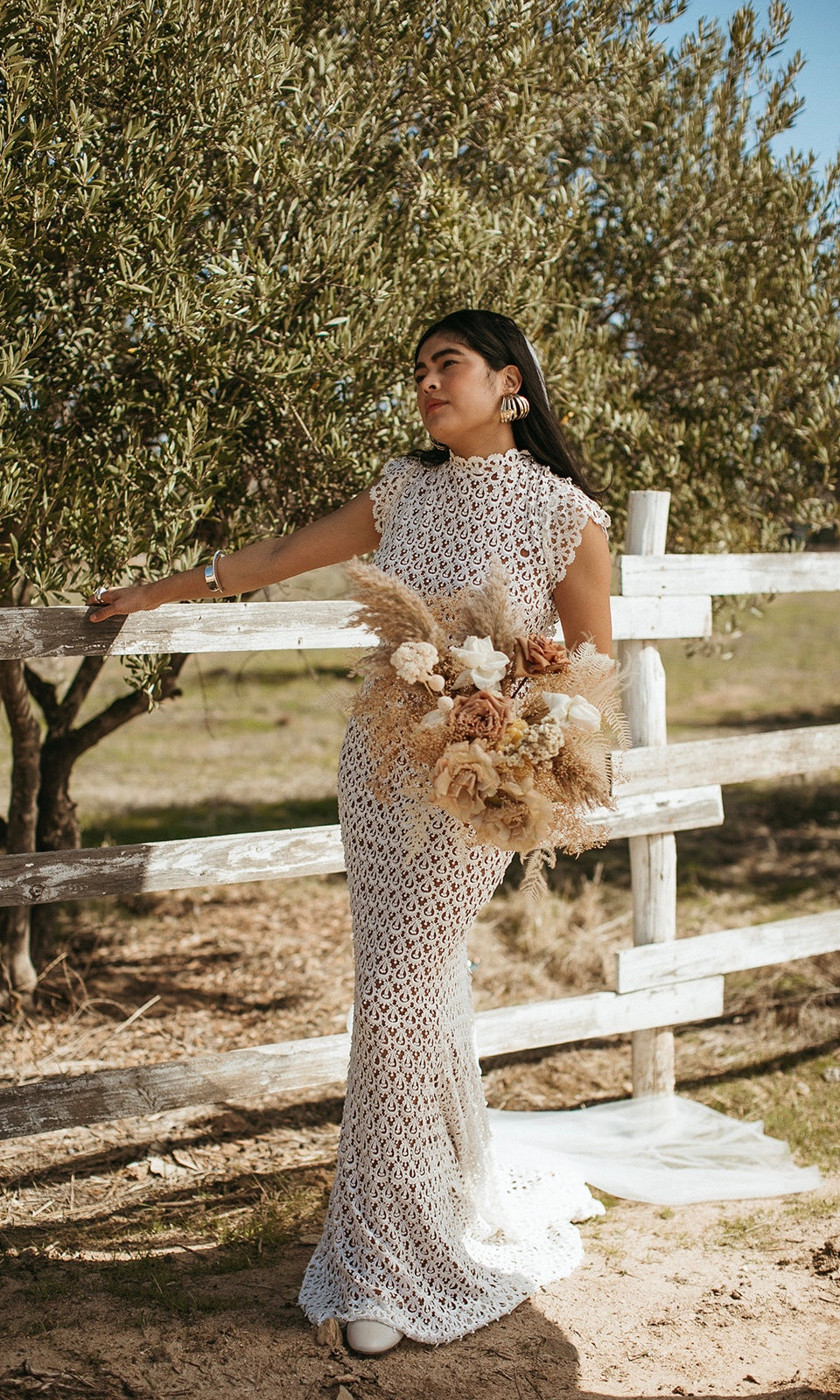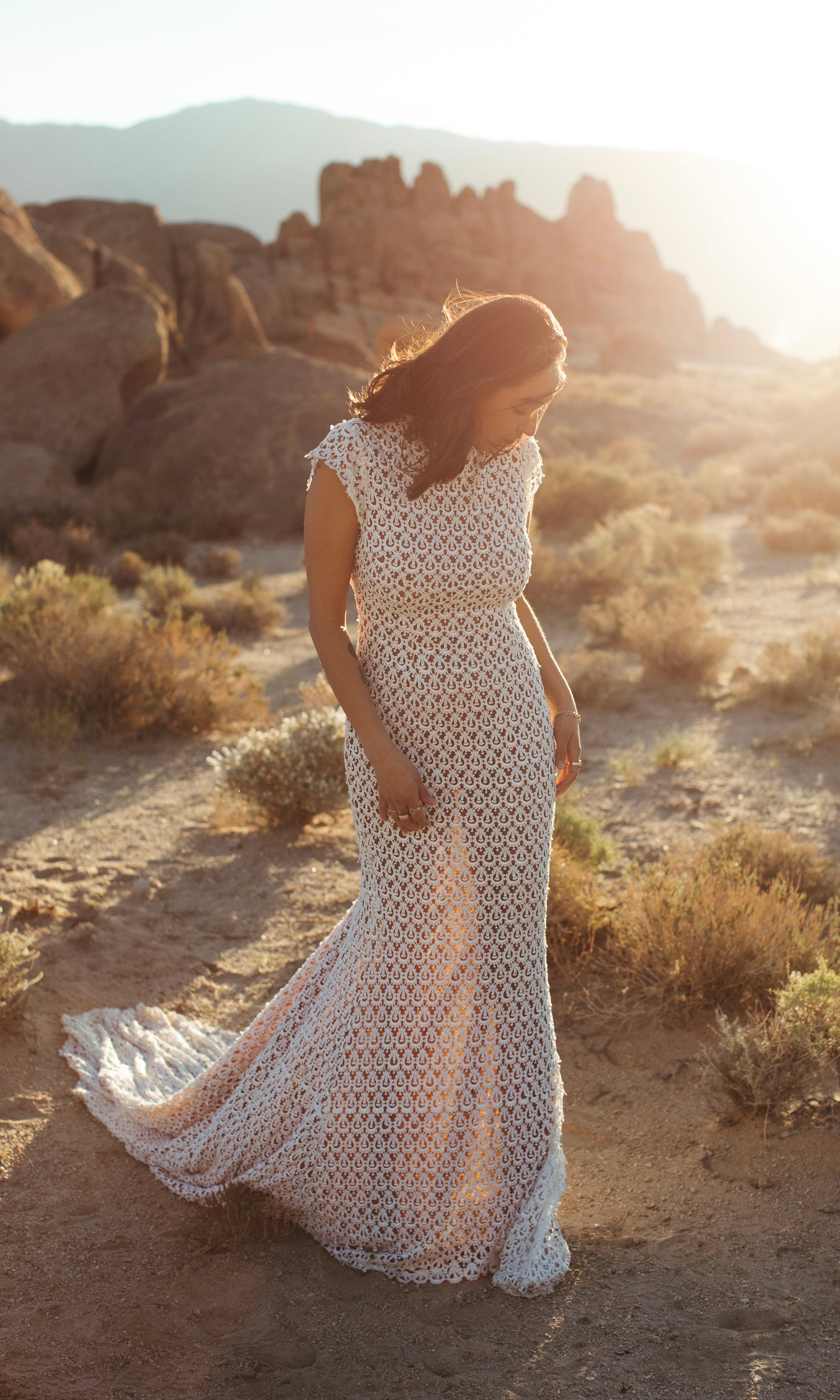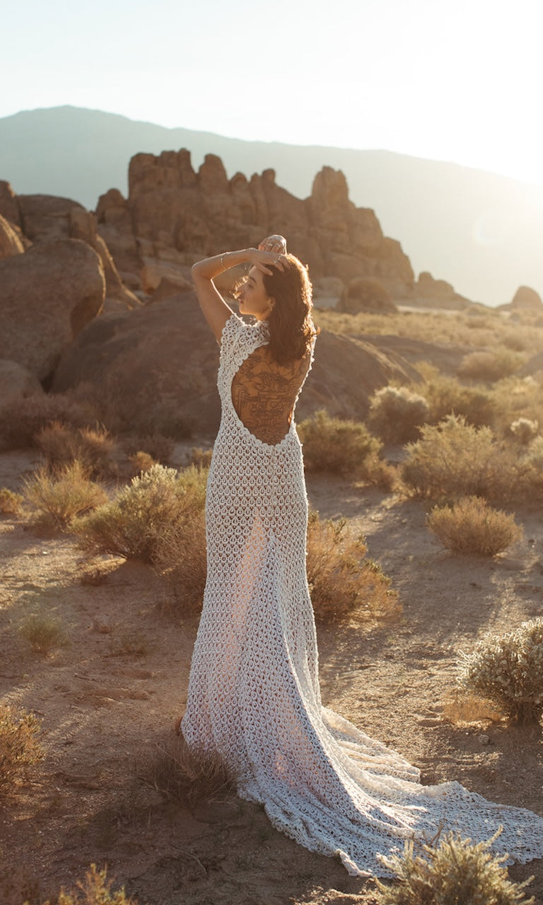 ELEGANT CROCHET BACKLESS LACE WEDDING GOWN WITH CAP SLEEVES AND HIGH NECK, FITTED BODICE WITH FIT AND FLARE SKIRT. OPEN BACK ADORNED WITH LACE TRIM DETAIL. SKIRT FLOWS OUT TO A FULL SWEEPING TRAIN. SATIN COVERED BUTTON DETAIL AT THE BACK OF NECK. SEE SISTER STYLE "Hollis".