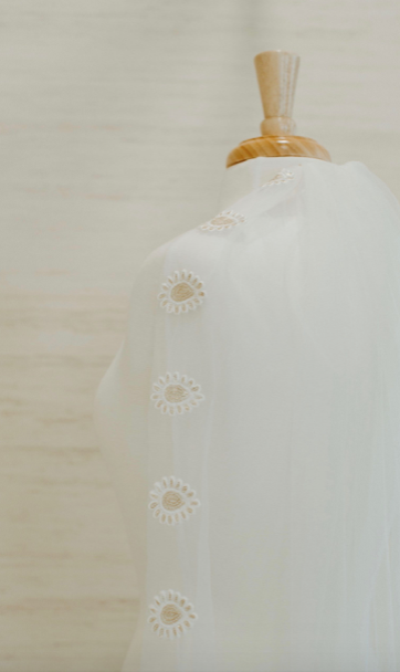 ADDING SOME SHIMMER TO YOUR BOHO GLAM LOOK, THE SOLSTICE VEIL FEATURES EMBROIDERED GOLD MEDALLIONS ALONG THE HEM OF OUR SOFT IVORY TULLE.