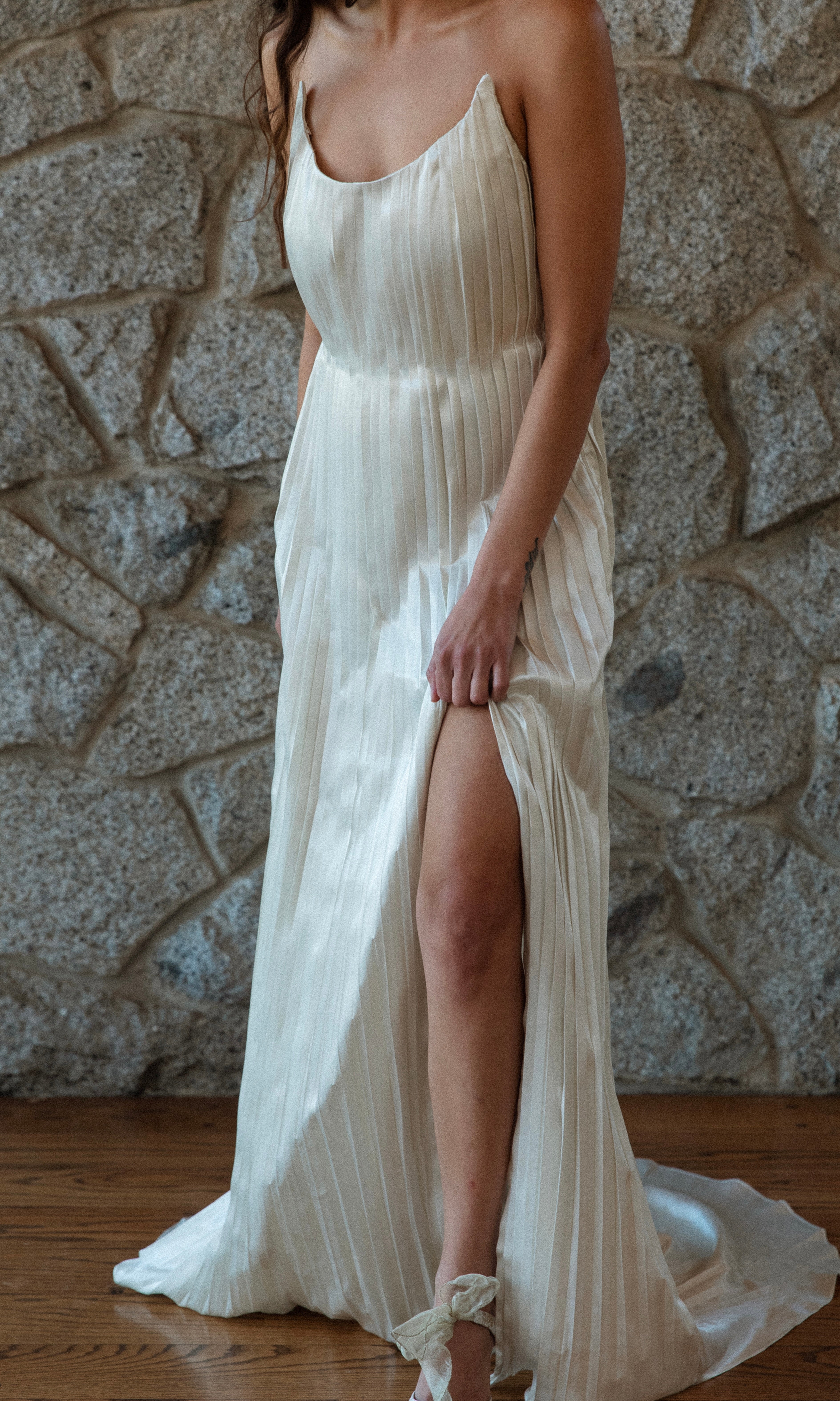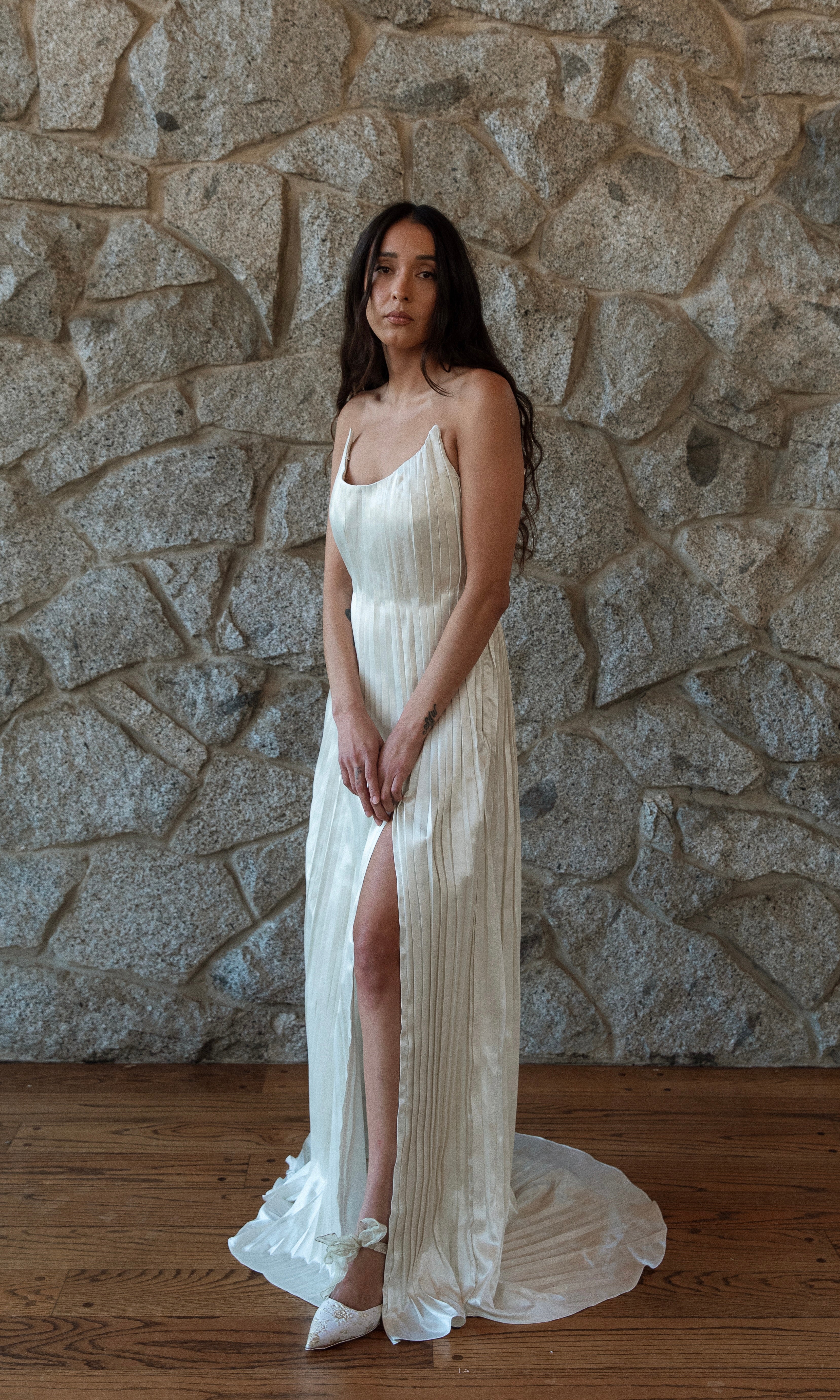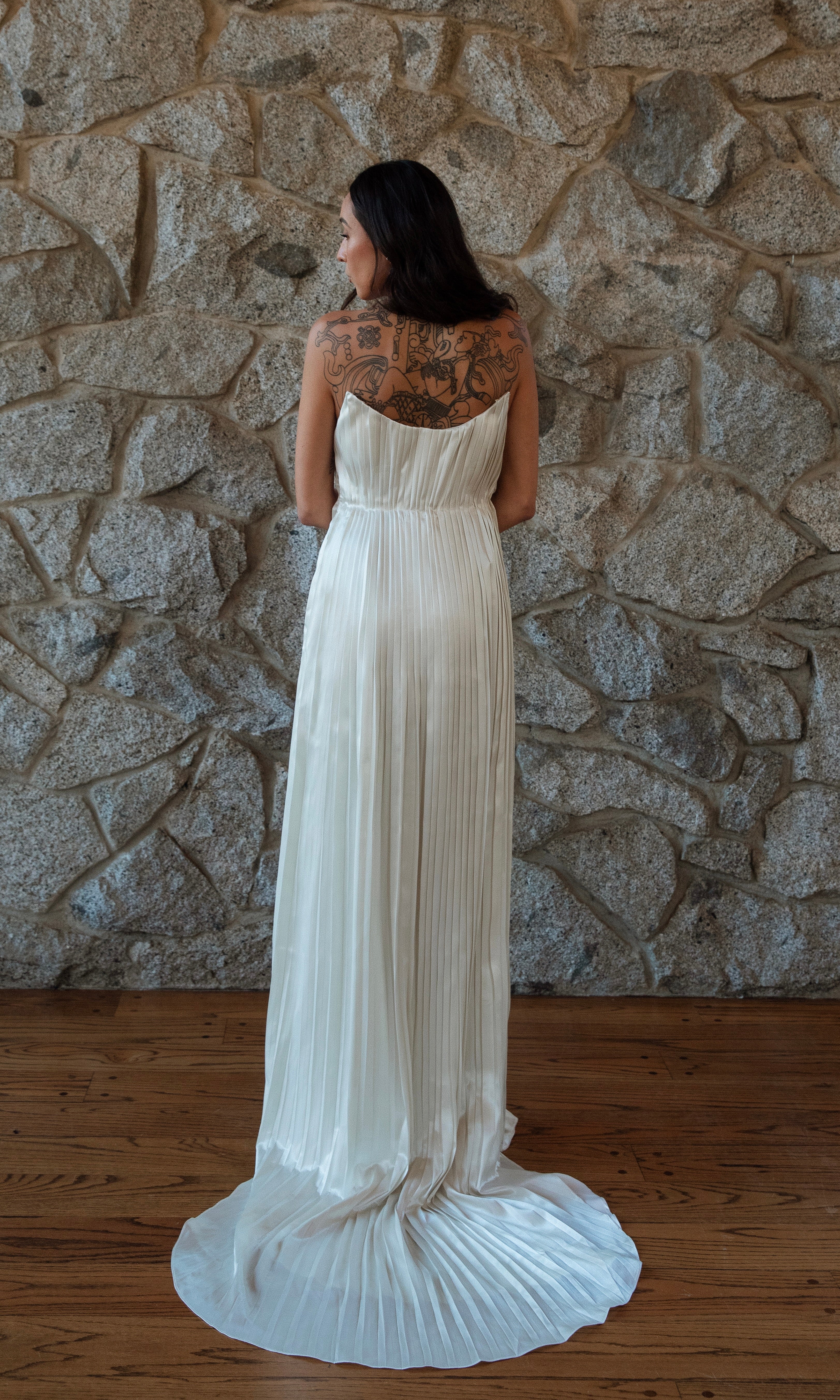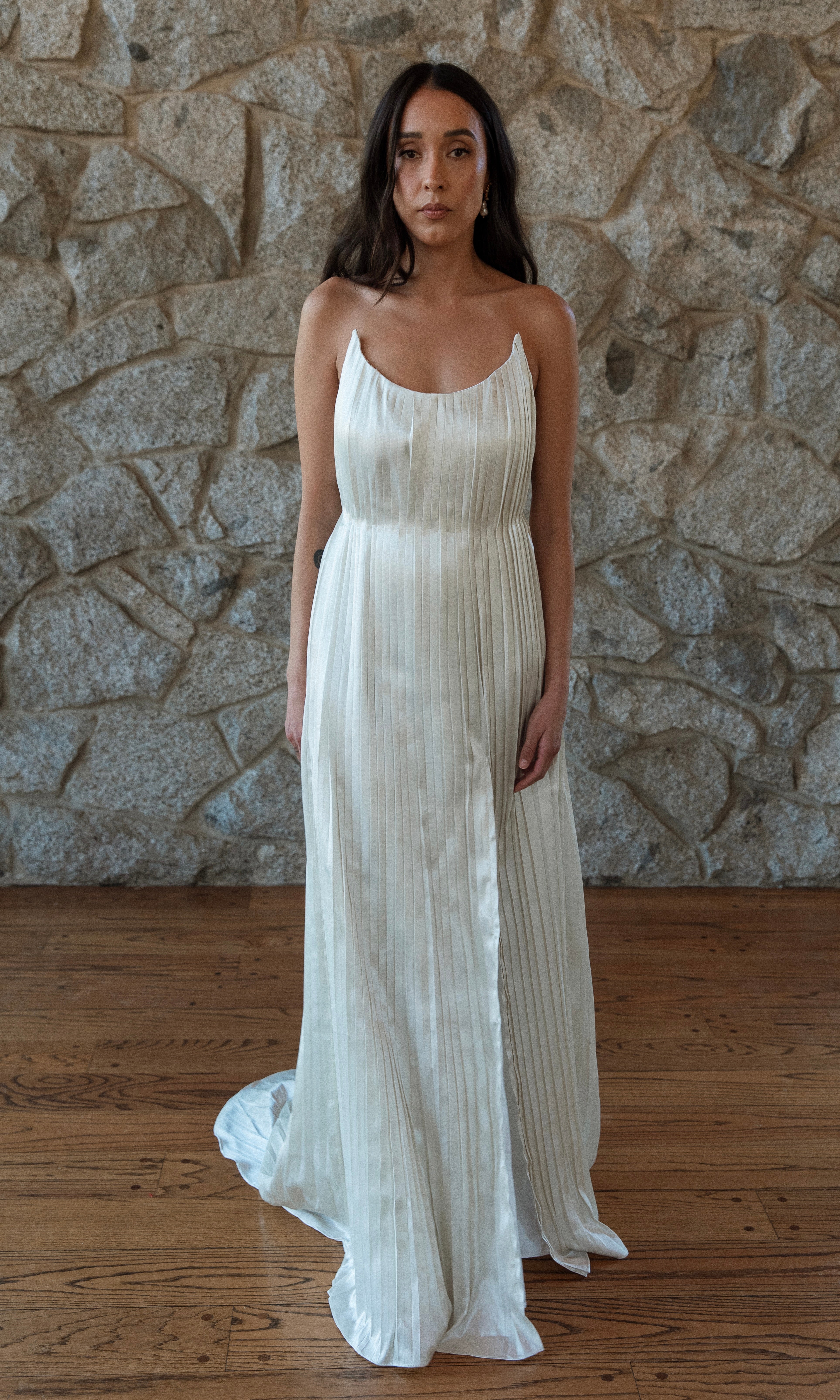 PLEATED SATIN STRAPLESS GOWN. BODICE FEATURES BONING AND EXAGGERATED POINTED BUST.