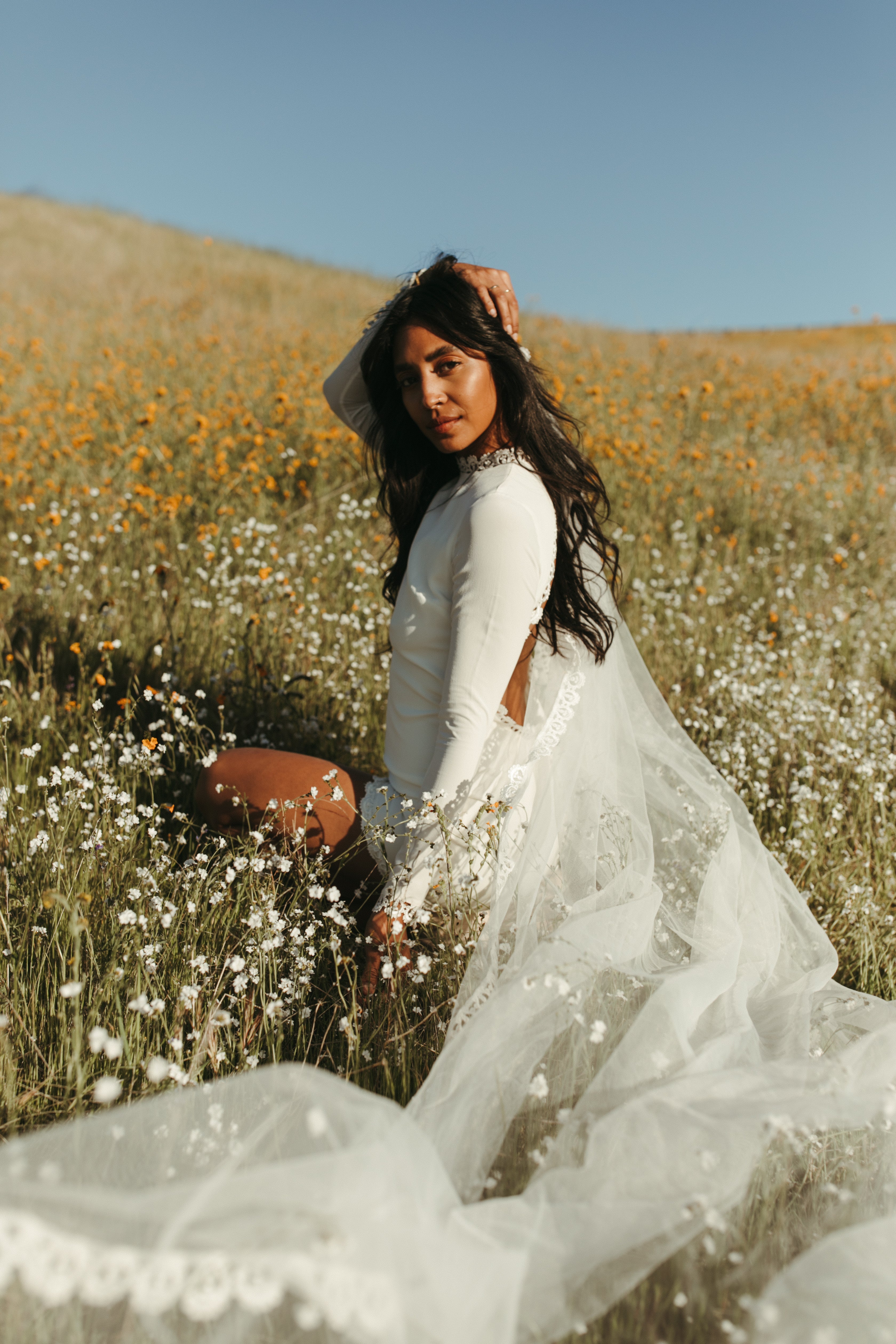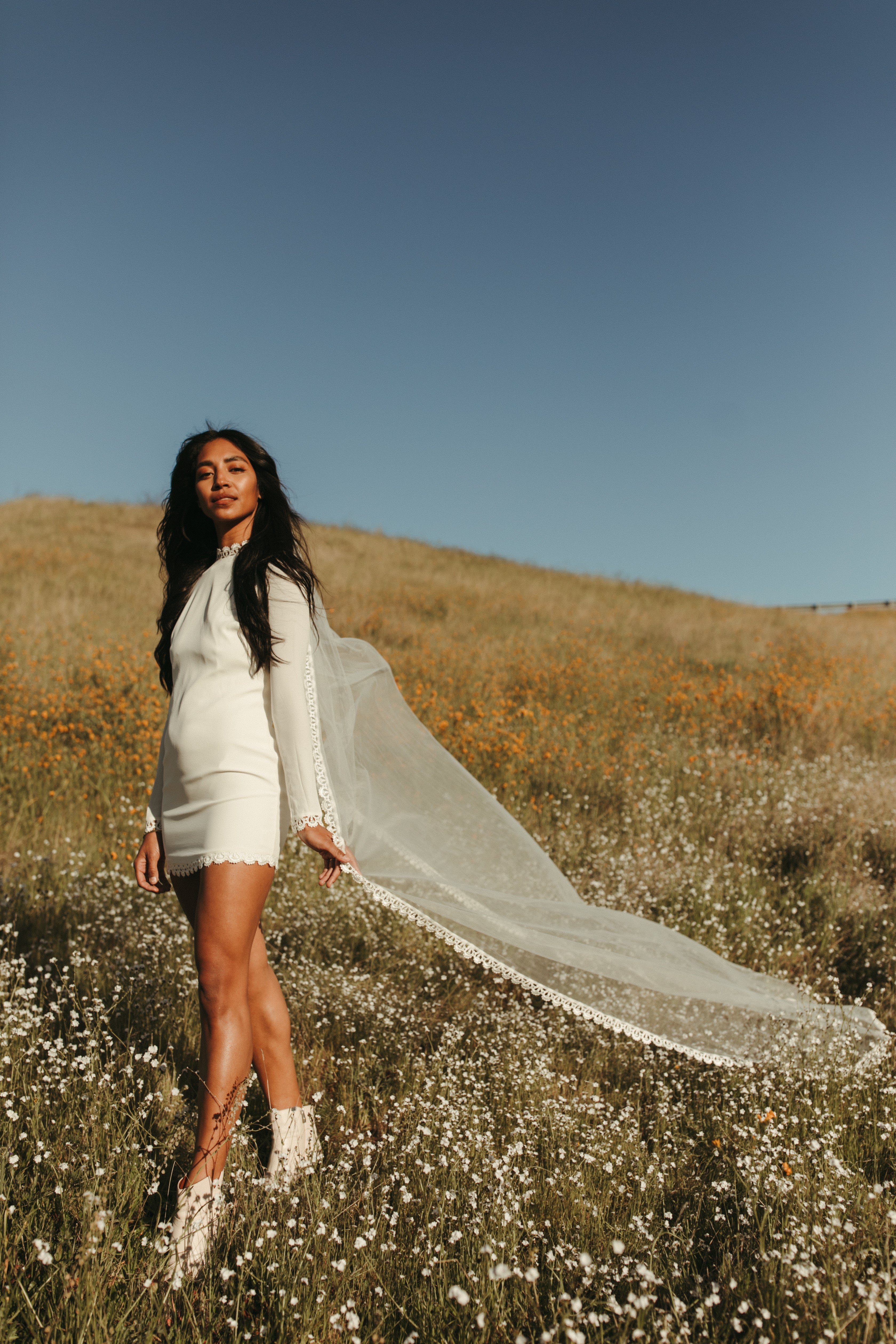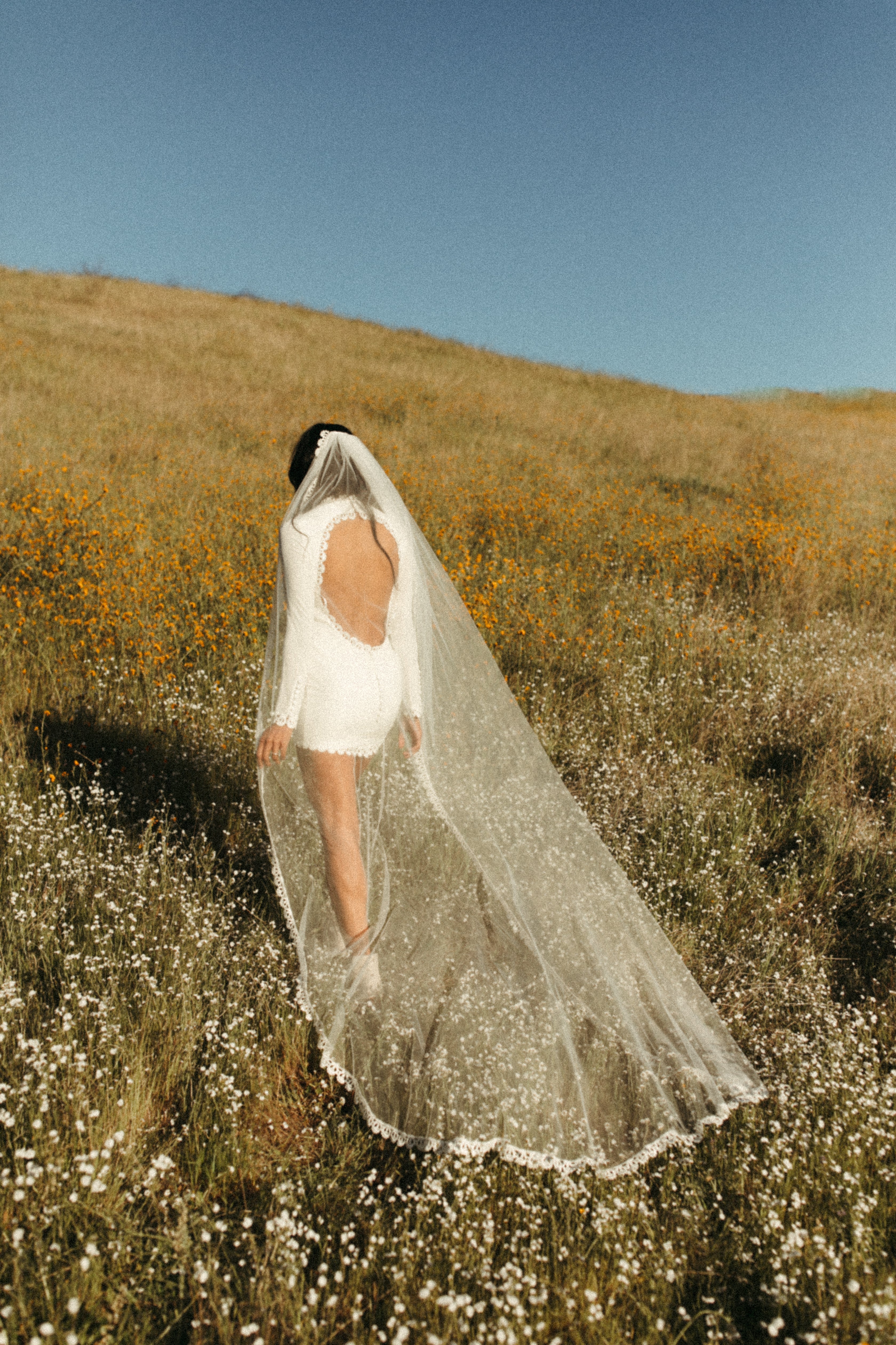Mini dress to add a touch of fun to your special day. Elegant washed silk, vintage inspired backless with long sleeves and high neck. Open back lined with lace trim detail. Satin covered button detail at the back of neck and at wrists. Also, see long sister version "Ave"