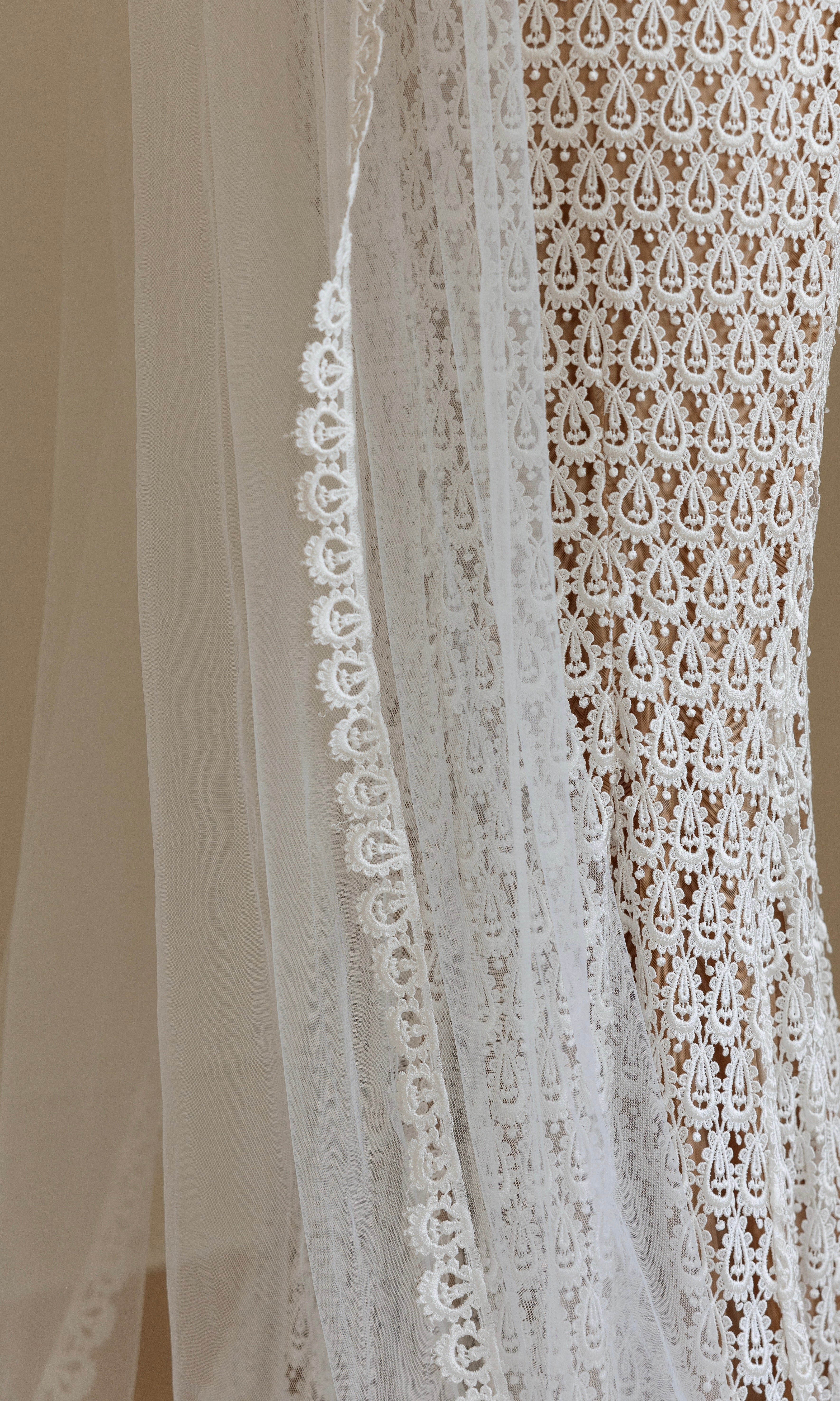 Soft tulle "Bohdi" veil, trimmed with vintage inspired teardrop crochet lace. Now available in fingertip length (42") and cathedral length (108"). Orders have a 5 week turn around from order to ship