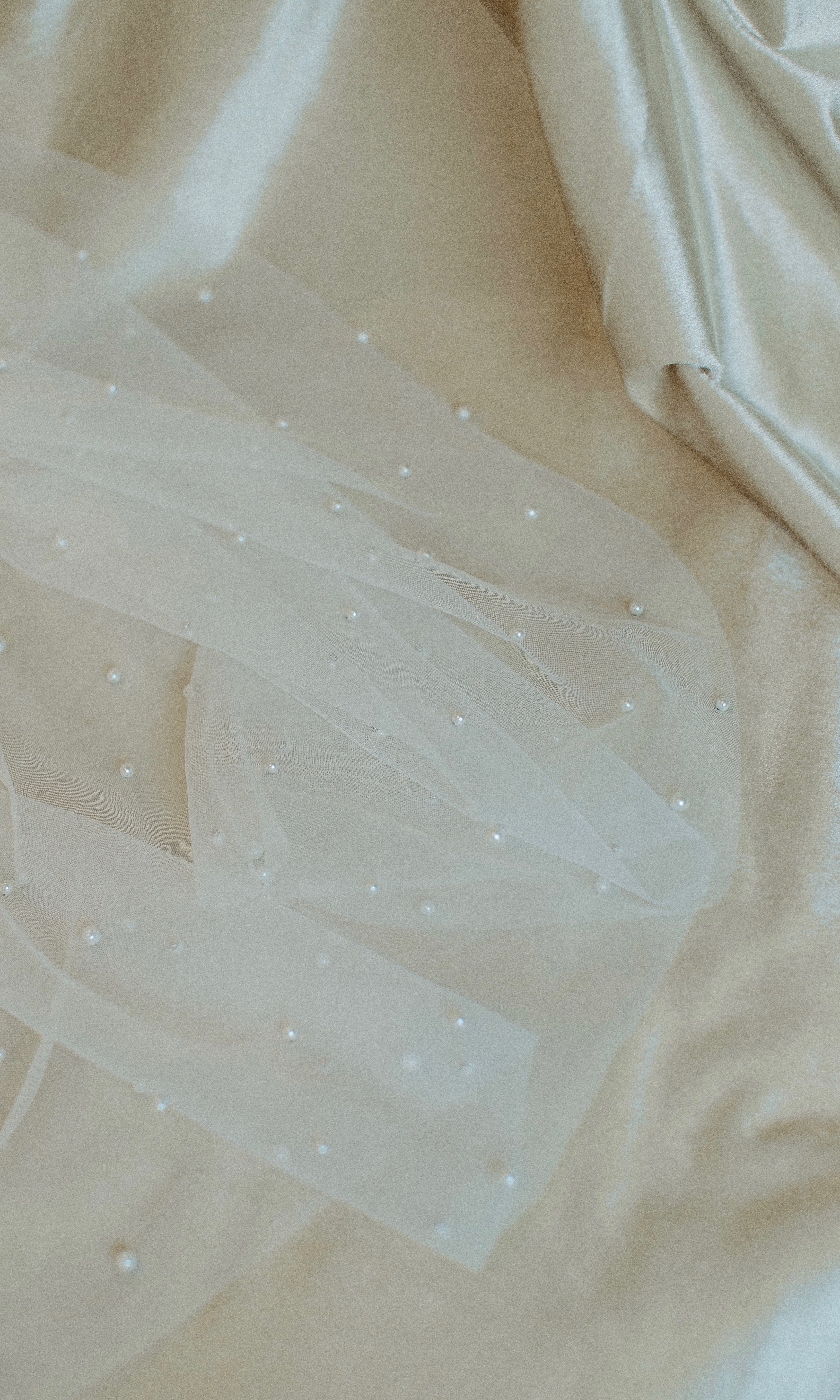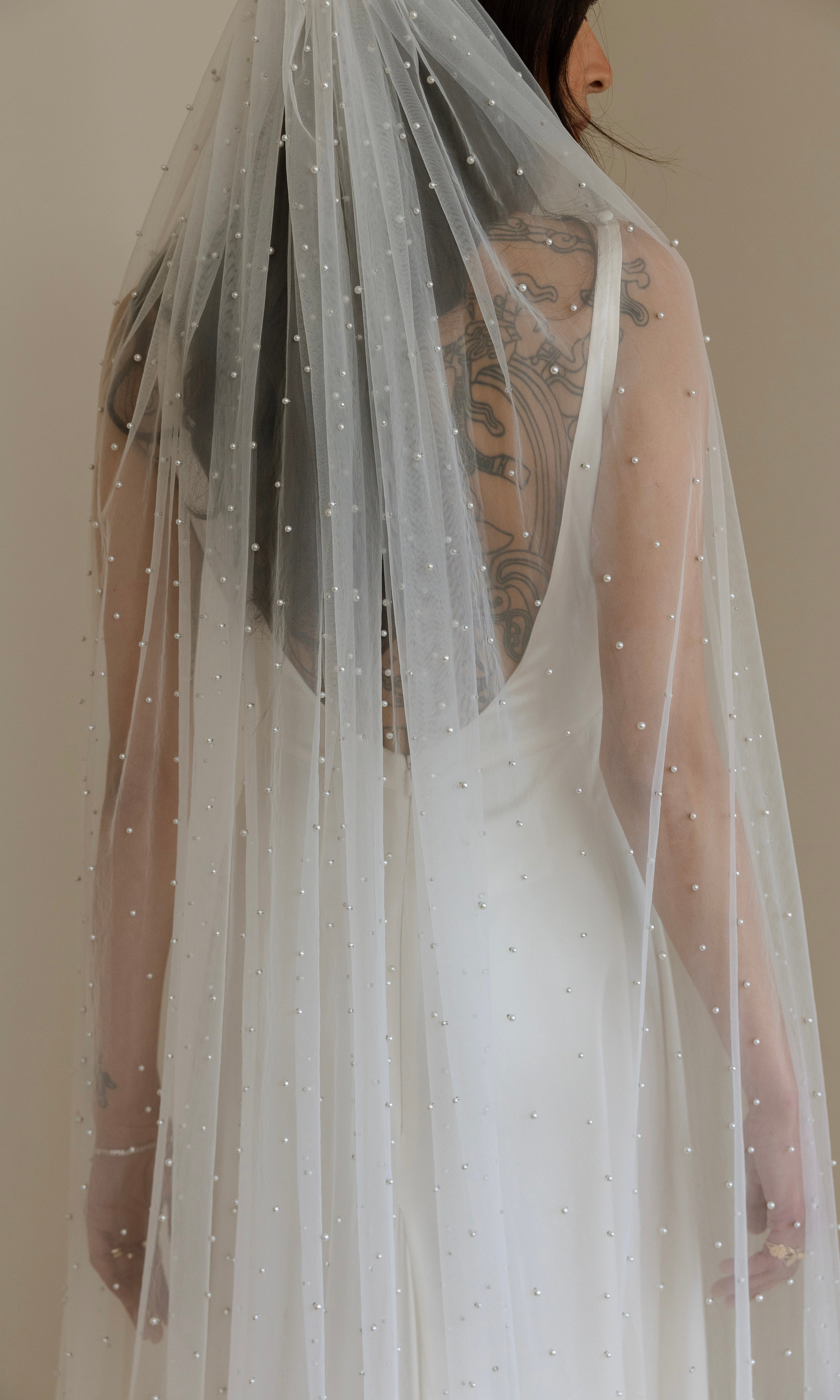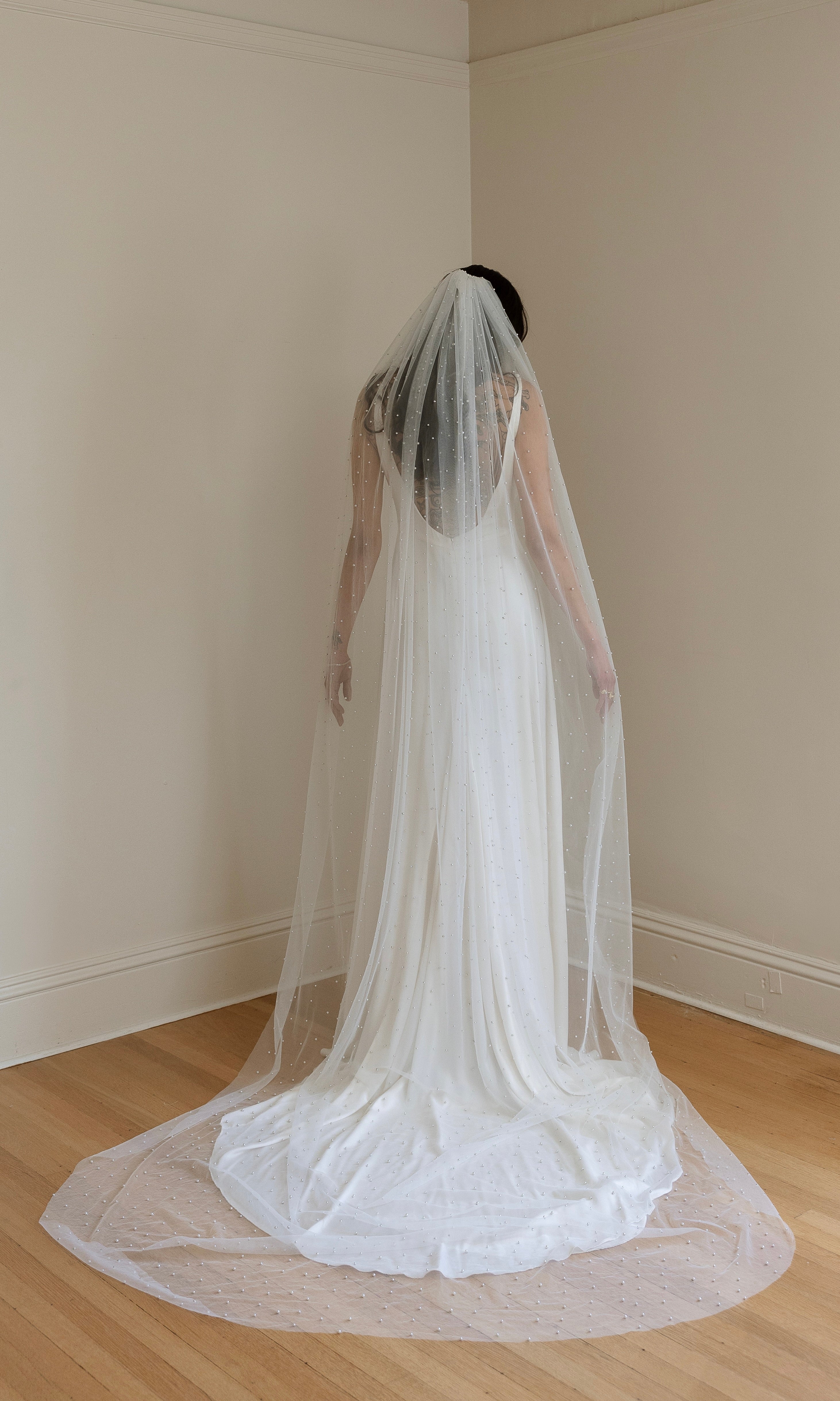 Soft ivory chiffon veil with pearls for days and days. Single Gold hair comb to complete your look. Now available in fingertip length (42") and cathedral length (108"). Orders have a 5 week turn around from order to ship