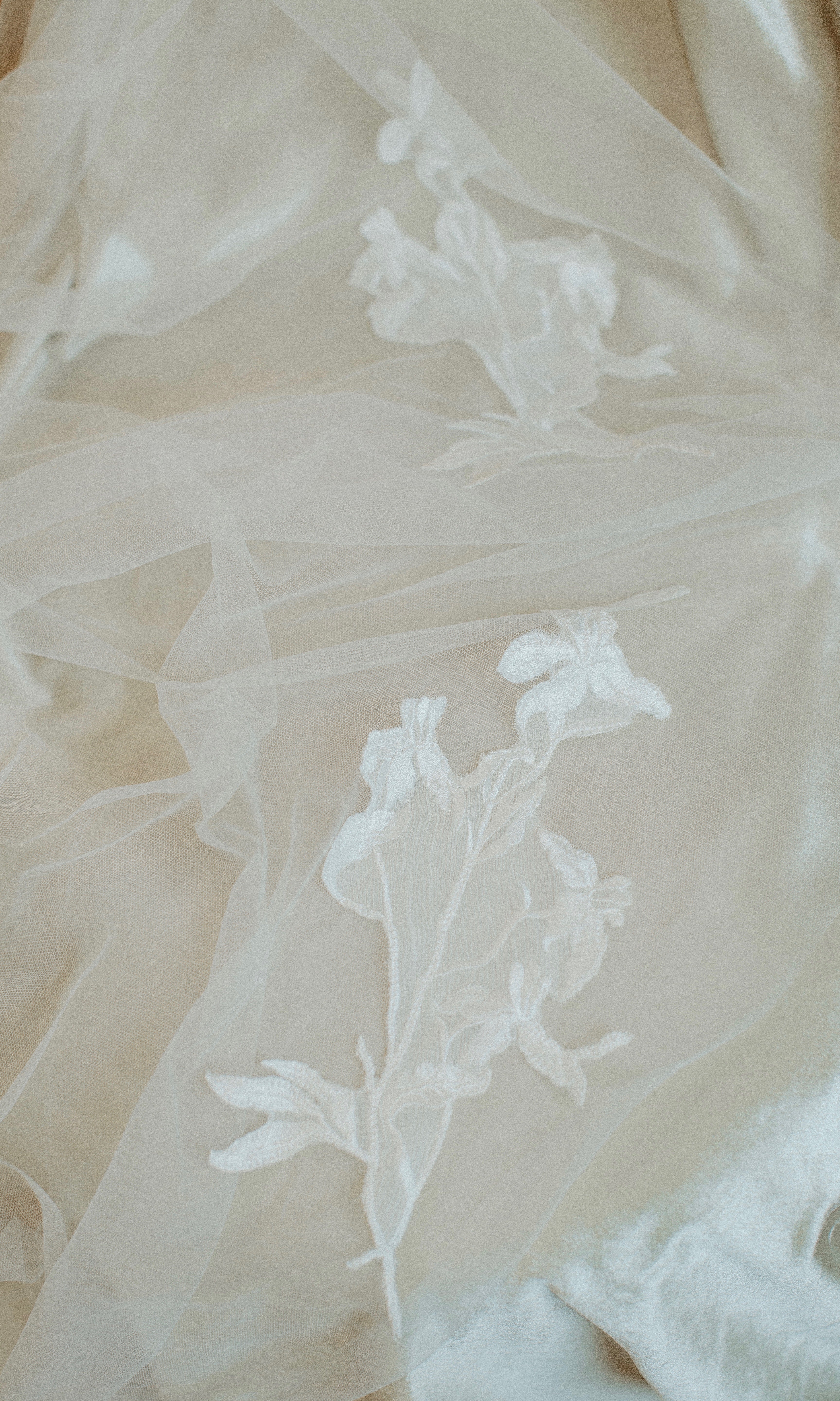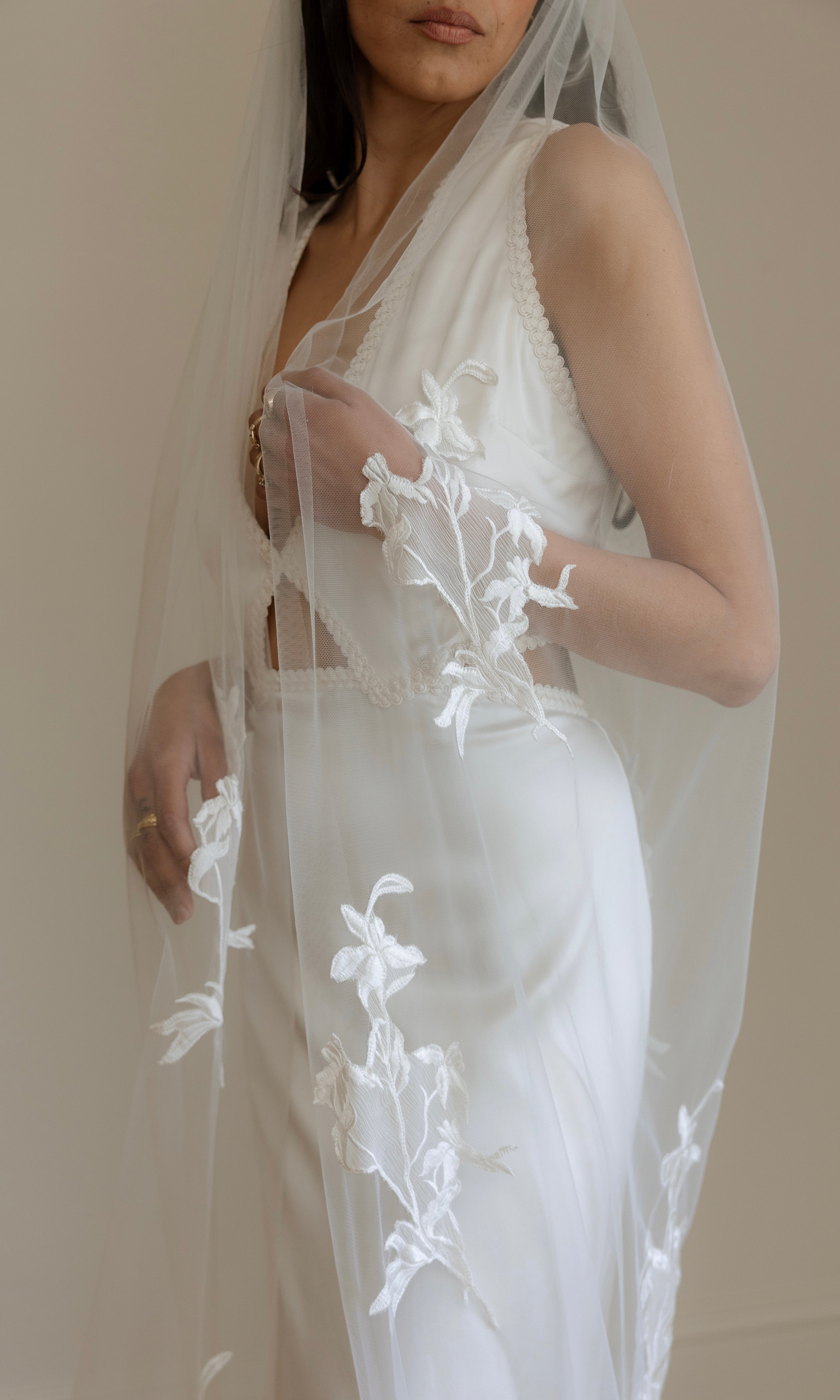 A perfect addition to your destination wedding look, the "Havana" Veil ignites beauty and wonder with embroidered floral appliqués on our soft ivory tulle. Single Gold hair comb to complete your look. Now available in fingertip length (42") and cathedral length (108"). Orders have a 5 week turn around from order to ship