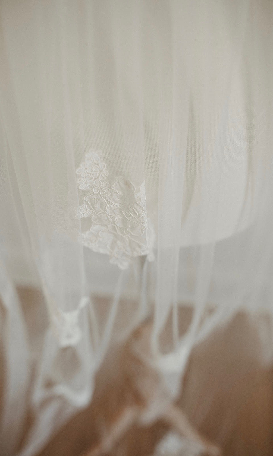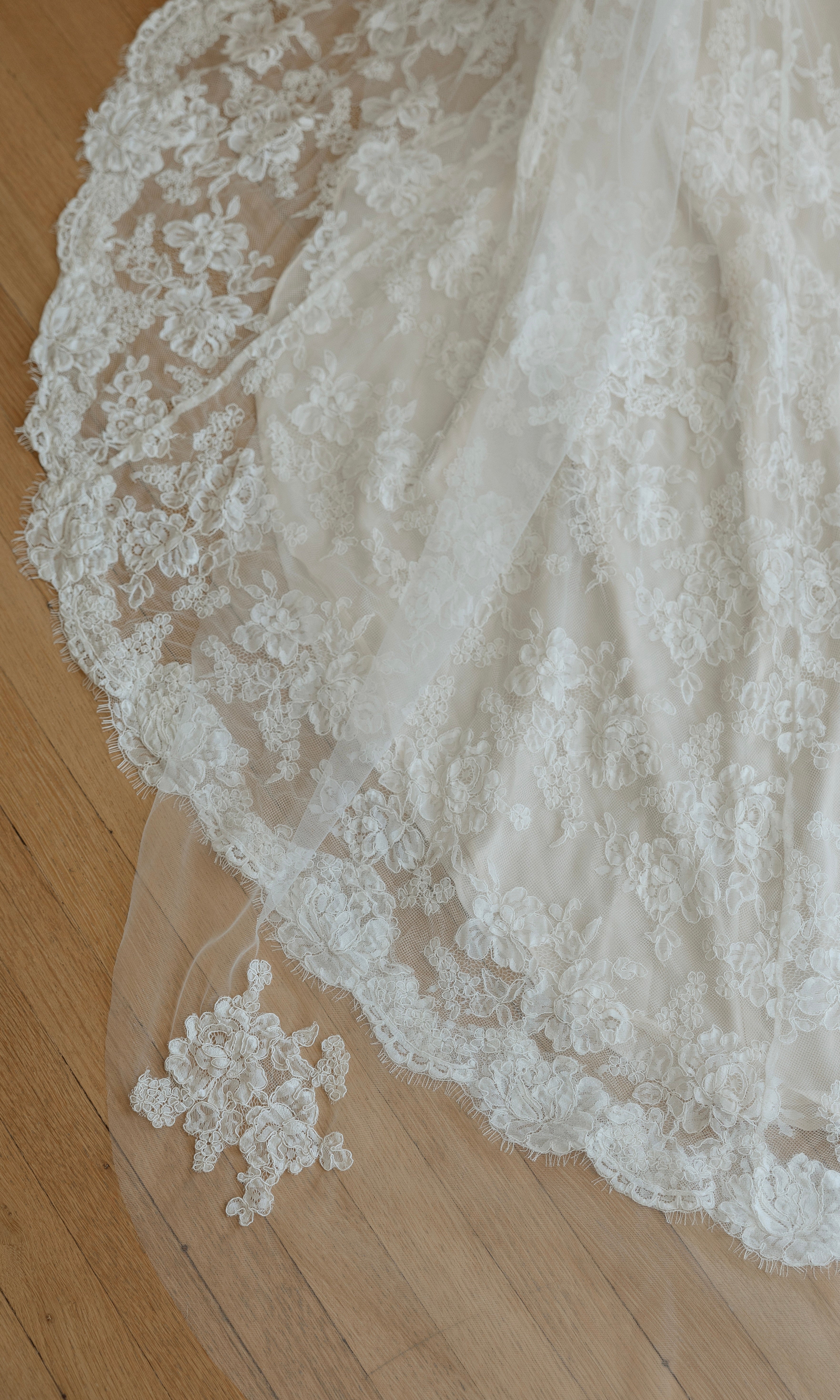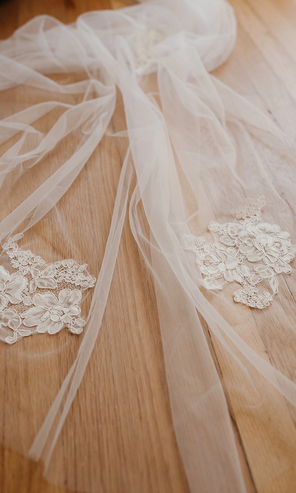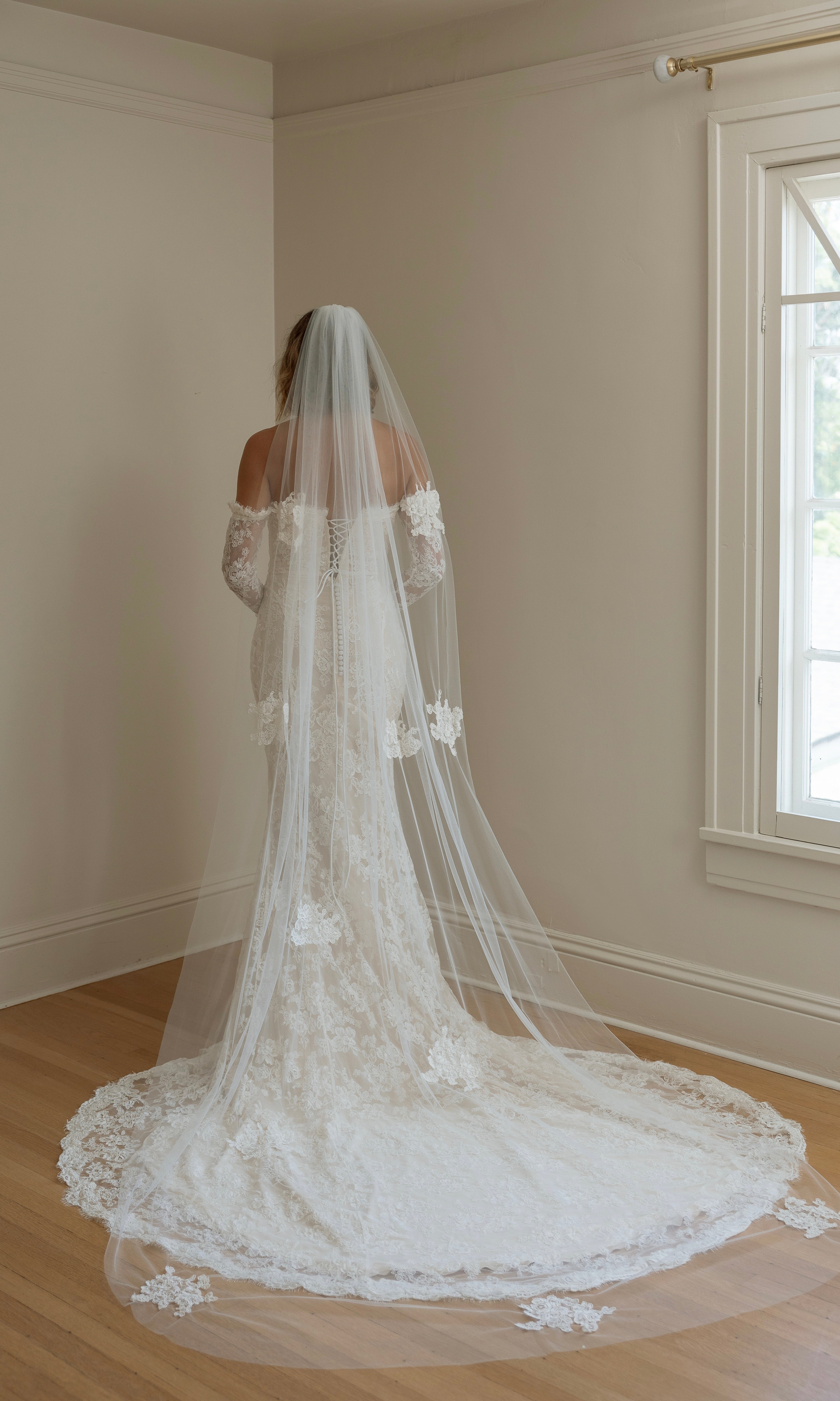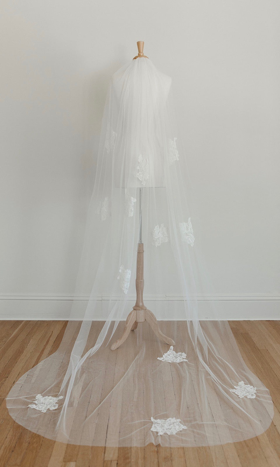 Detailed floral appliqué cut from our french corded lace. Cascading appliqué adorns the soft tulle. Now available in fingertip length (42") and cathedral length (108"). Orders have a 5 week turn around from order to ship