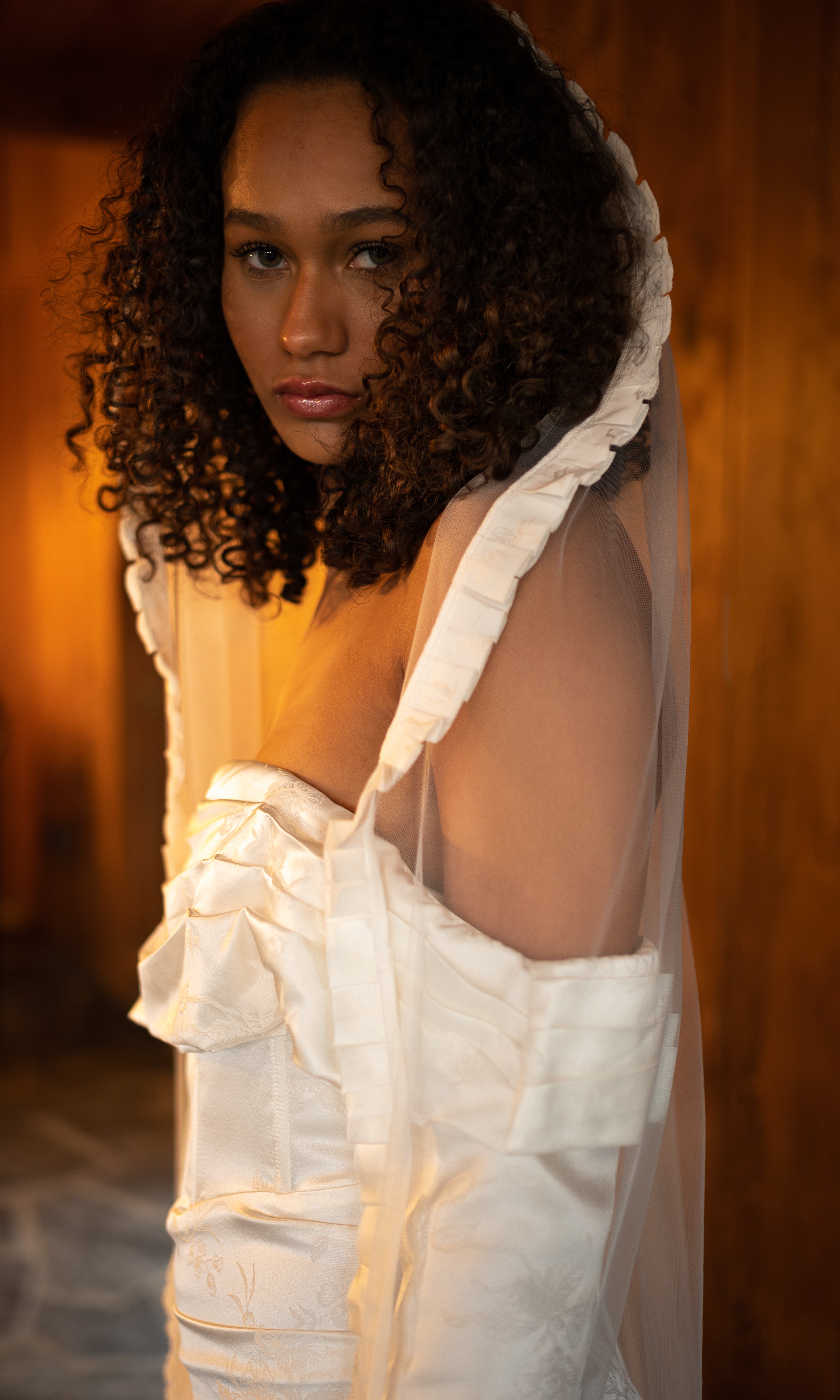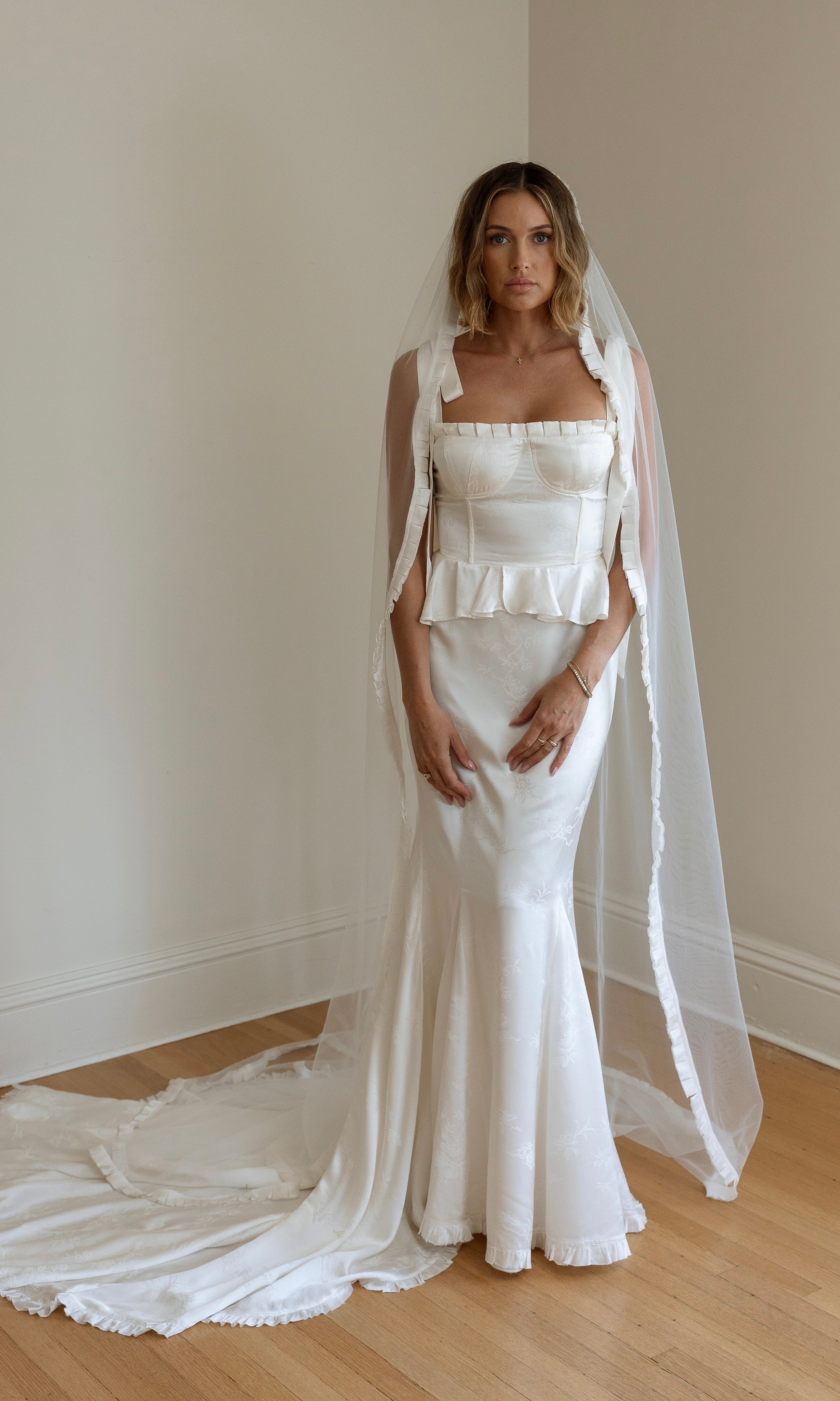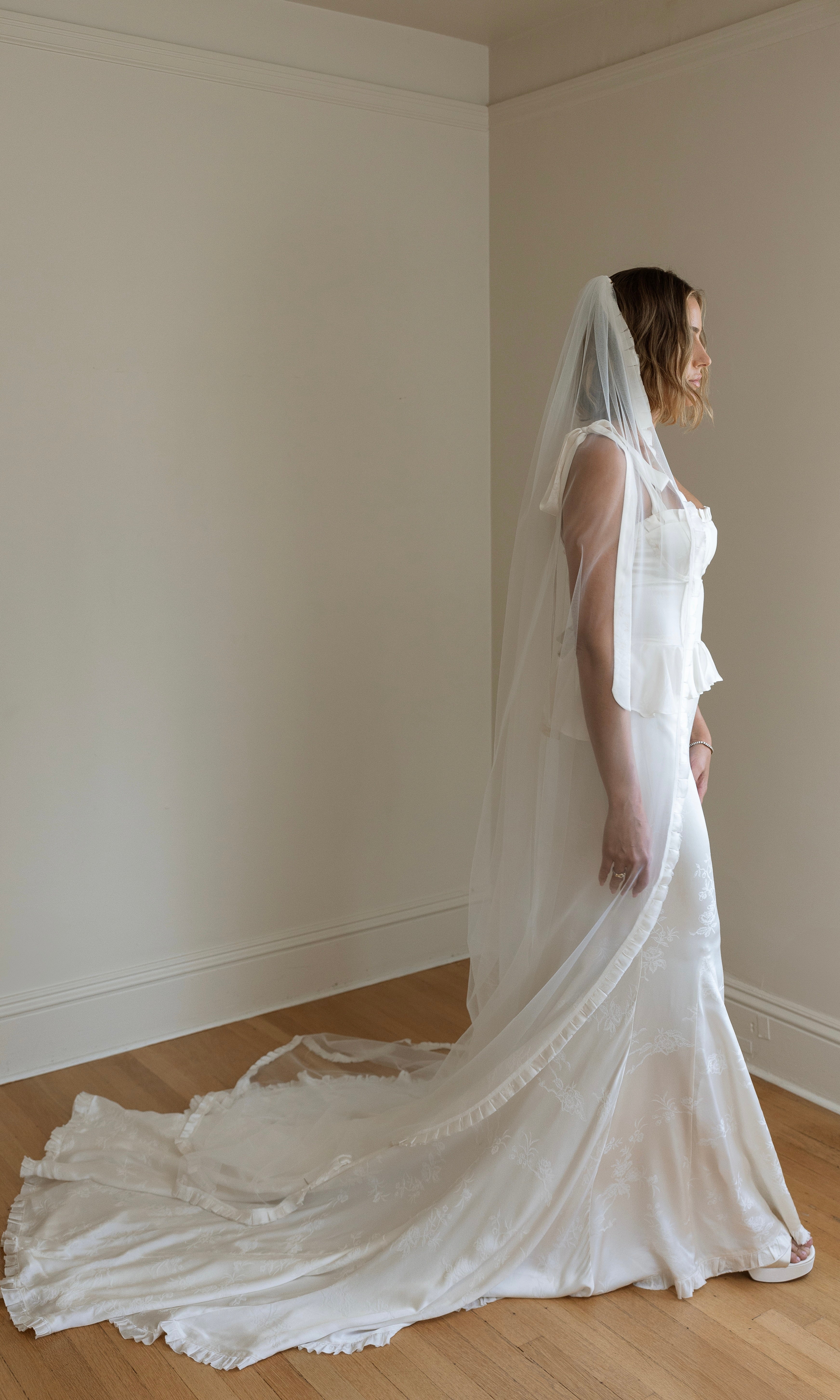 The "Wren" Veil features our lux floral jacquard silk along the hem of our soft ivory tulle. For a romantic look to kill. Single gold hair comb to complete your look. Now available in fingertip length (42") and cathedral length (108"). Orders have a 5 week turn around from order to ship