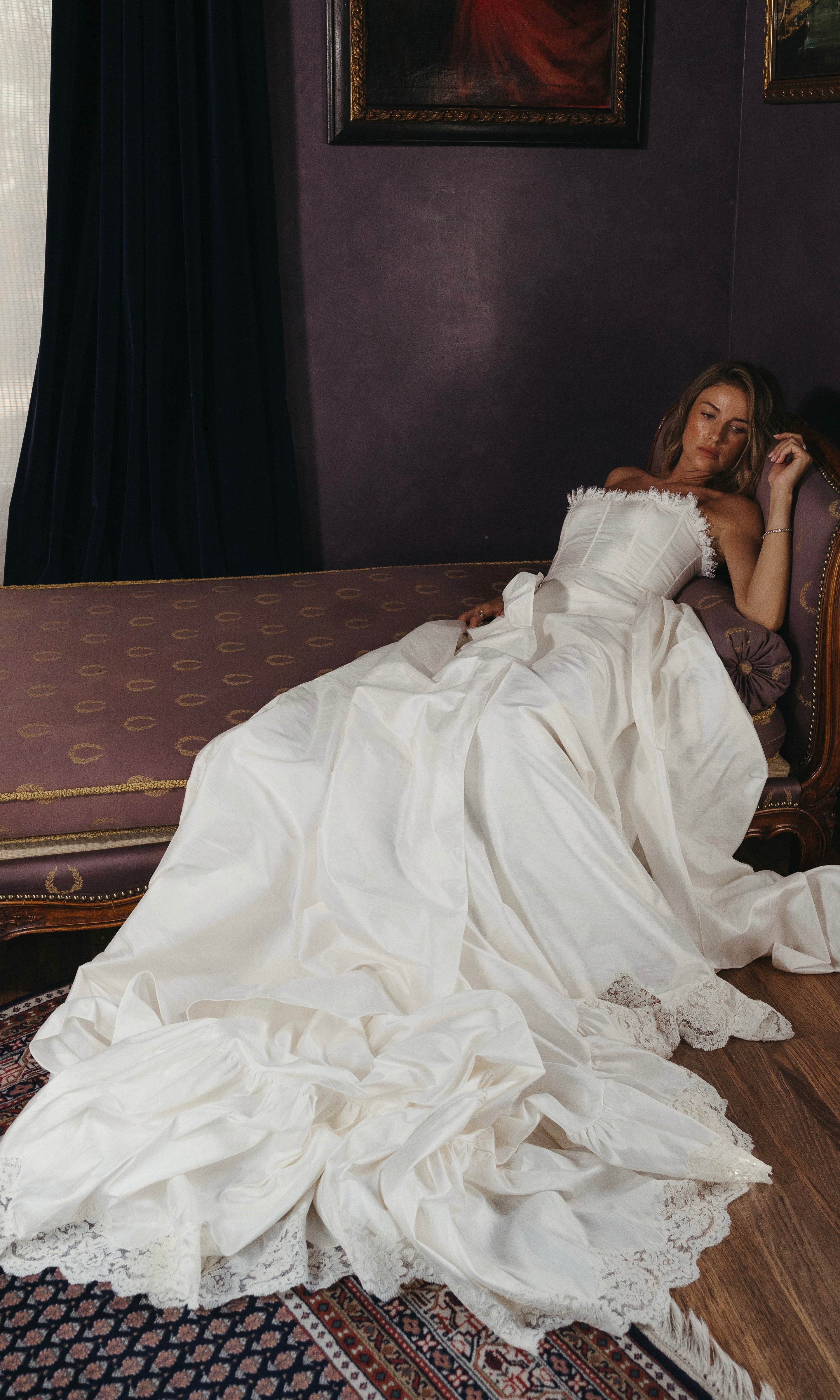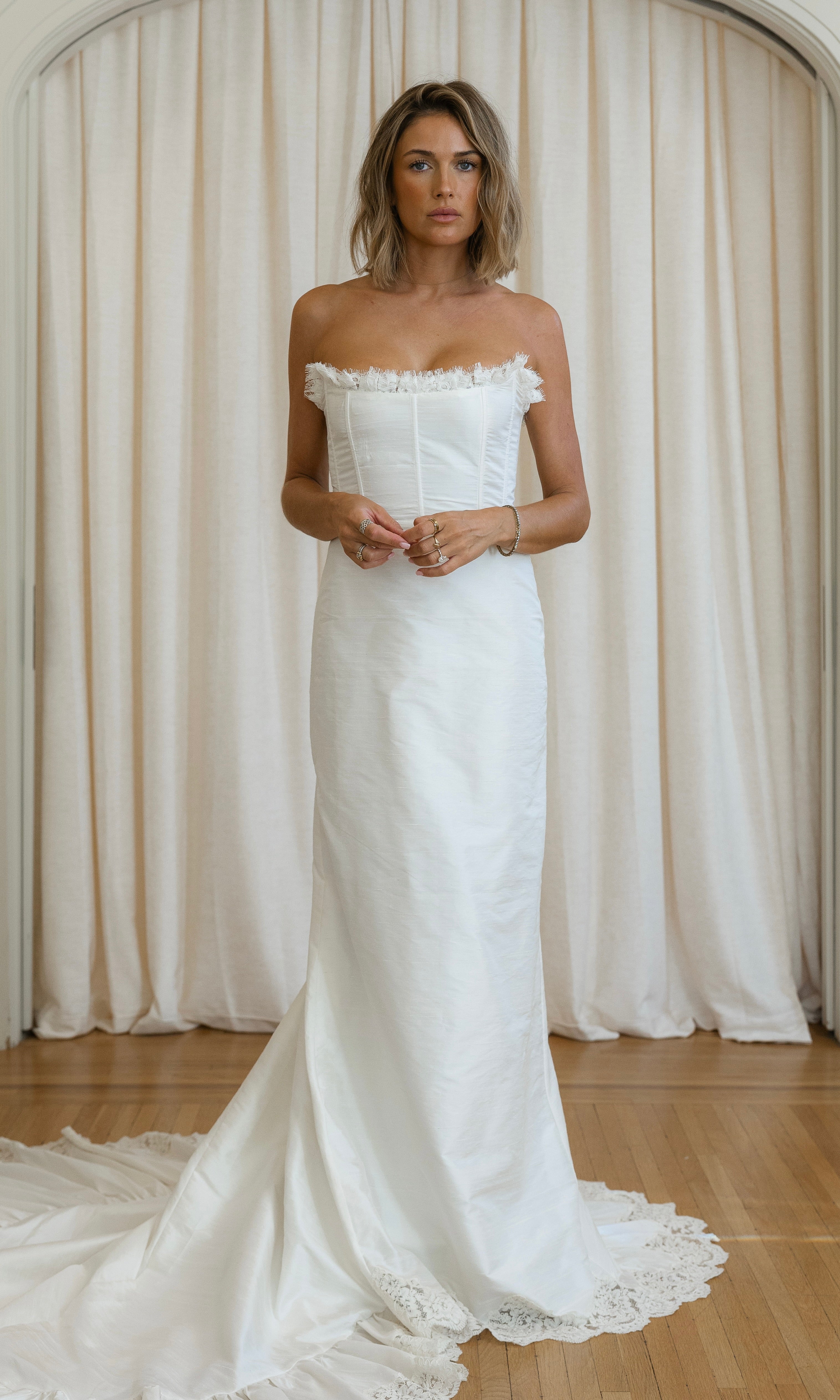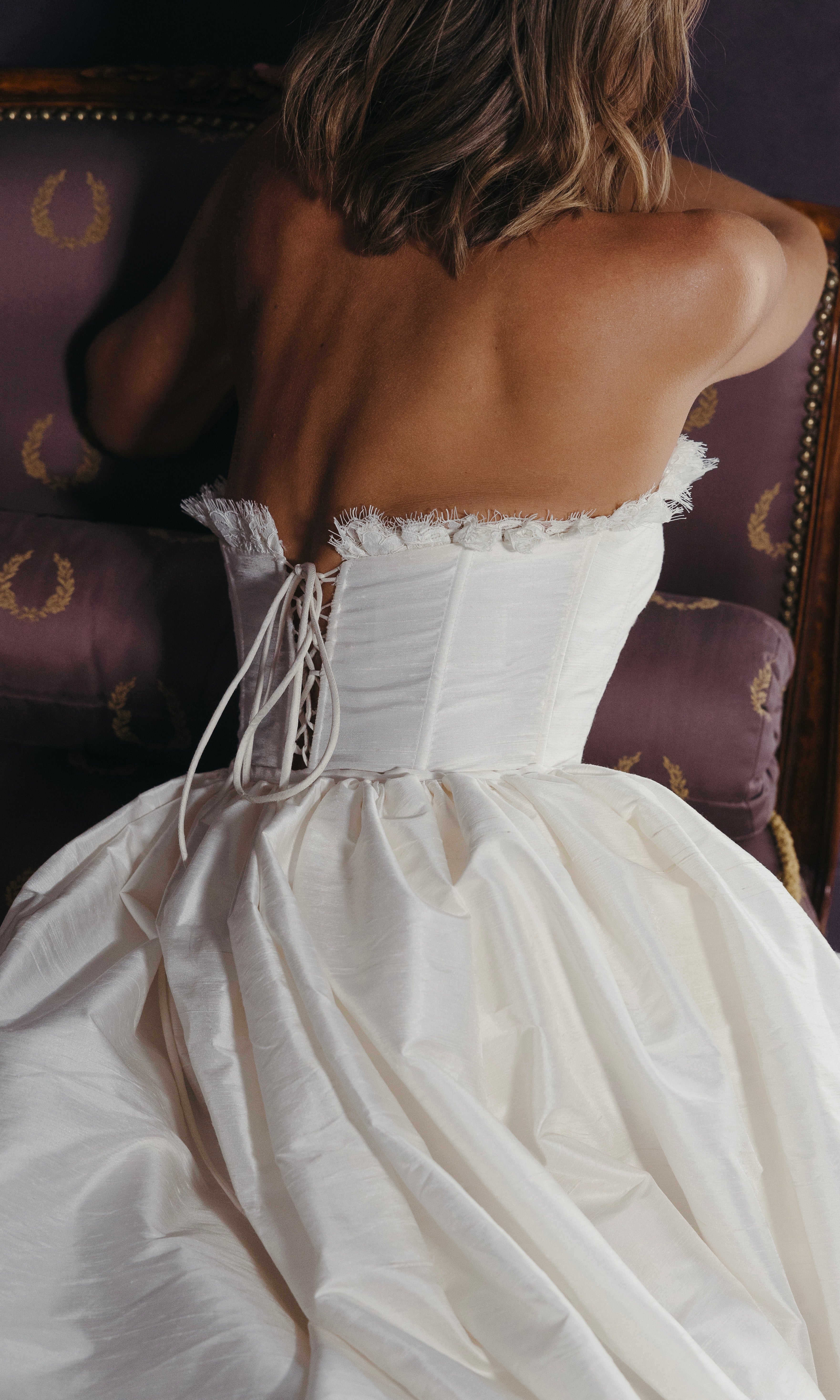 Slub silk corset wedding gown. Lace box pleat trim lines the bust and back. Exposed French corded lace along bottom hem and throughout gathered train. Corset laced back for secure fit. Overskirt available to purchase.