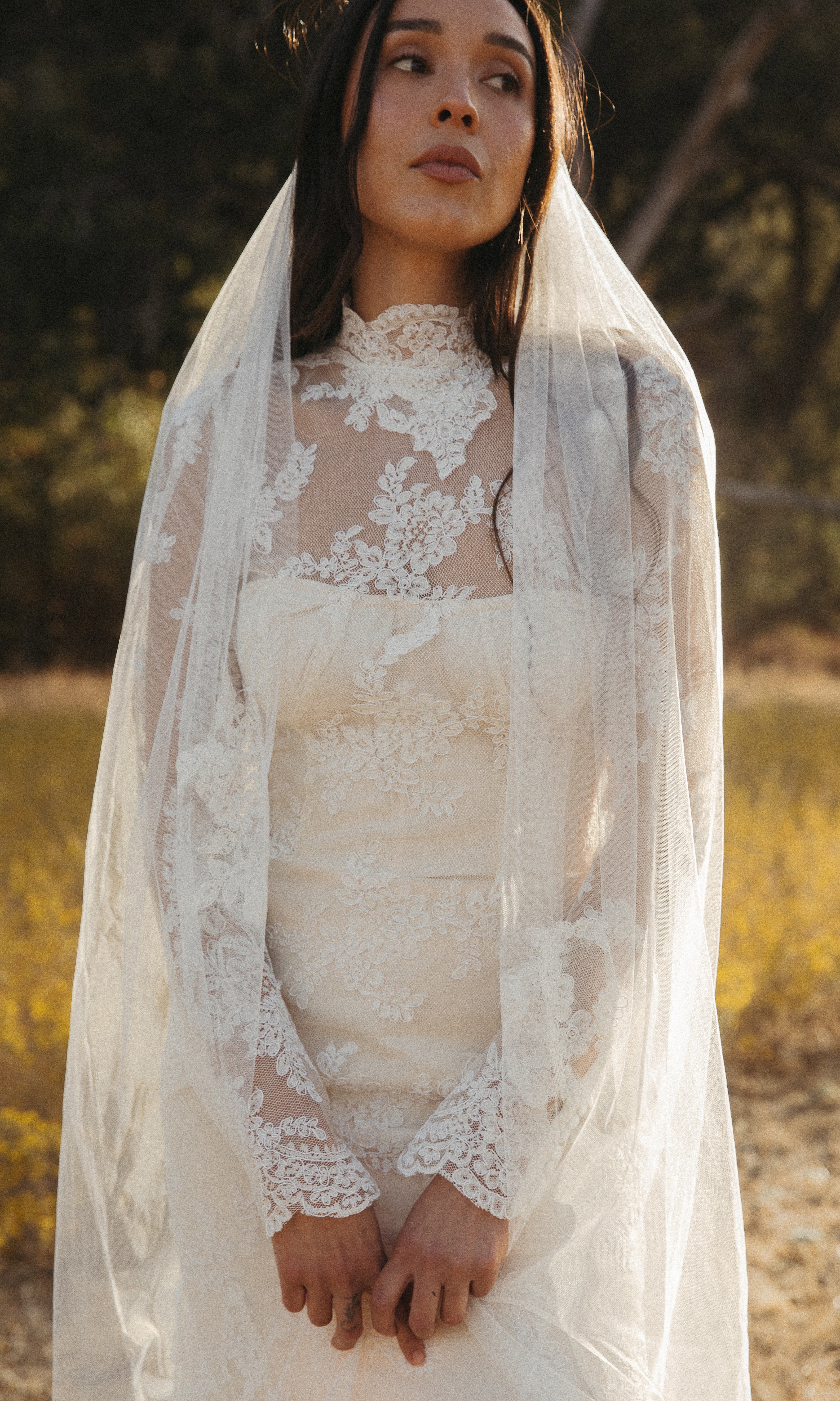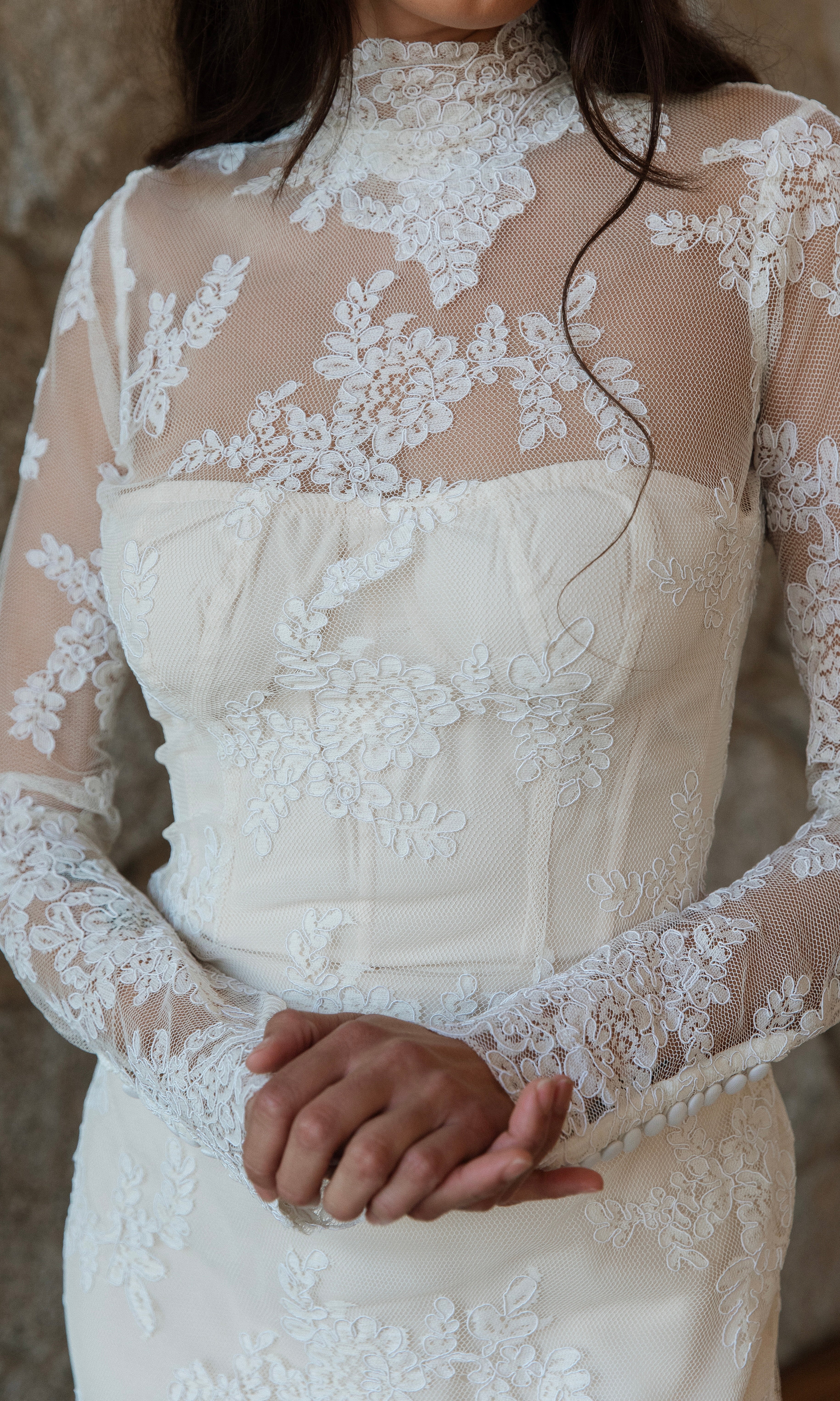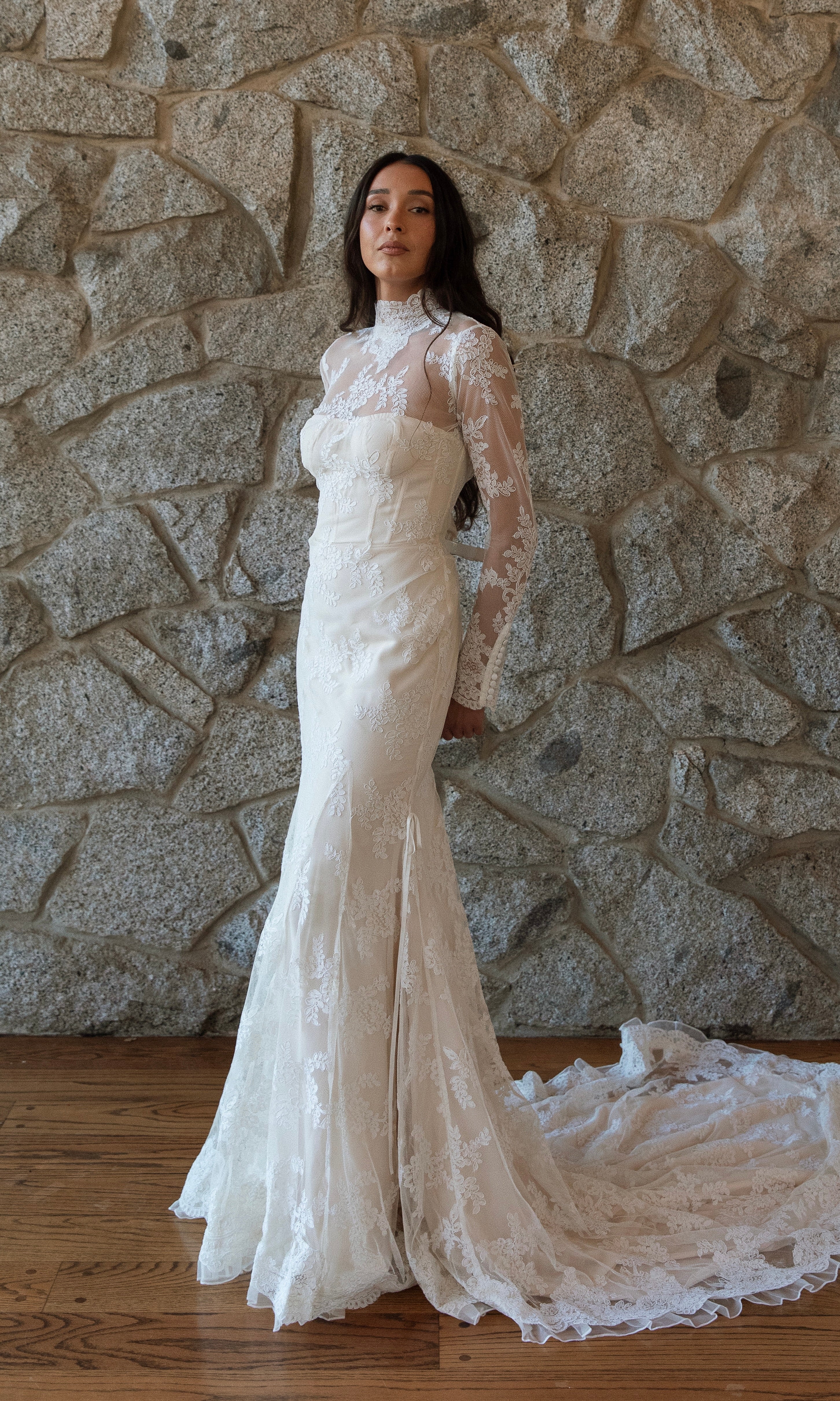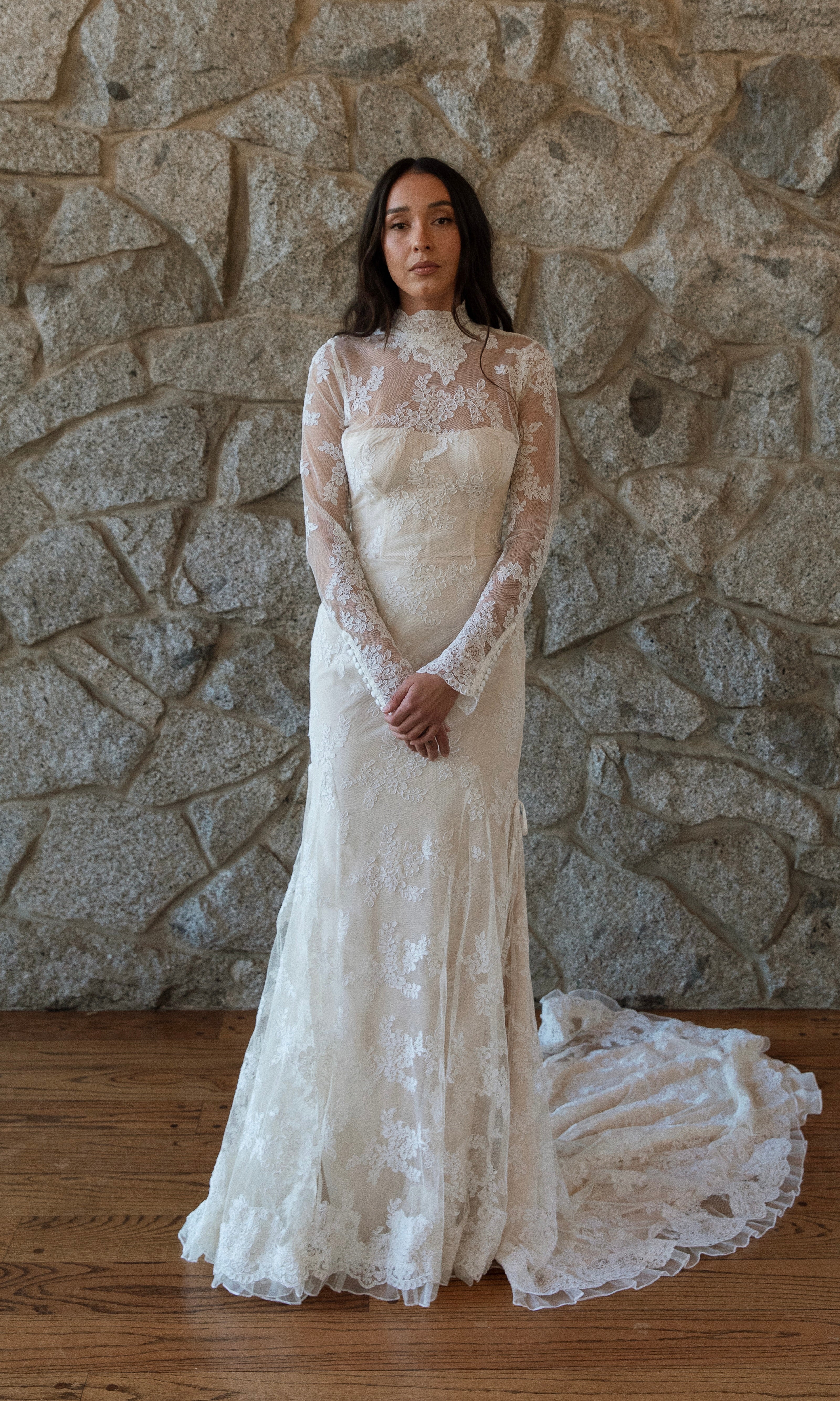 HIGH NECK, IVORY, FRENCH LACE, LONG SLEEVE OPEN-BACK GOWN. CORSET DETAILING. BLUSH SATIN LINER (IVORY LINER COLOR AVAILABLE)