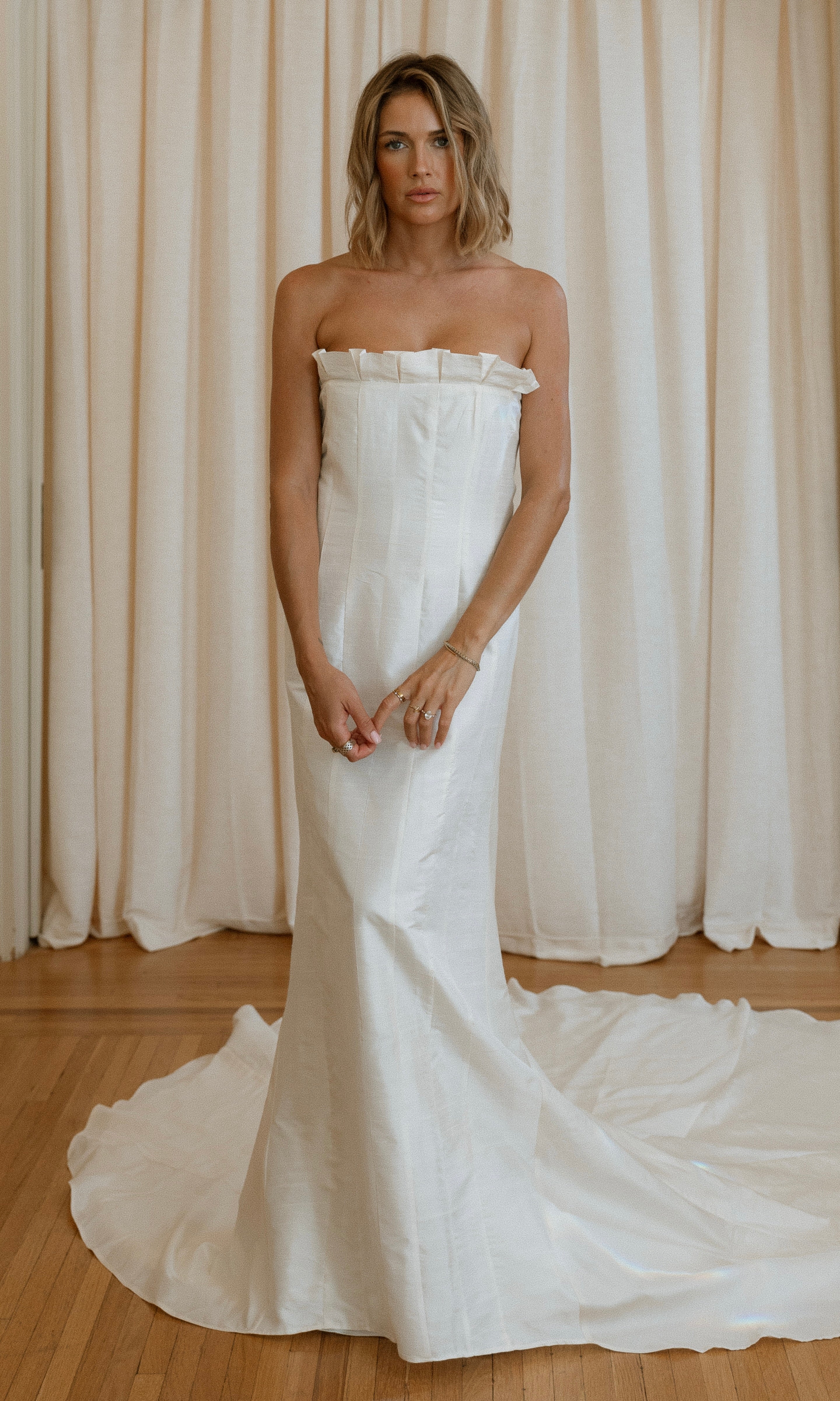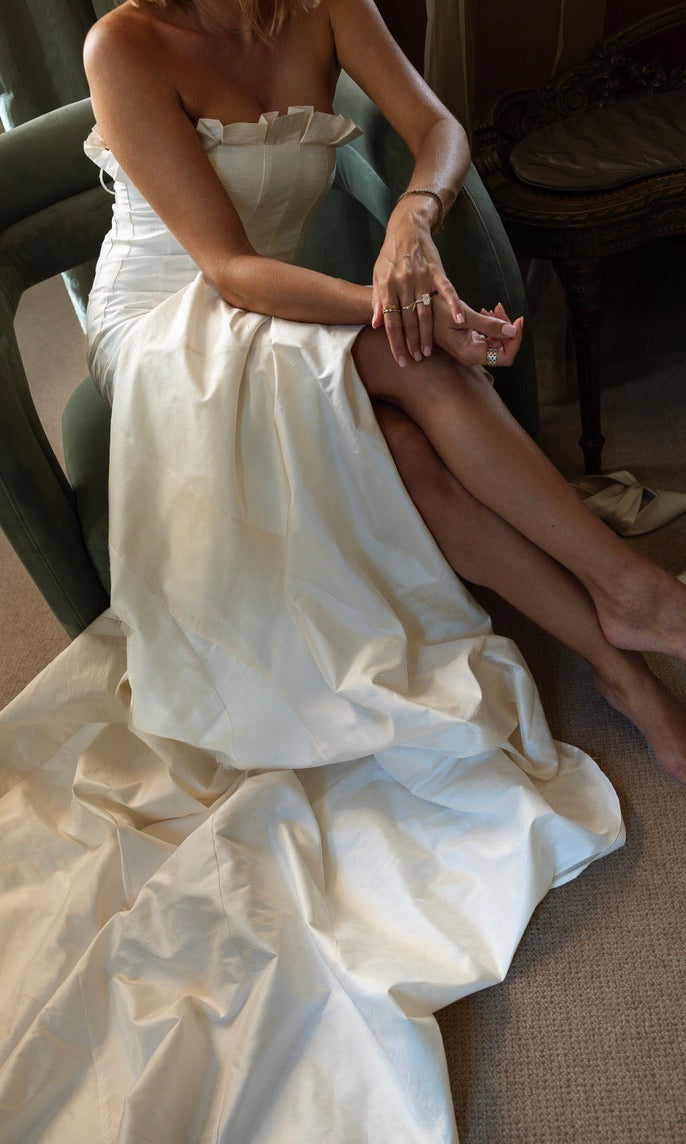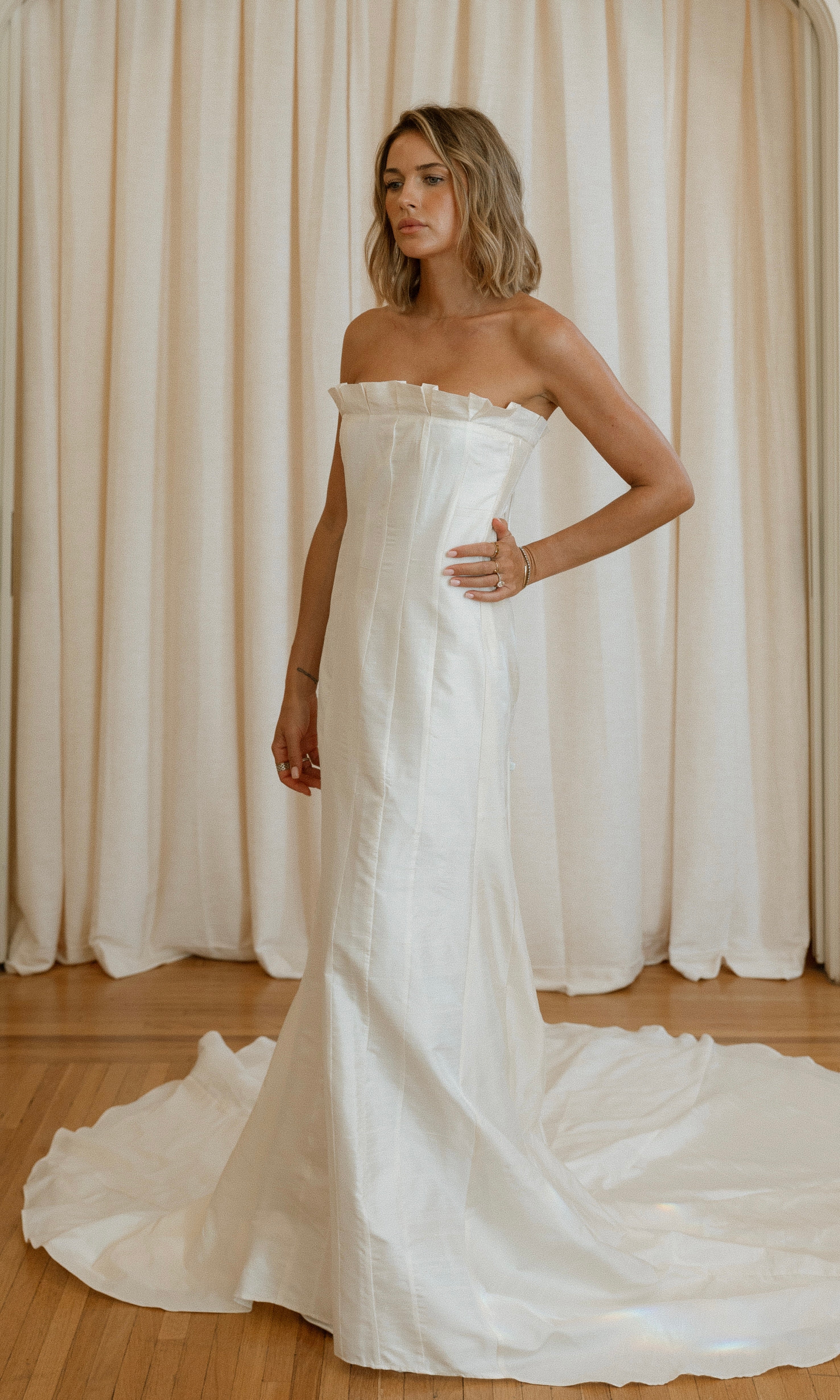 ROMANTIC FRENCH CORDED LACE BUSTIER GOWN, STRAPLESS AND FITTED BODICE WITH UNDERWIRE AND BONING. RUFFLED LACE DETAIL ALONG THE BUST, DETACHABLE LONG UNLINED SLEEVES WITH FIT AND FLARE SKIRT. ORNATE PEARL BUTTON DETAILING DOWN THE BACK, FRONT AND BACK PROMINENT PRINCESS SEAMS. FULL SKIRT FLOWS INTO AN ELONGATED TRAIN. ALSO, SEE SISTER STYLES ‘ROSS‘ & ‘LEO'.