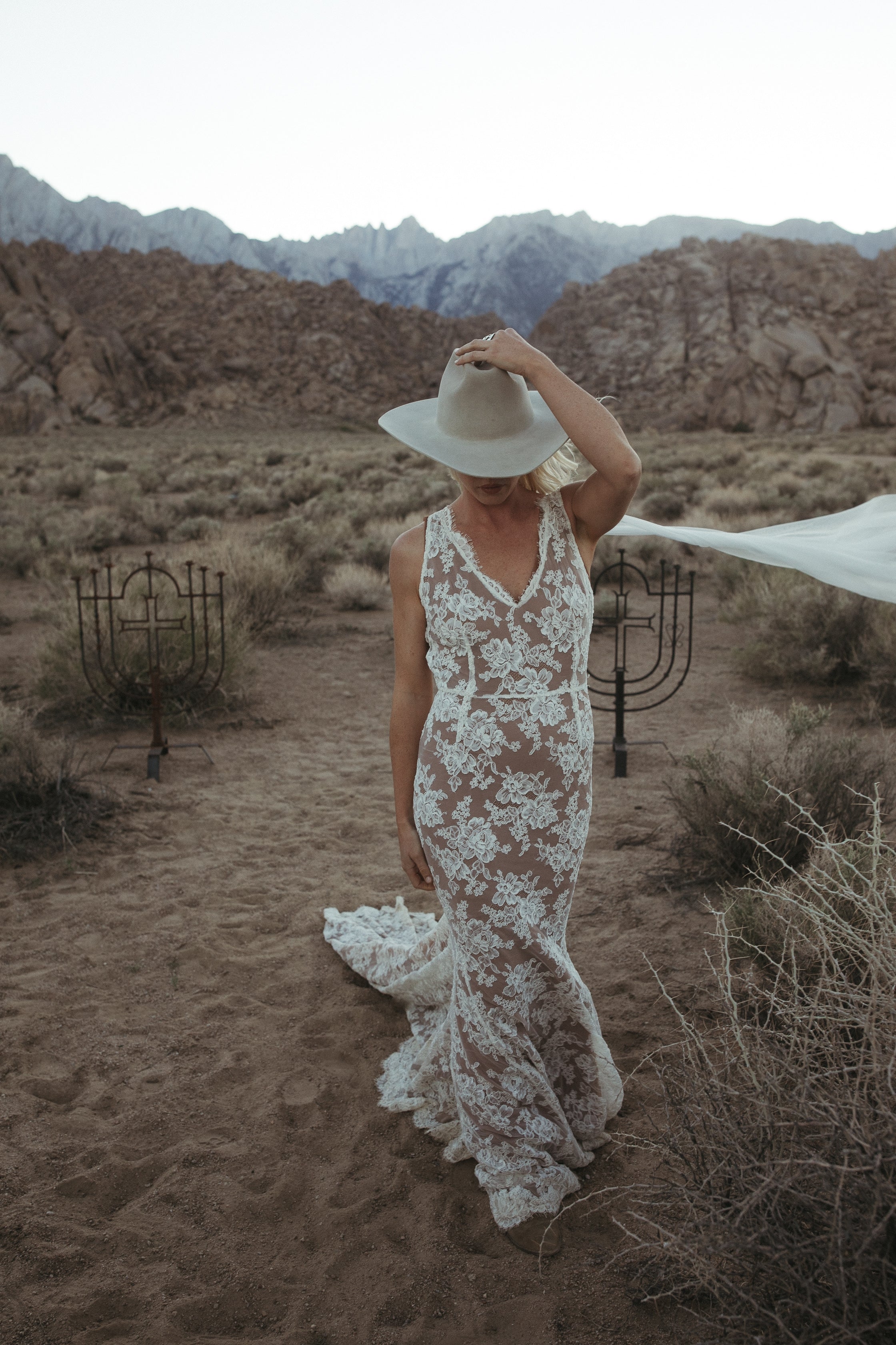ROMANTIC FRENCH CORDED LACE GOWN, DEEP V-NECKLINE WITH SEAM AT WAIST. FITTED SILHOUETTE, DELICATE EYELASH TRIM ADORNS THE LOW BACK LACE WEDDING GOWN, FULL SKIRT FLOWS INTO A DRAMATIC FLOOR SWEEPING TRAIN. DETACHABLE TULLE PANELS FLOAT OFF THE SHOULDERS AND DOWN TO THE FLOOR FOR ADDED DRAMATIC FLARE.
