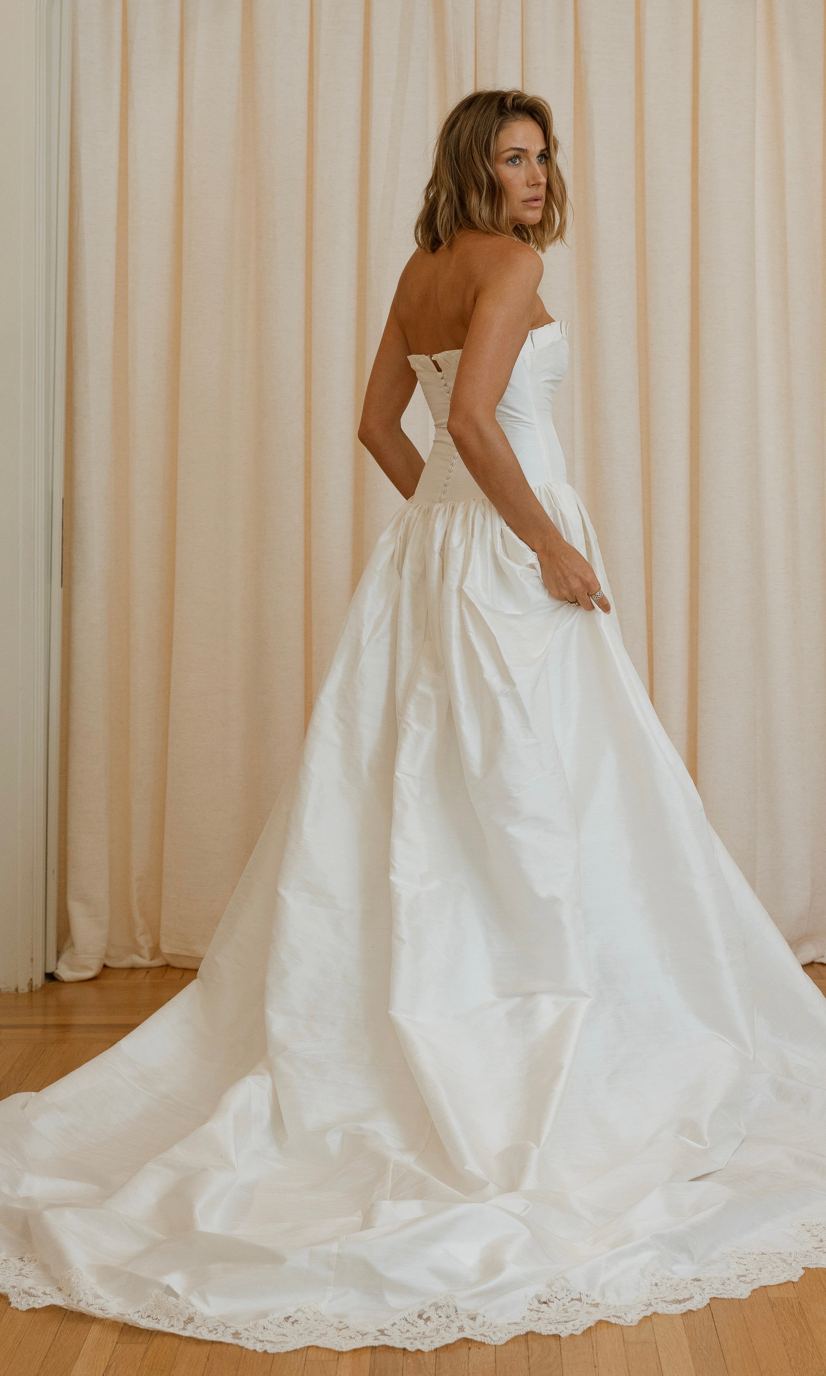 Slub silk drop-waist wedding gown. Box pleat trim lines the bust and back. Exposed French corded lace along bottom hem and throughout train. Silk covered buttons dot the back.