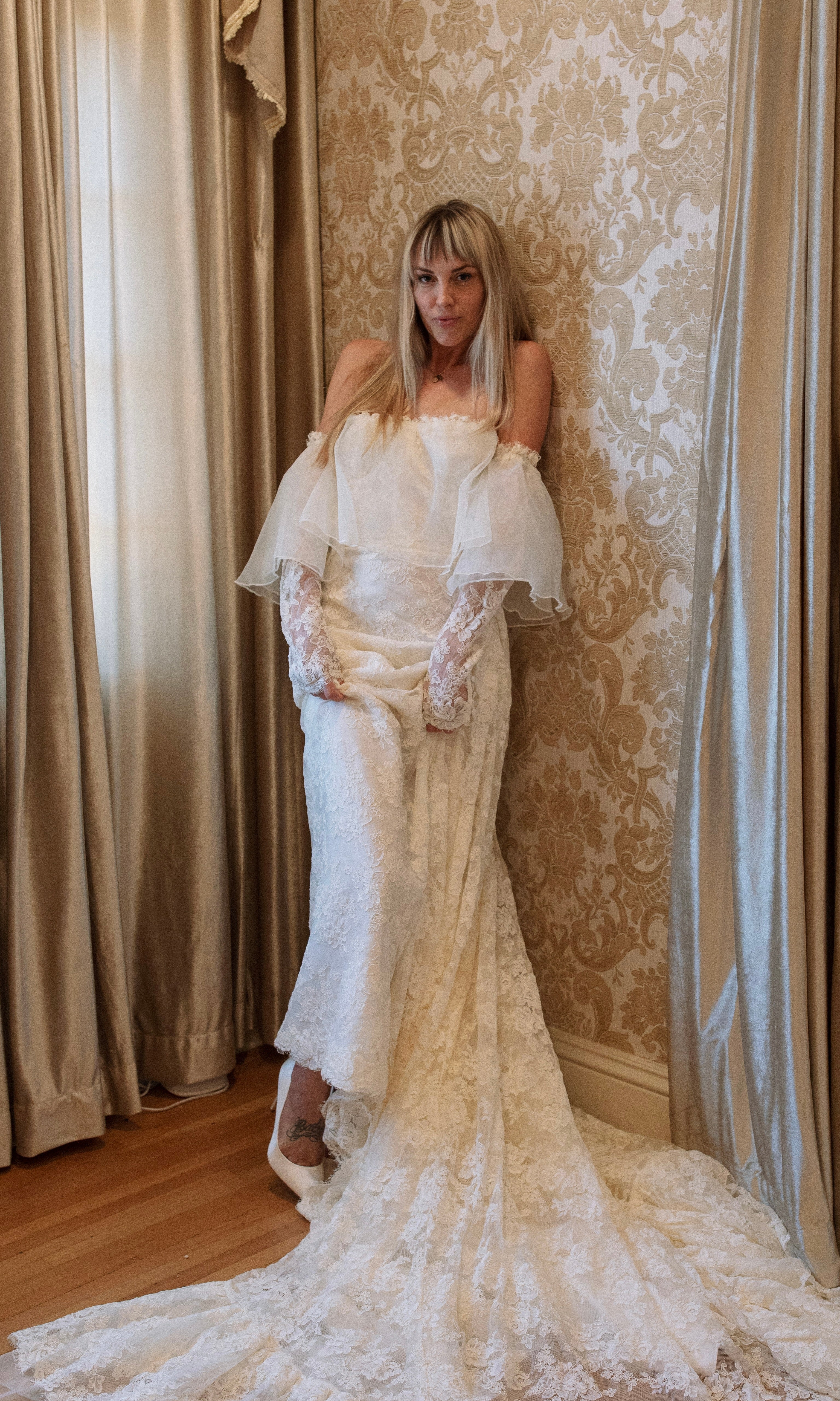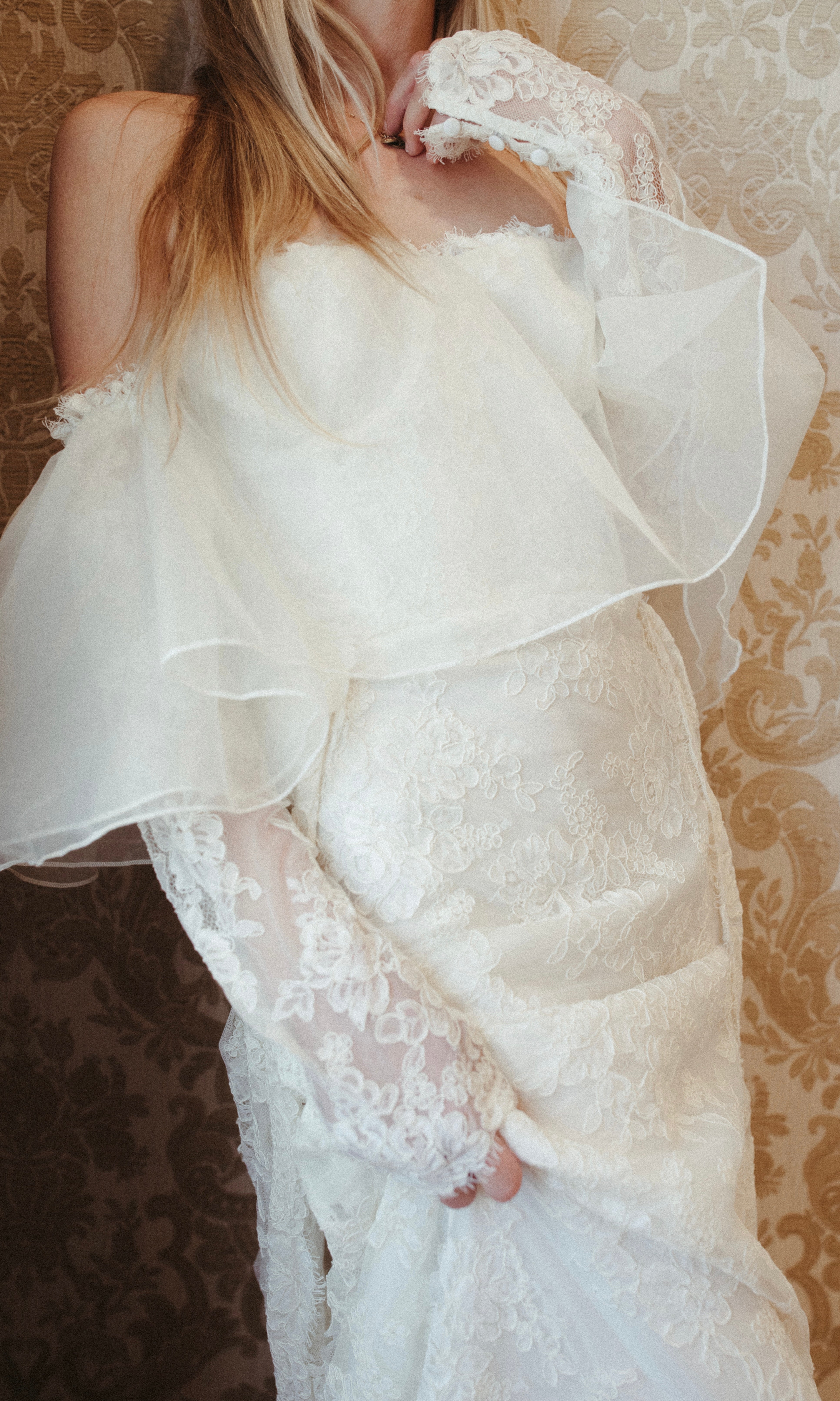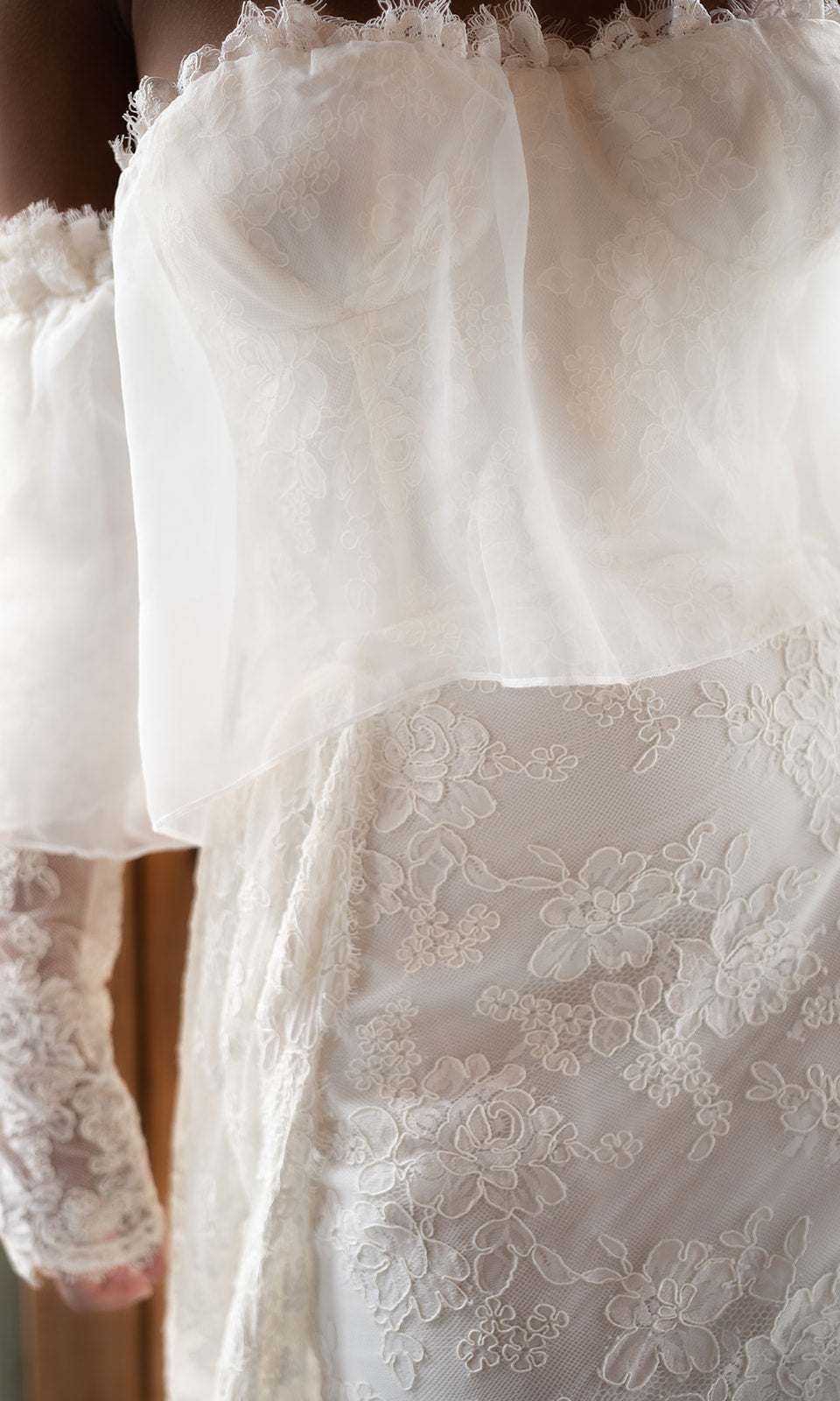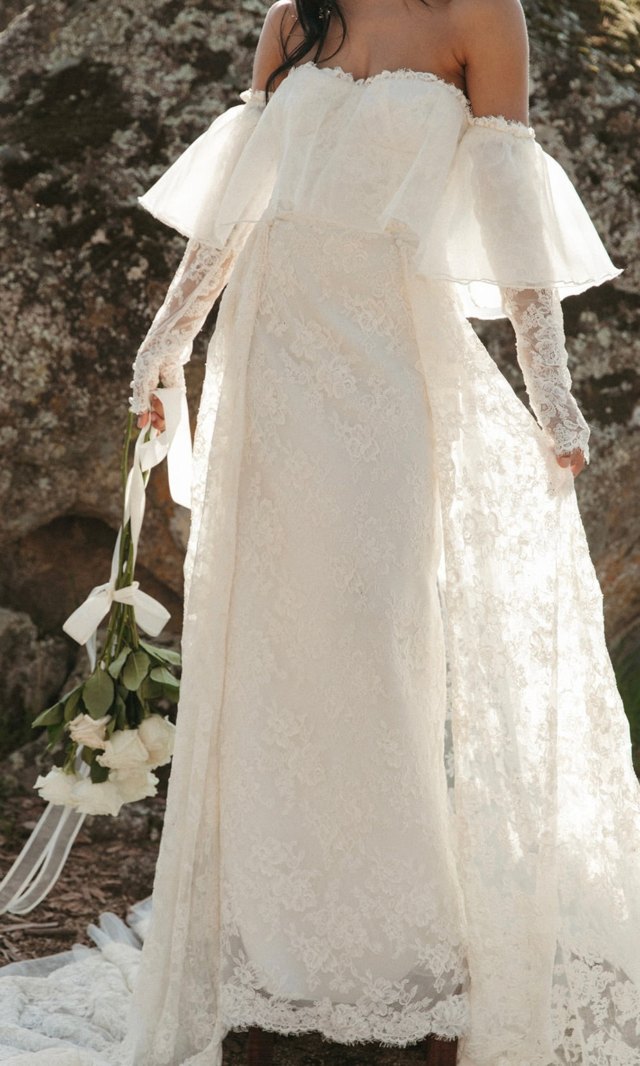 The Emmaline is a statement piece crafted with french corded lace. The off the shoulder, long sleeve silhouette ,features an overlay of organza. Add one of our two detachable skirt choices “Lindy” or “Elders” to complete the dramatic look.