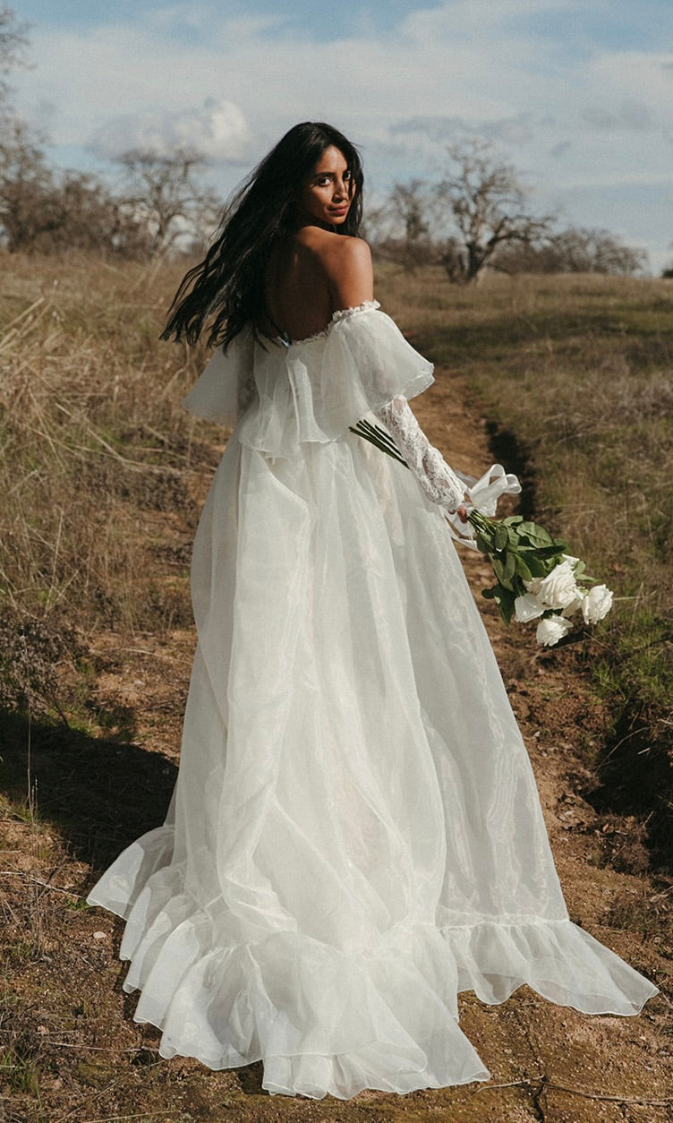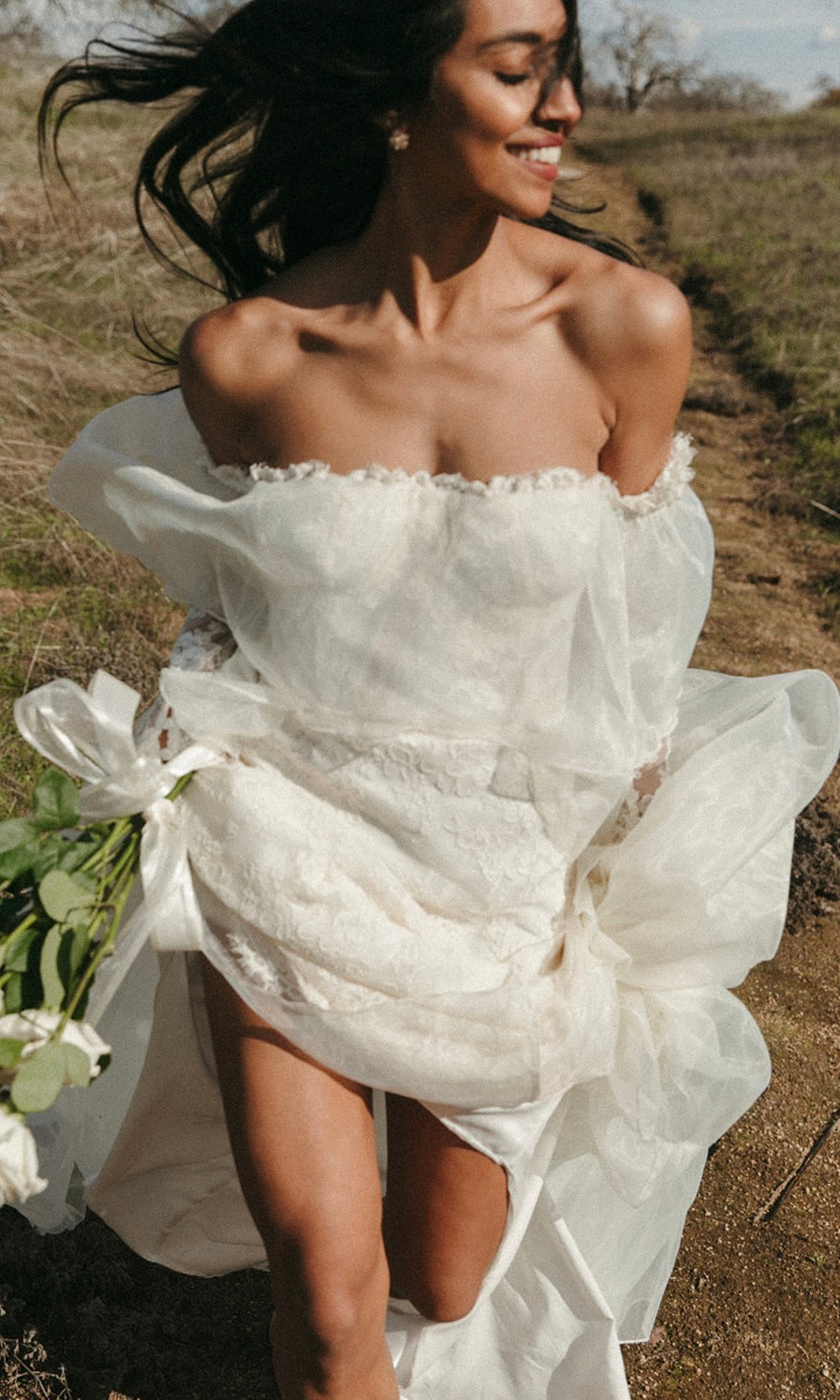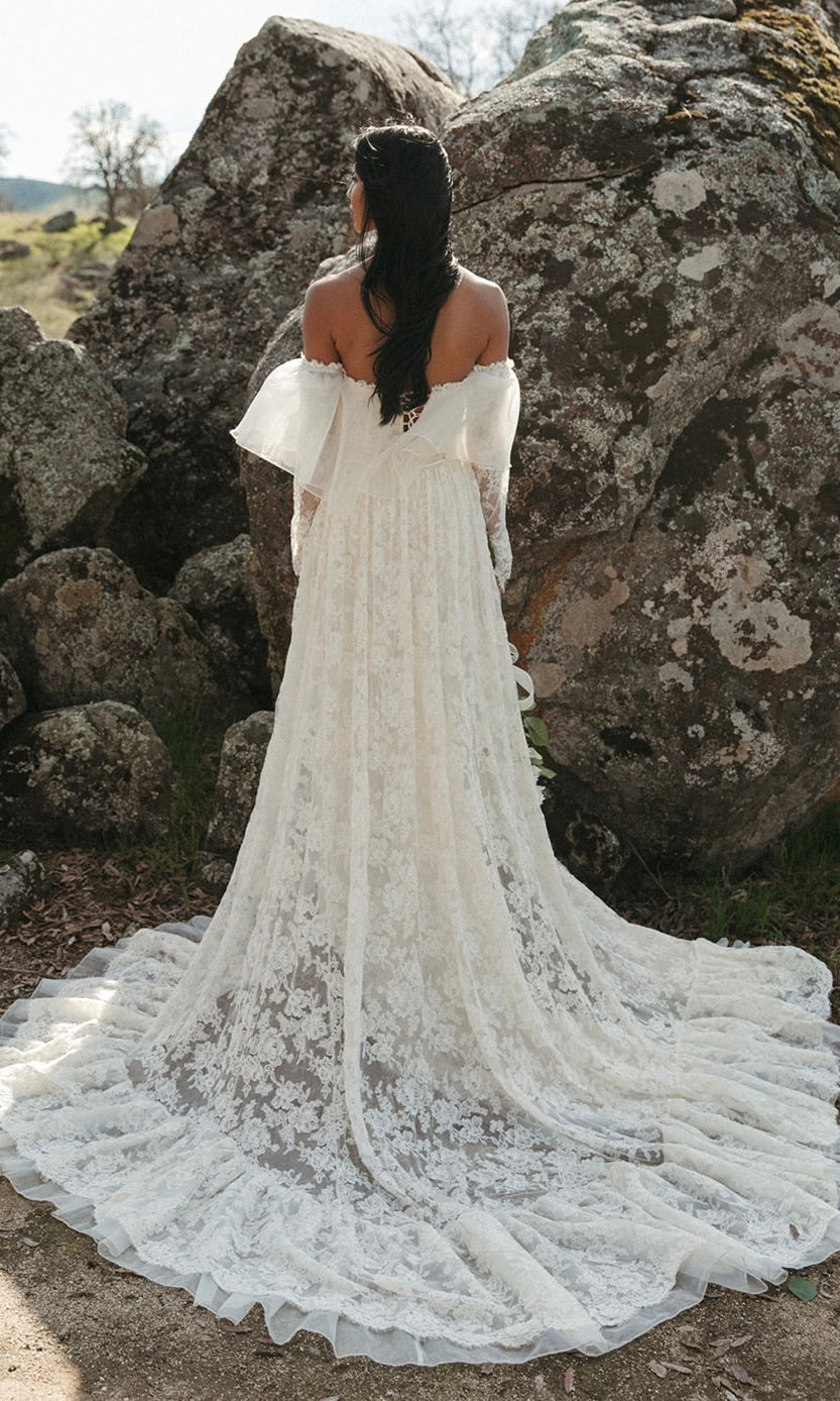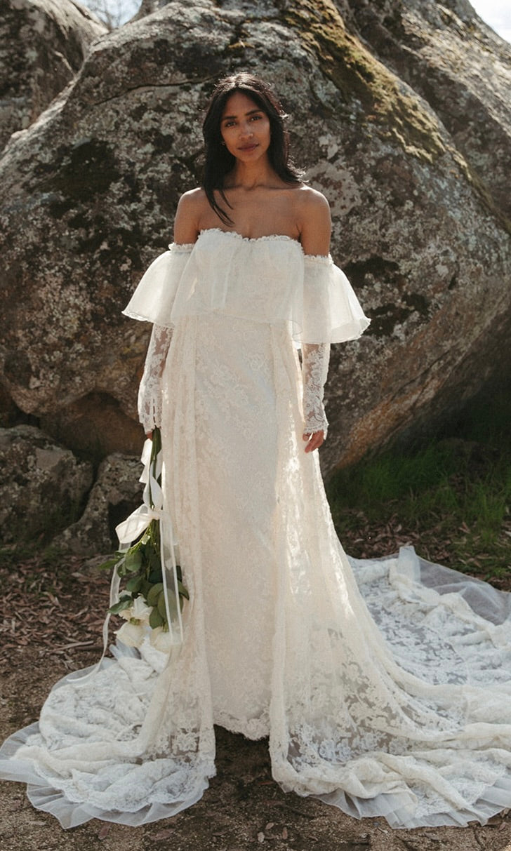 The Emmaline is a statement piece crafted with french corded lace. The off the shoulder, long sleeve silhouette ,features an overlay of organza. Add one of our two detachable skirt choices “Lindy” or “Elders” to complete the dramatic look.