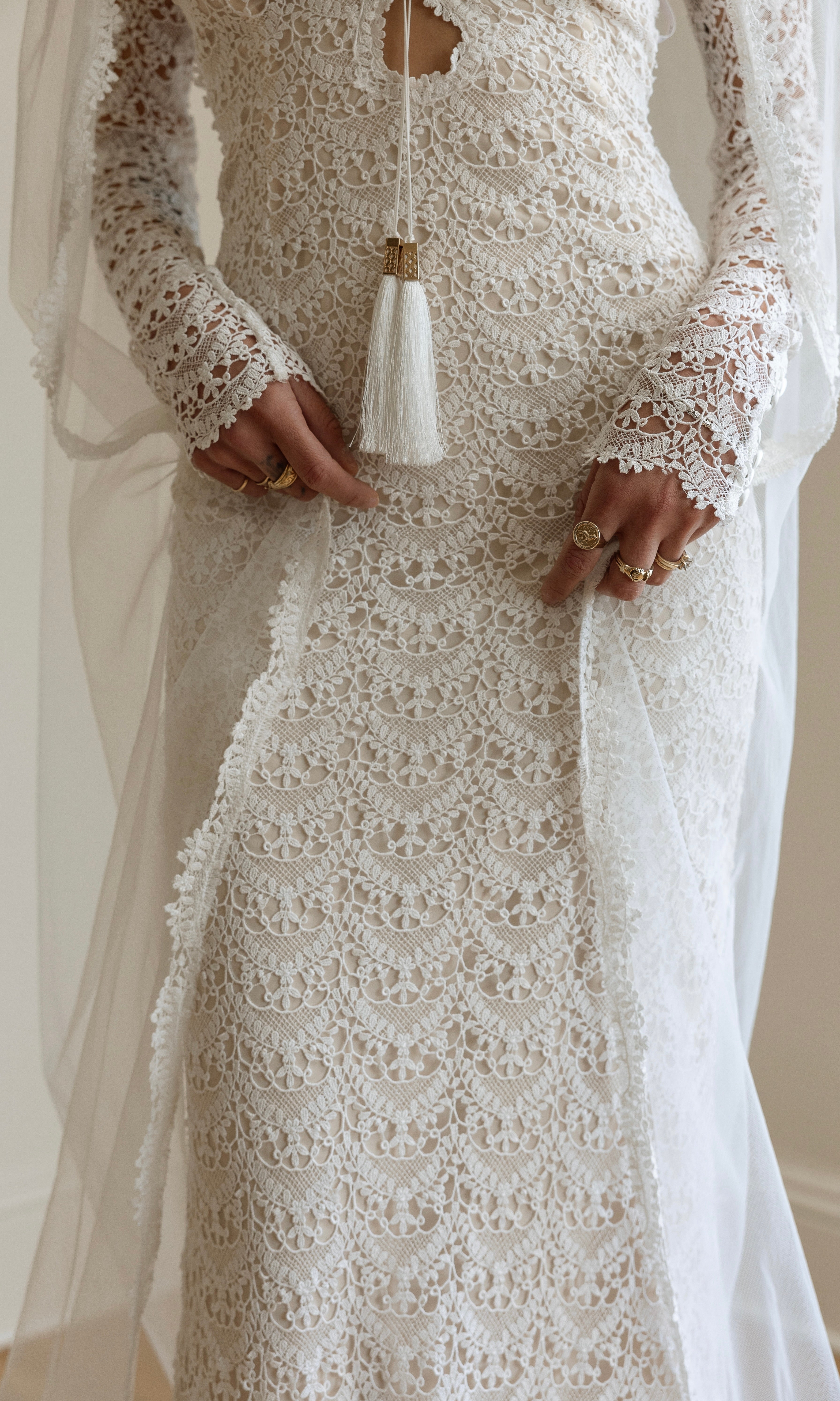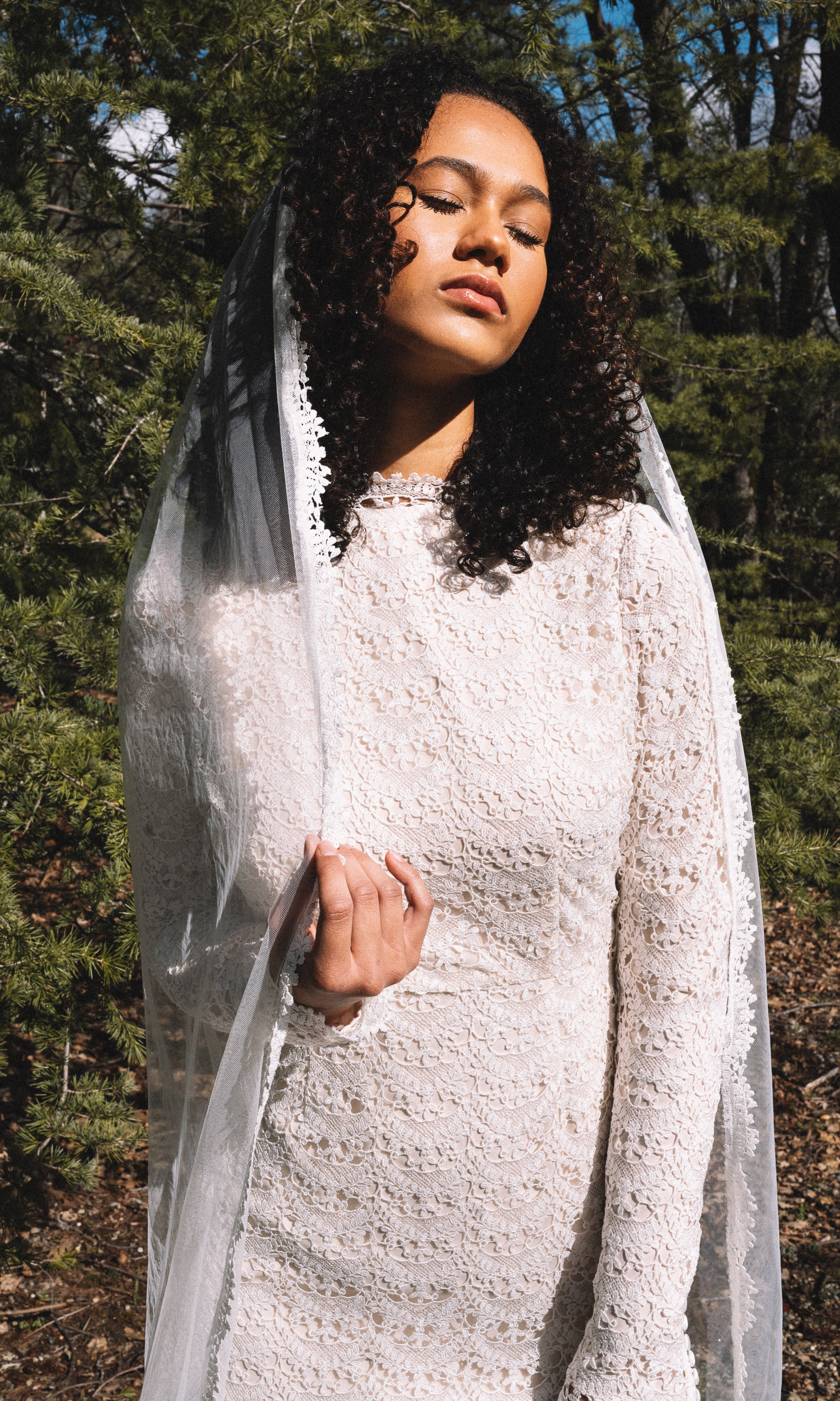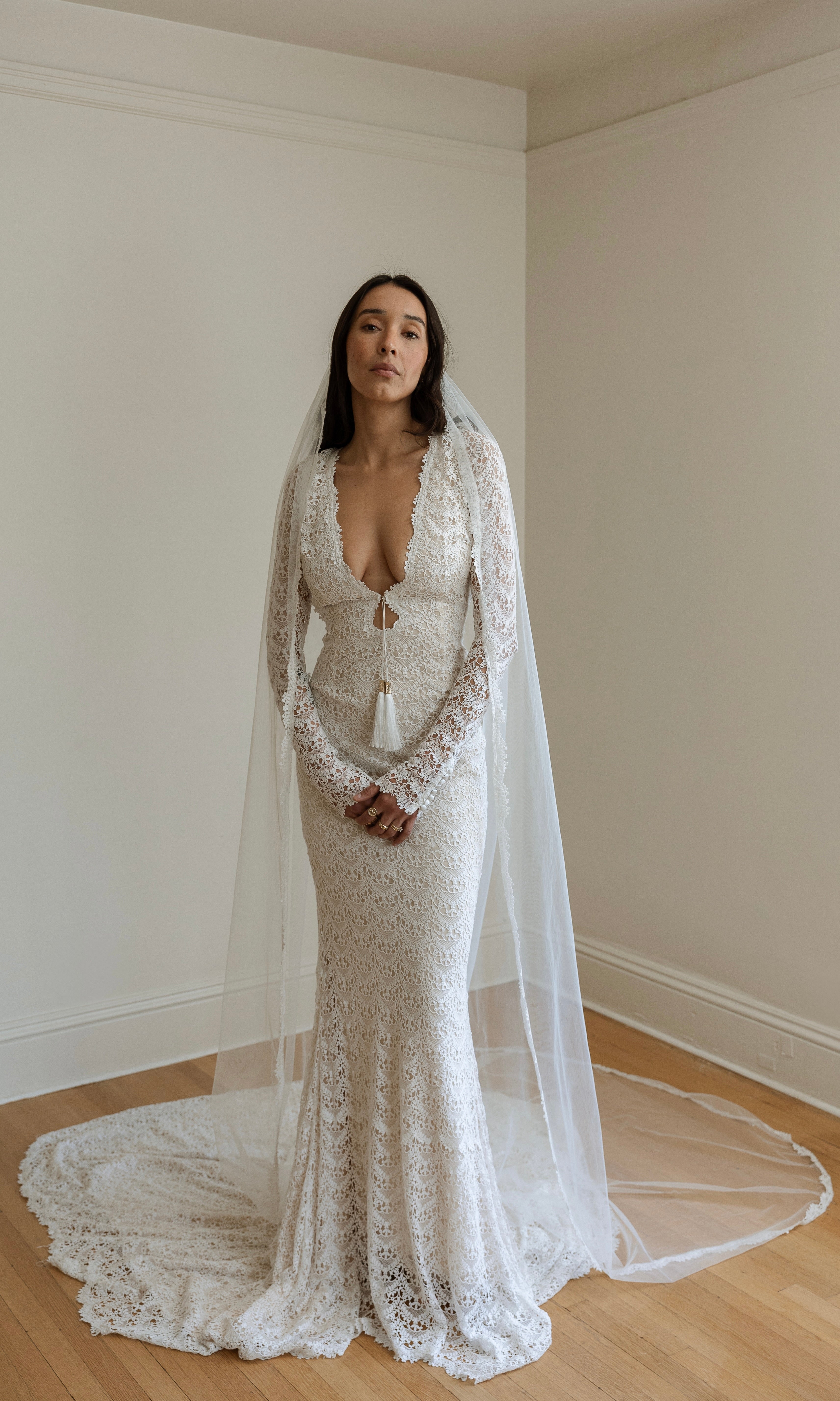 Soft ivory chiffon veil trimmed with our one-of-a-kind guipure lace. Now available in fingertip length (42") and cathedral length (108")