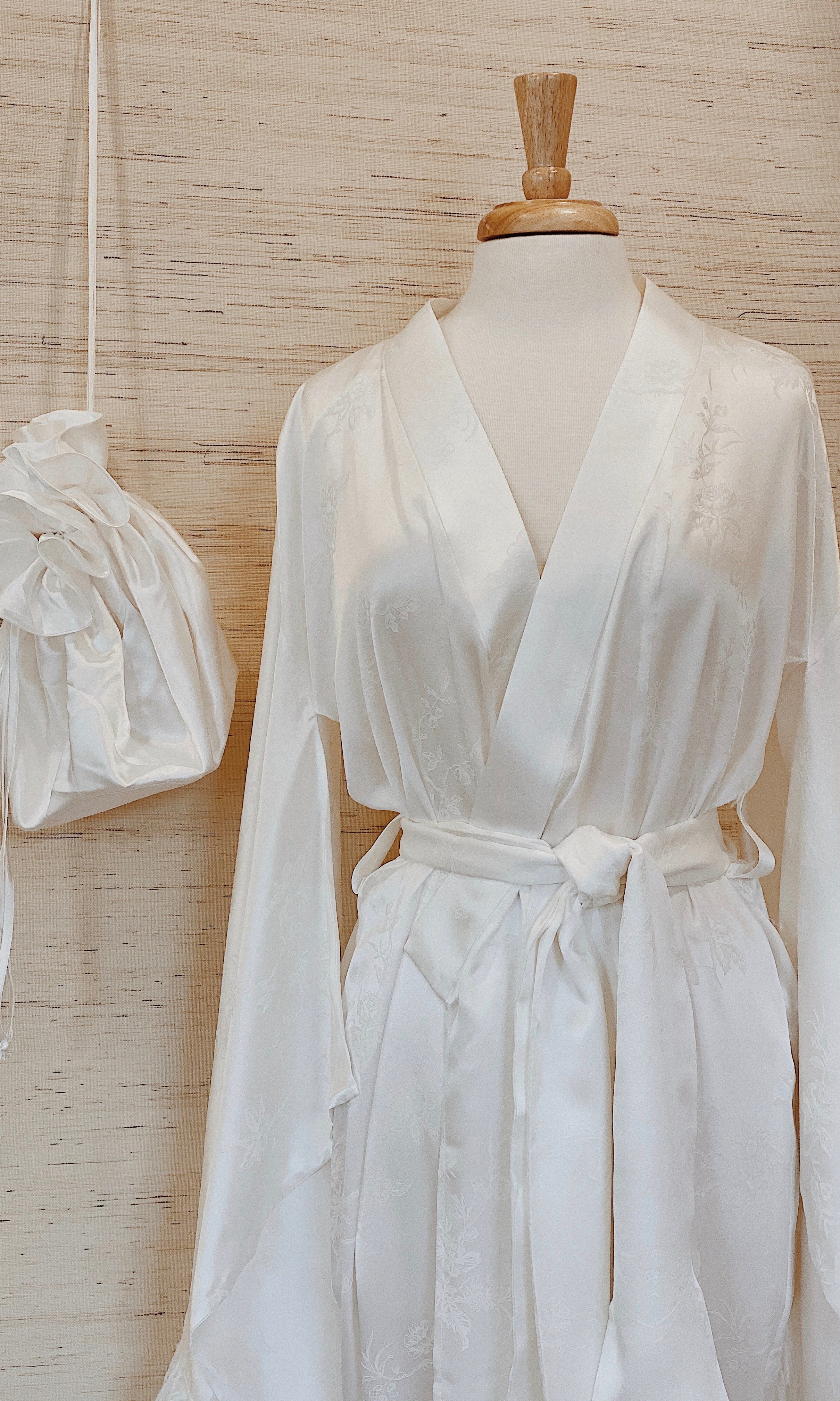 The “Lana” is a lux bridal kimono made of soft ivory satin jacquard with unique floral print, inspired by the powder women of the 1930’s who fulfill all of our “getting ready” dreams. open sleeves are adorned with playful ostrich feathers. The kimono is completed with a slight, ever subtle, train. Each piece also includes a rich satin travel pouch to transport in for the big day. Orders have a 5 week turn around time from order to ship
