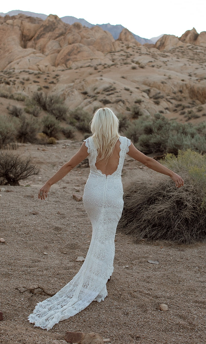 Vintage inspired crochet lace wedding dress, the “Lilah”. Made of 100% ivory cotton crochet lace. The front has a high neckline gliding just past the collarbones. Cap sleeves are left unlined to contrast with a hint of skin. Silhouette is fitted throughout the bodice and flares just above the knee into a cascading crochet train. Low back lined with a crochet lace scalloped trim. Hidden zip and clasp are located under the exposed back for ease of dressing. Lined with a matte satin liner.