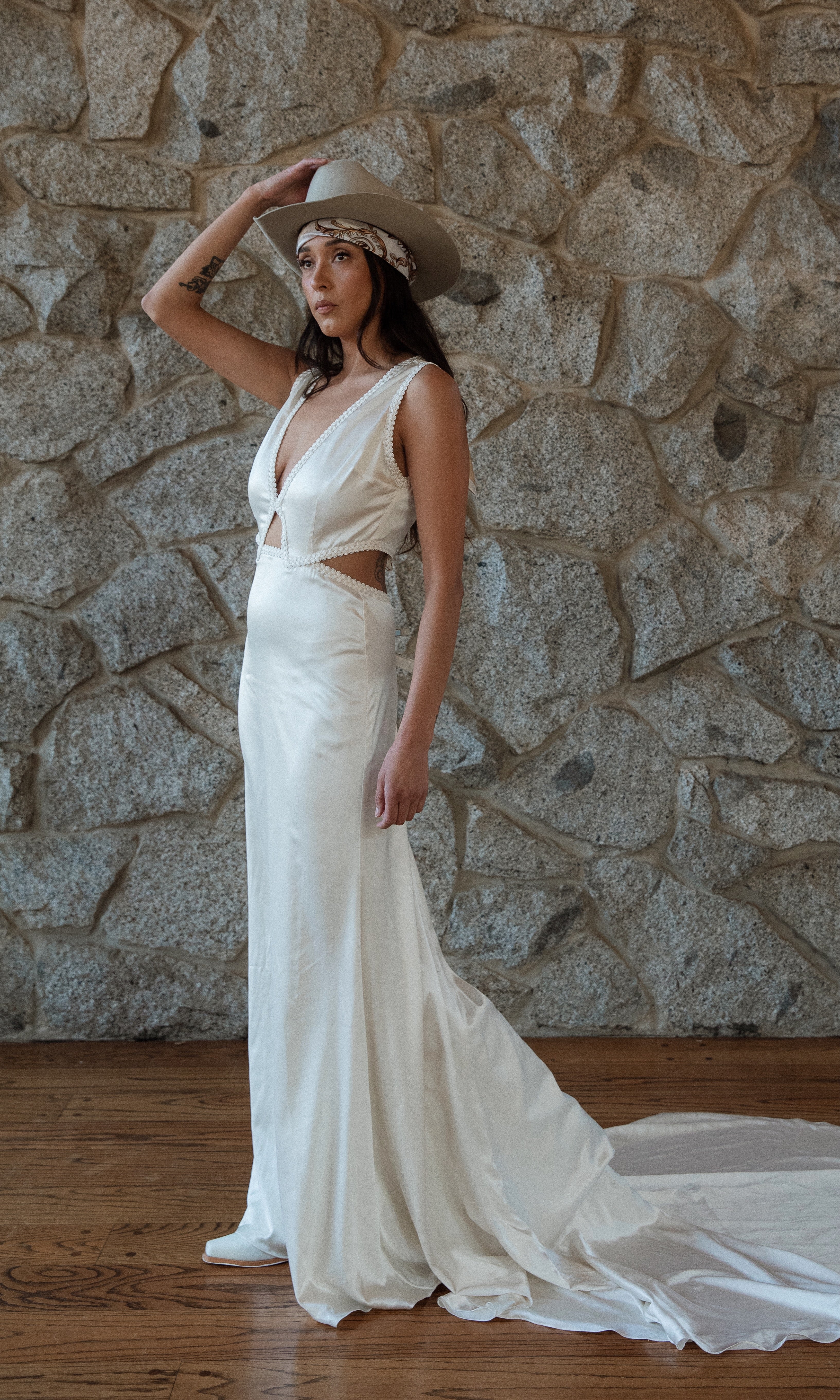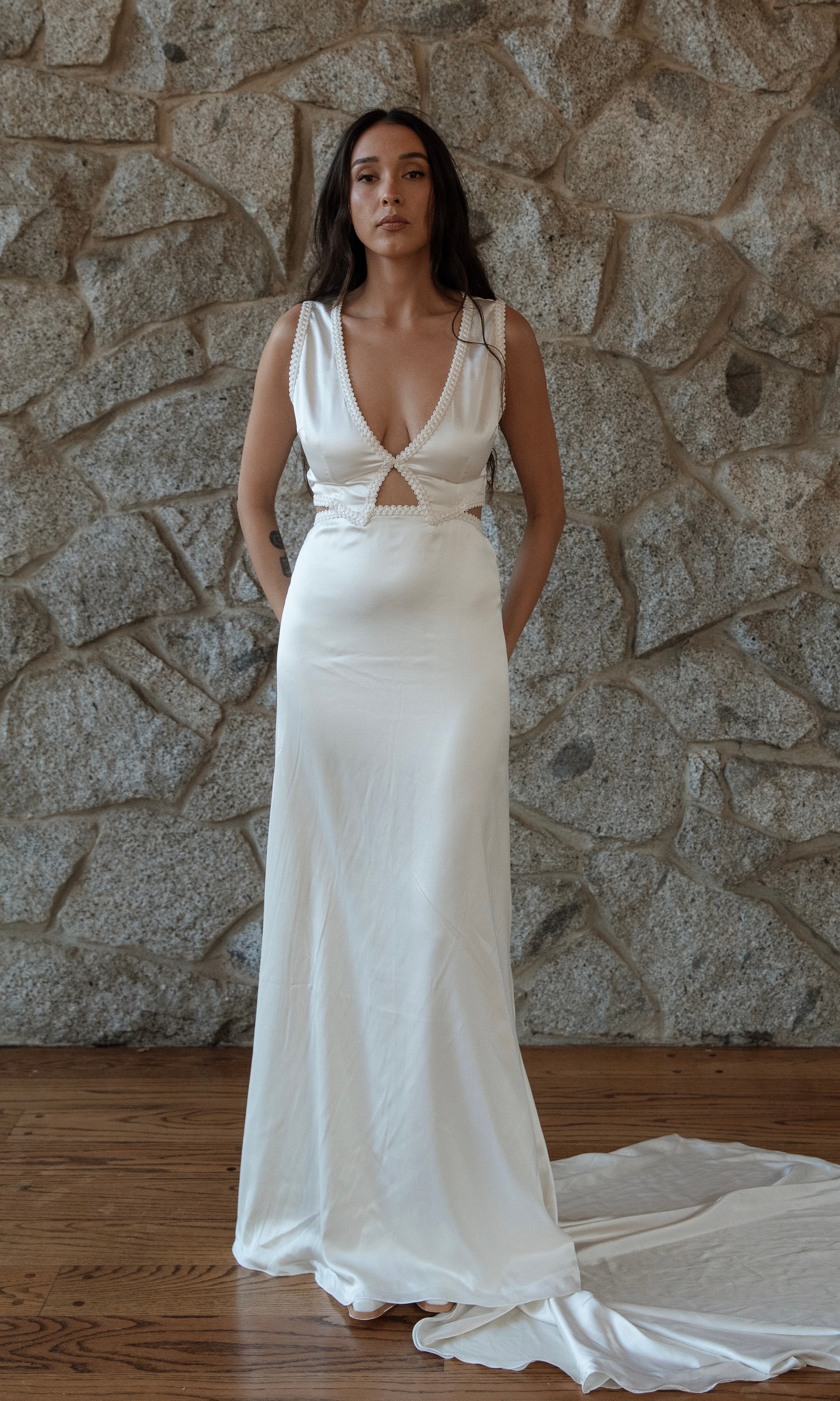IVORY CHARMEUSE SILK GOWN WITH BRAIDED TRIM. LINED WITH SATIN.
