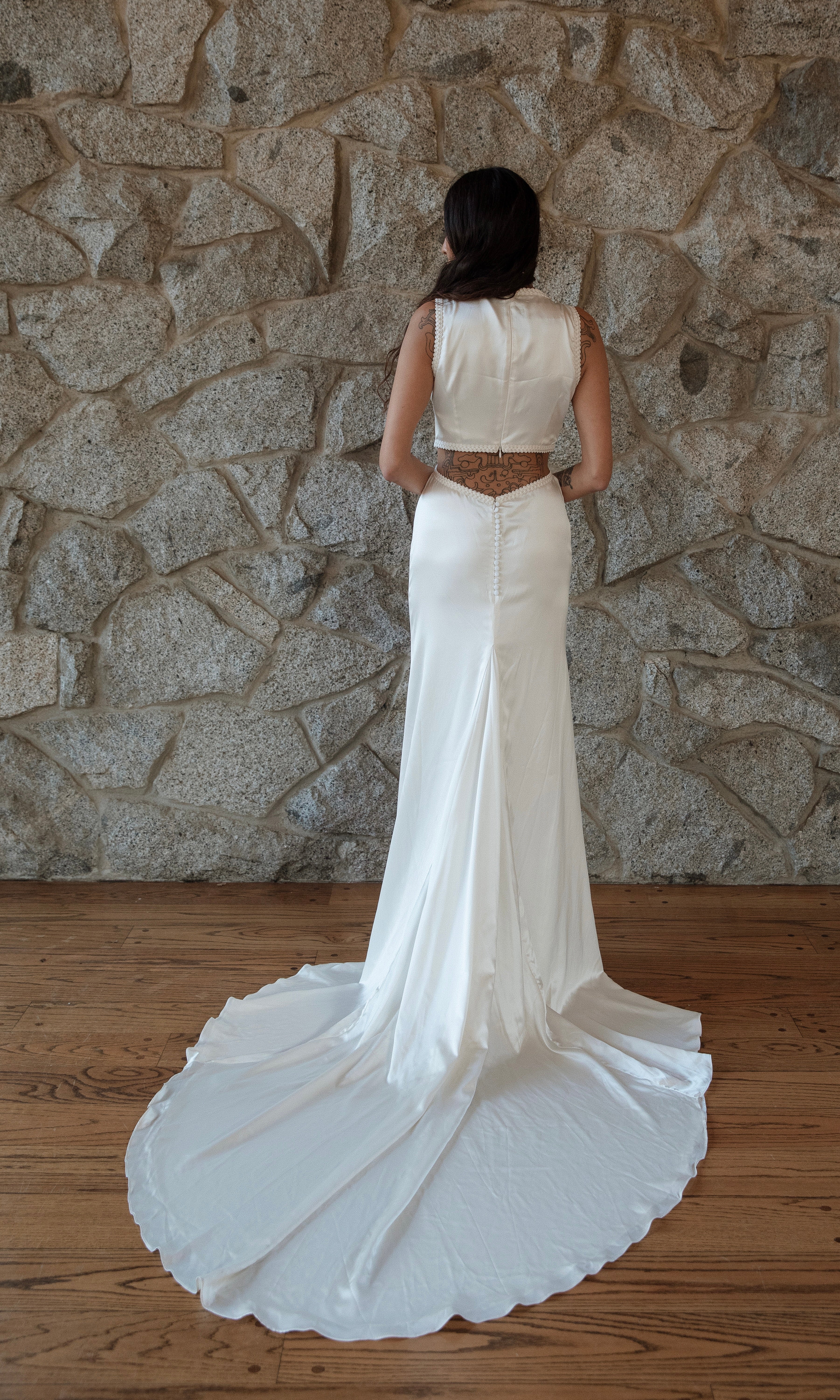 Find out where you can try on our gowns on our retailers and trunk shows pages. If there is not a retailer near you, we’d love to send you the gown to try on at home.