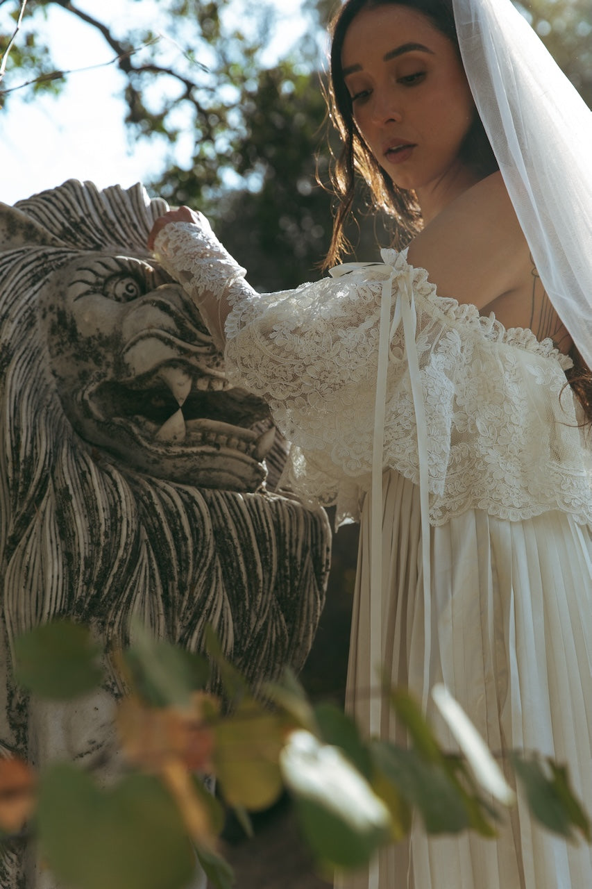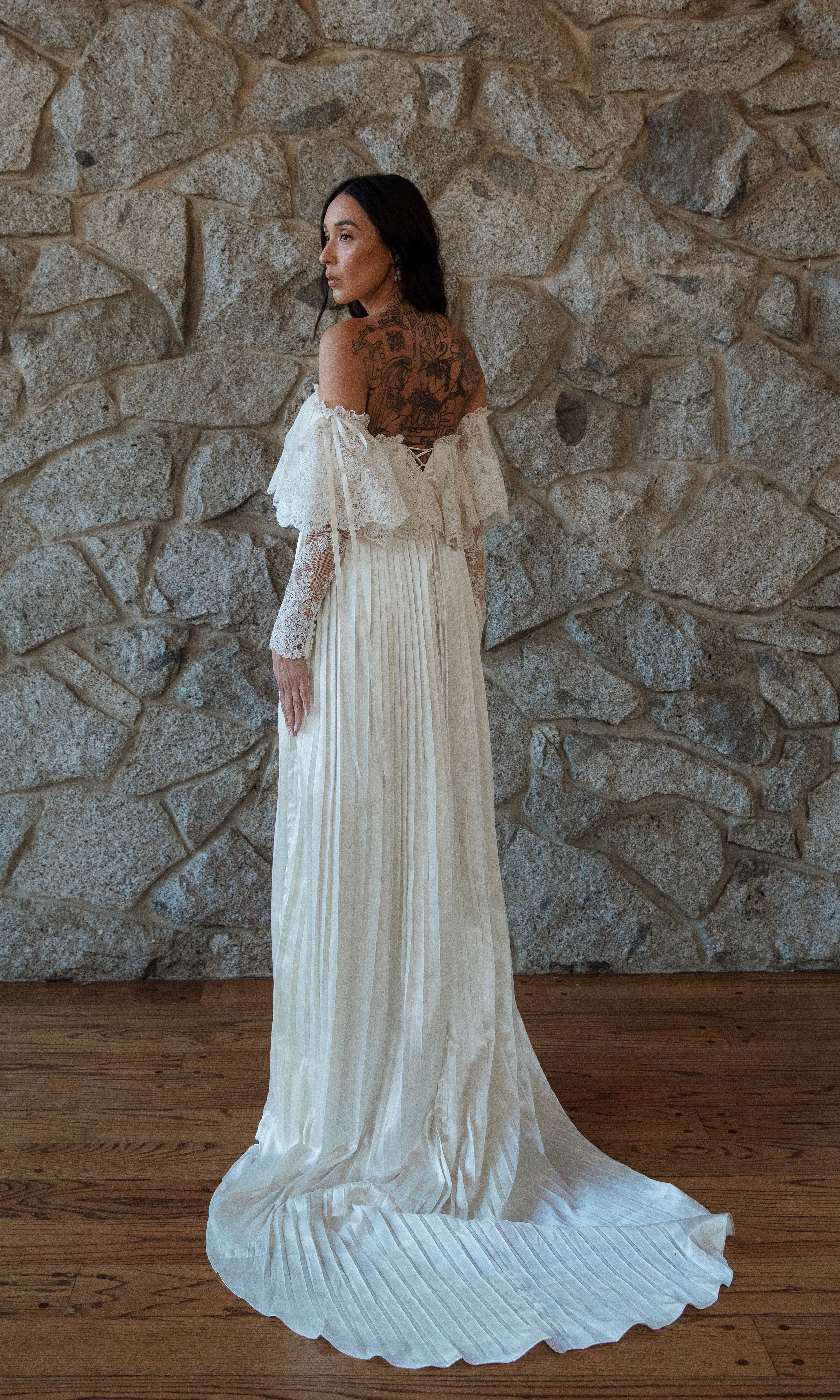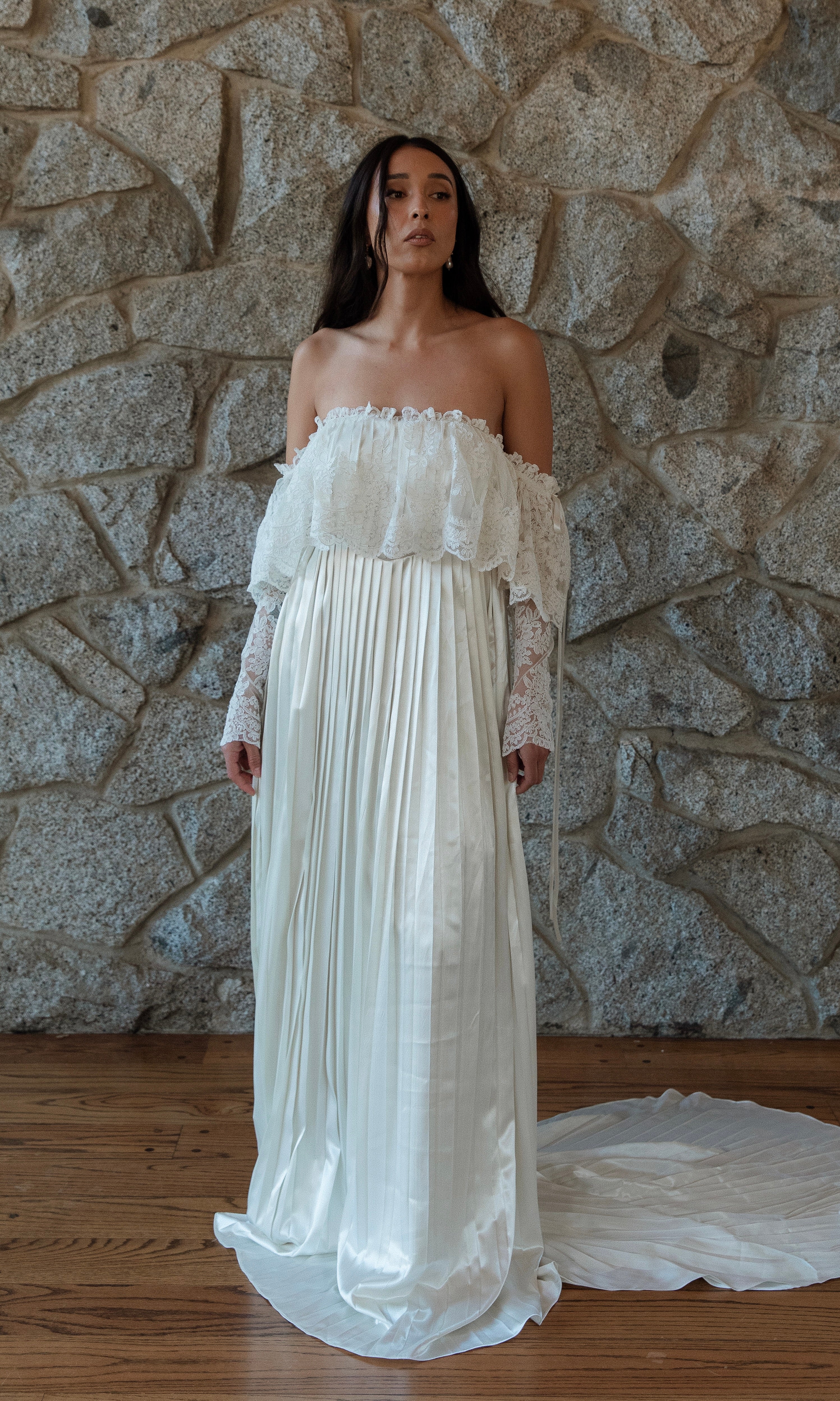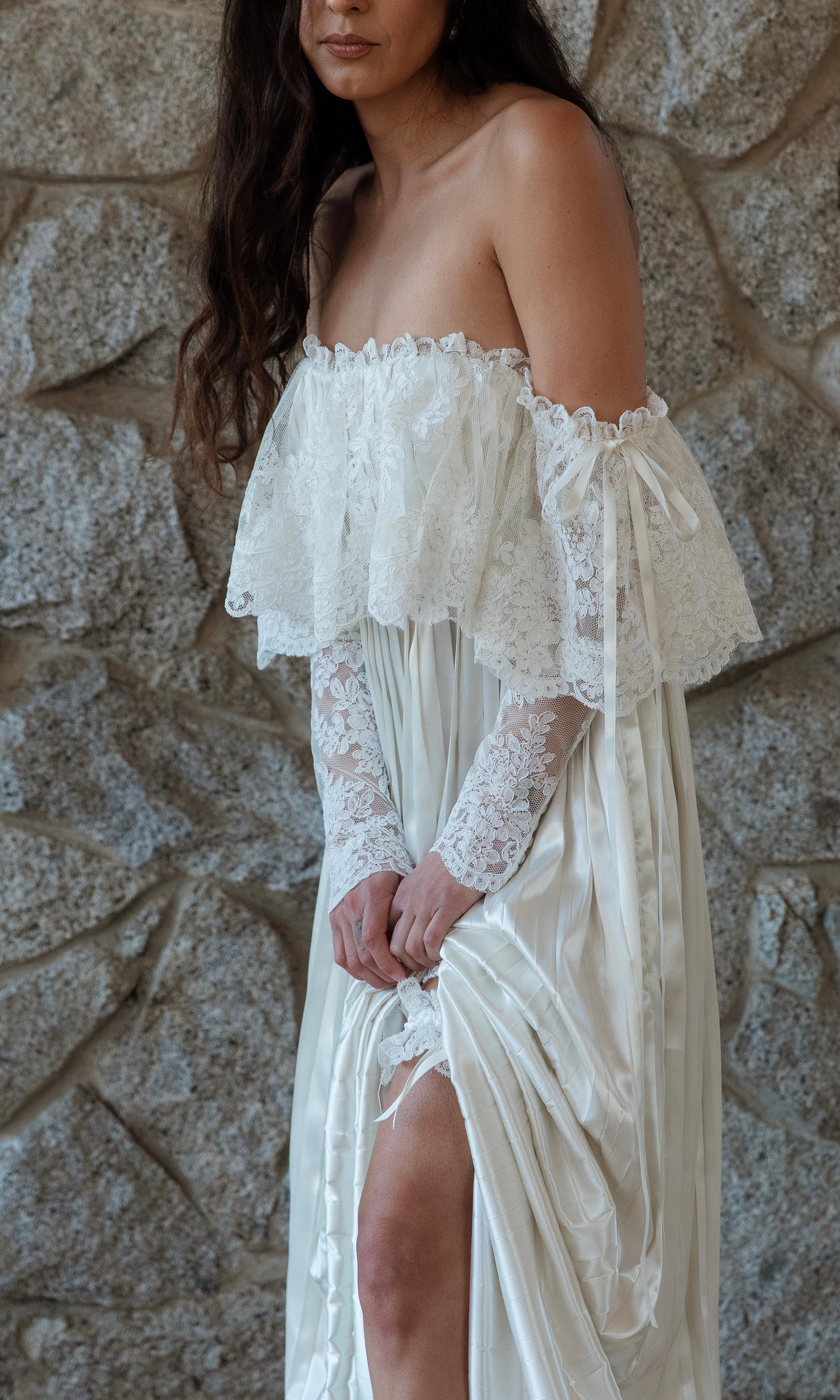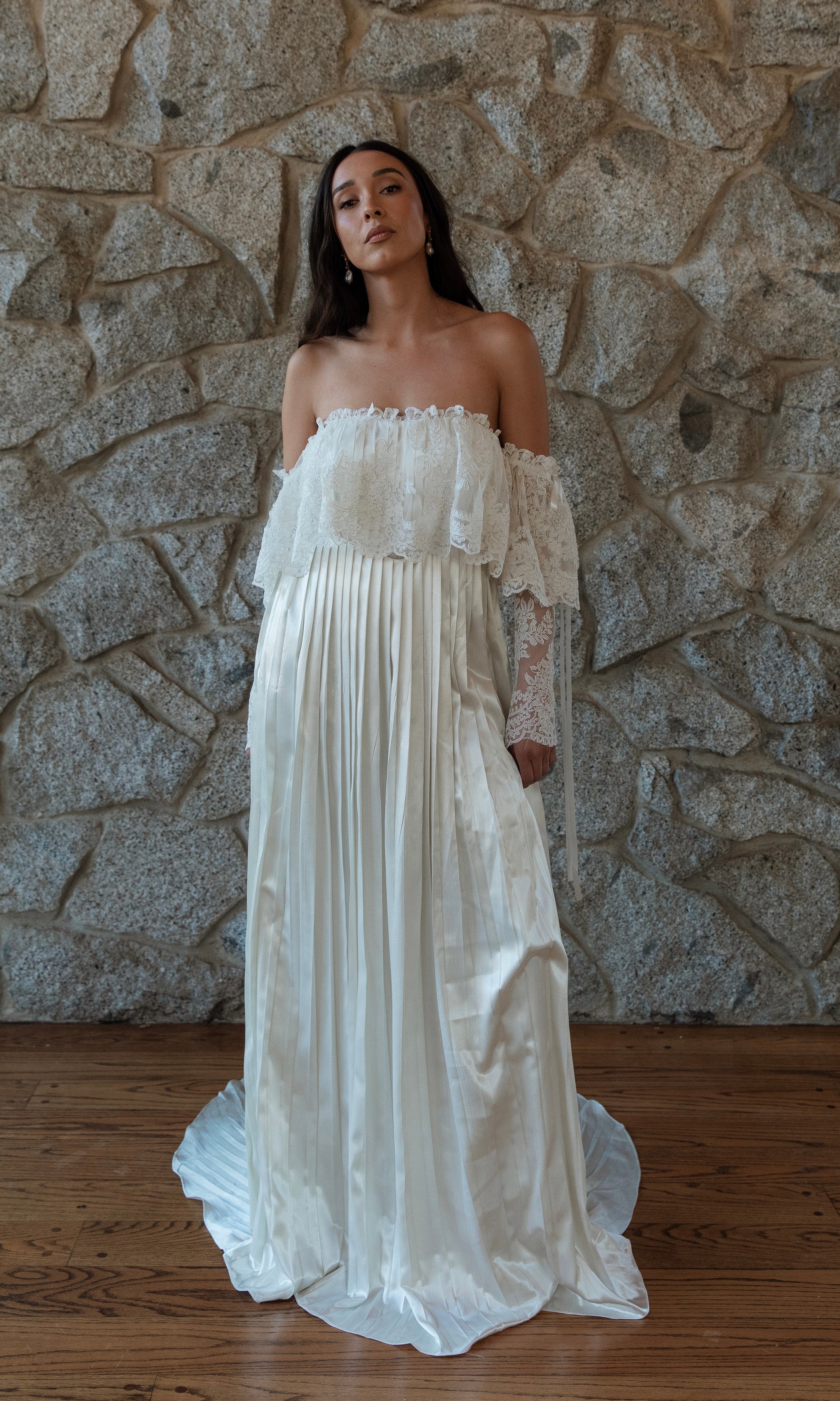 PLEATED SATIN IVORY SKIRT, OFF THE SHOULDER FRENCH CORDED LACE OVERLAY GOWN. TIES AT THE BUST IN THE BACK FOR A PERFECT FIT. SWEEPING TRAIN.